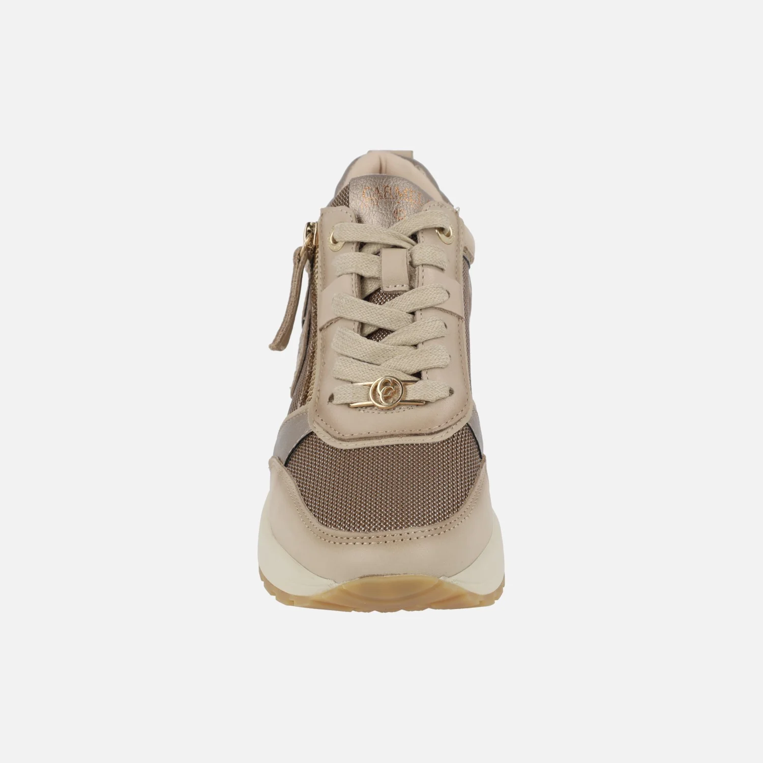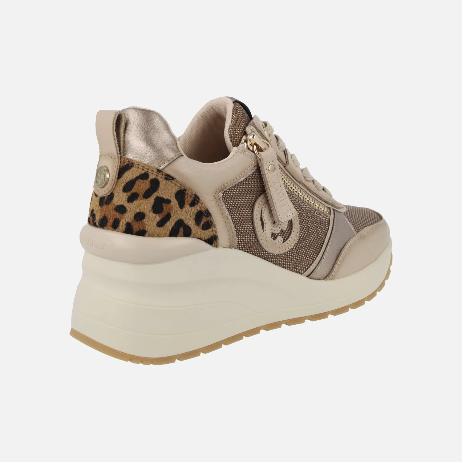Deportivas de cuña alta de la marca Carmela, modelo 162521 Beige. Deportivas elaboradas en combinado de piel y tejido, en distintos tonos de beige con talonera en pelo animal print leopardo. Cierre de cordones textiles y además cremallera en el lado exterior. Interior textil con plantillas extraíbles forradas de piel. Piso sintético, con cuña de 6,5 cm de altura (2 cm parte delantera).