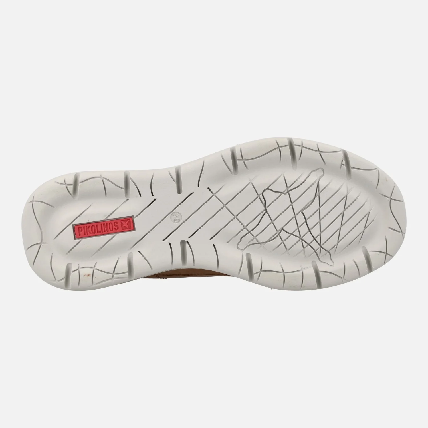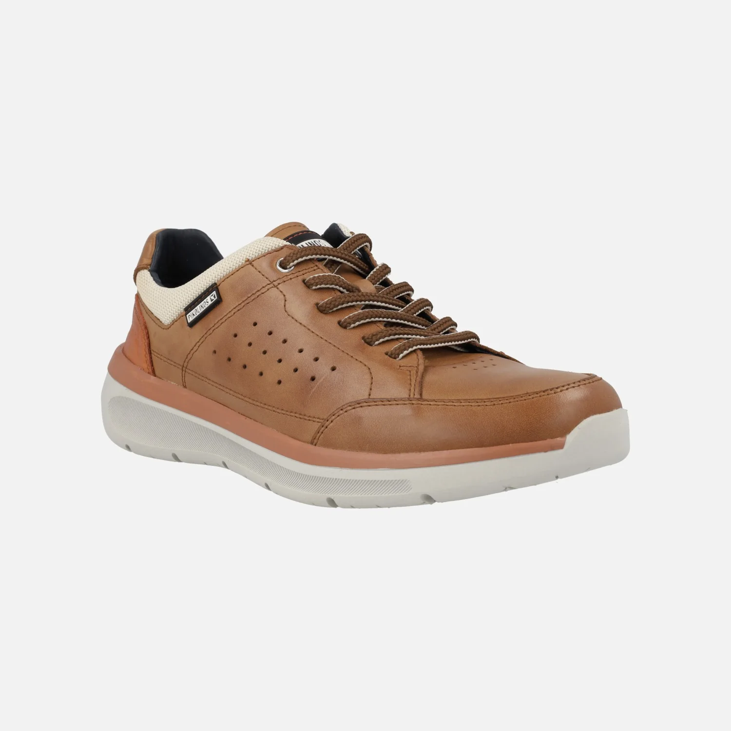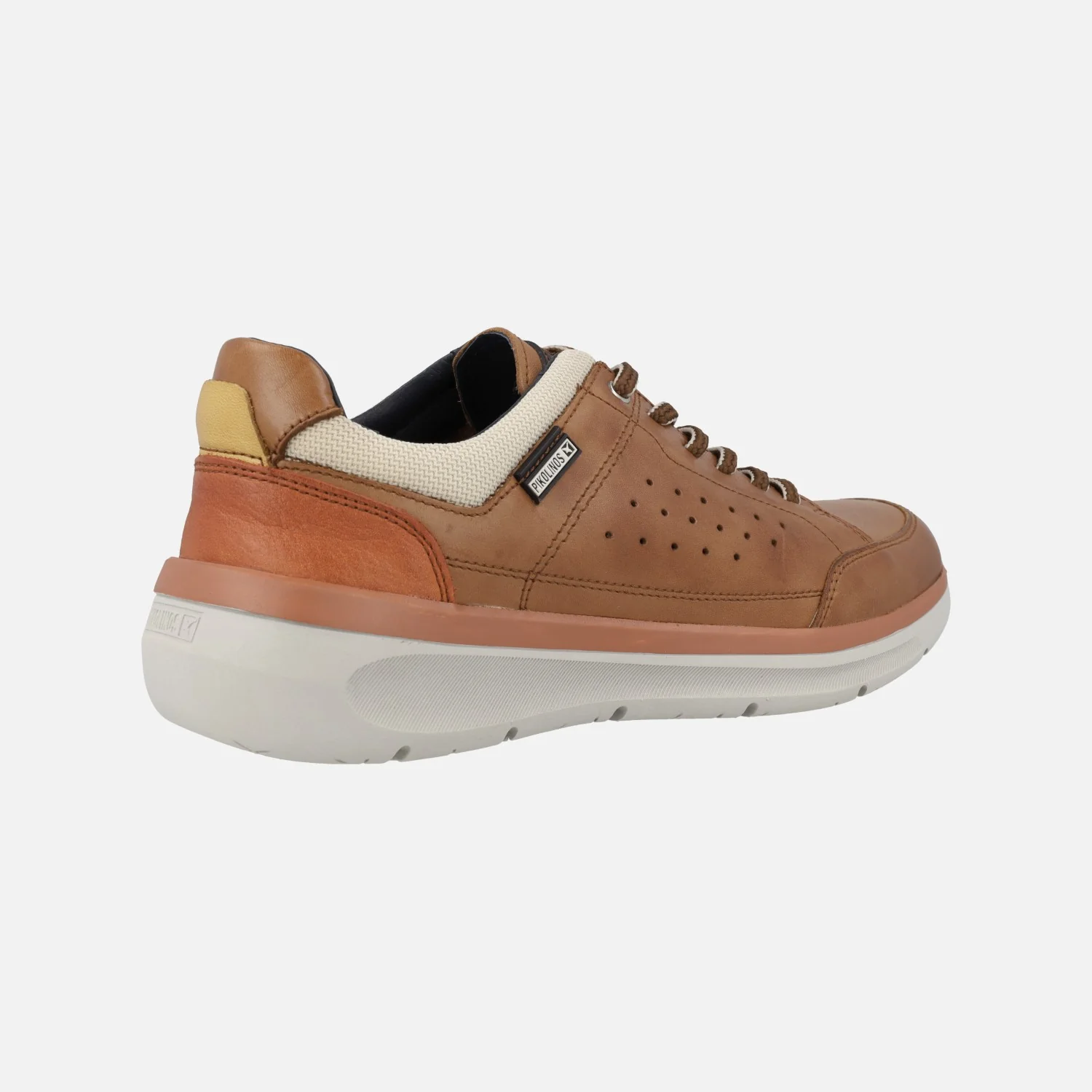 Zapatos deportivos para hombre de la marca Pikolinos, modelo Biar M6V-6105 Brandy. Deportivos de piel color cuero con detalle de agujeritos en los laterales. Cierre de cordones. Collarín beige acolchado. Detalle de color en la talonera, en naranja y amarillo. Interior mixto: textil/cuero/otros materiales. Plantillas extraíbles, acolchadas y con Arch support. Suela extra ligera de goma