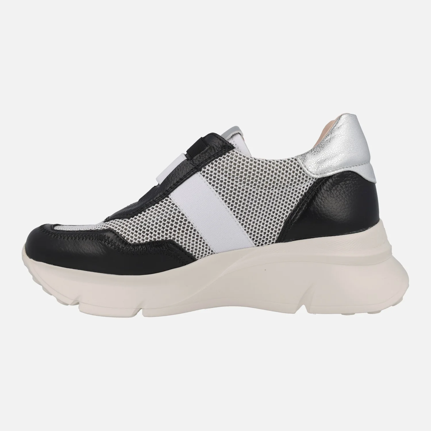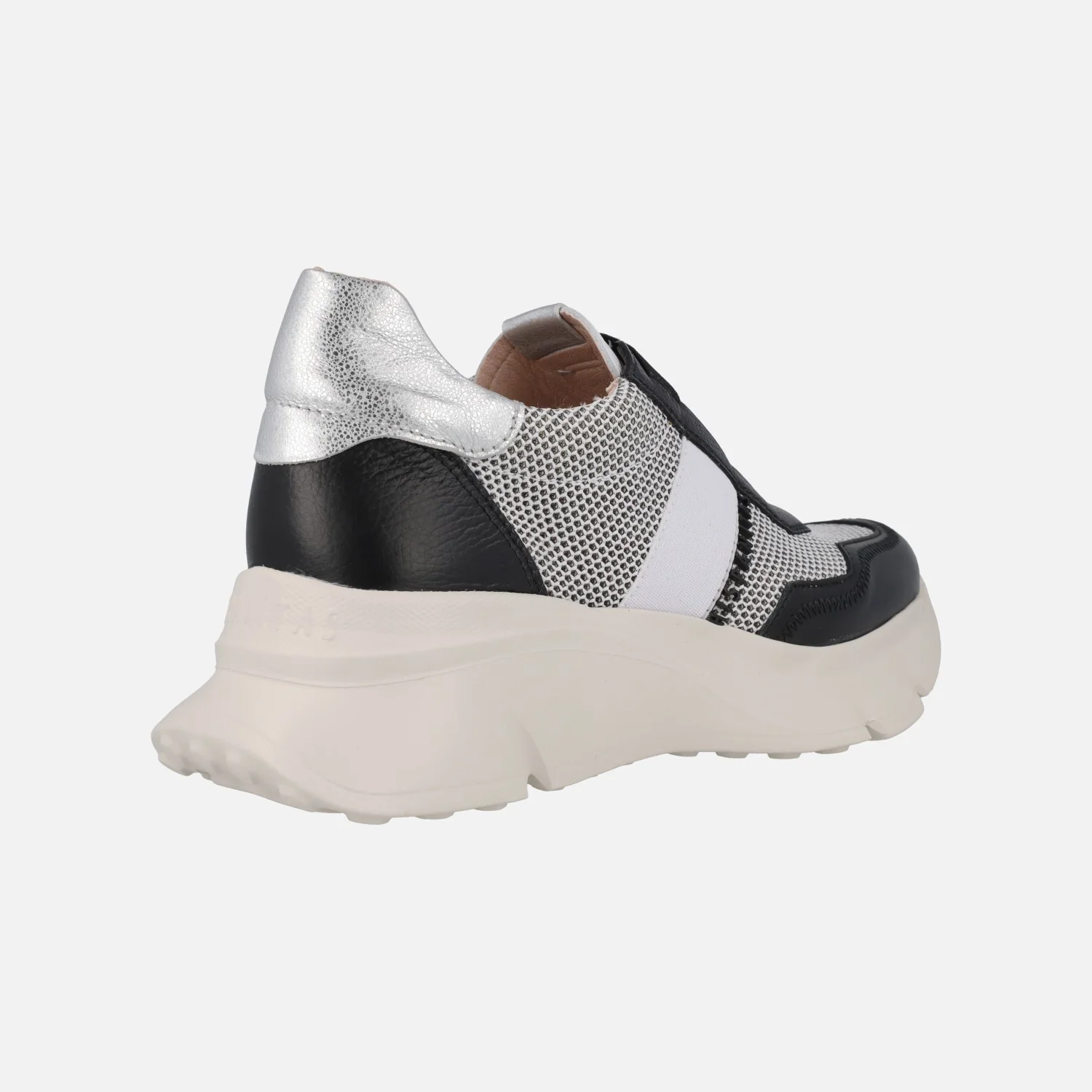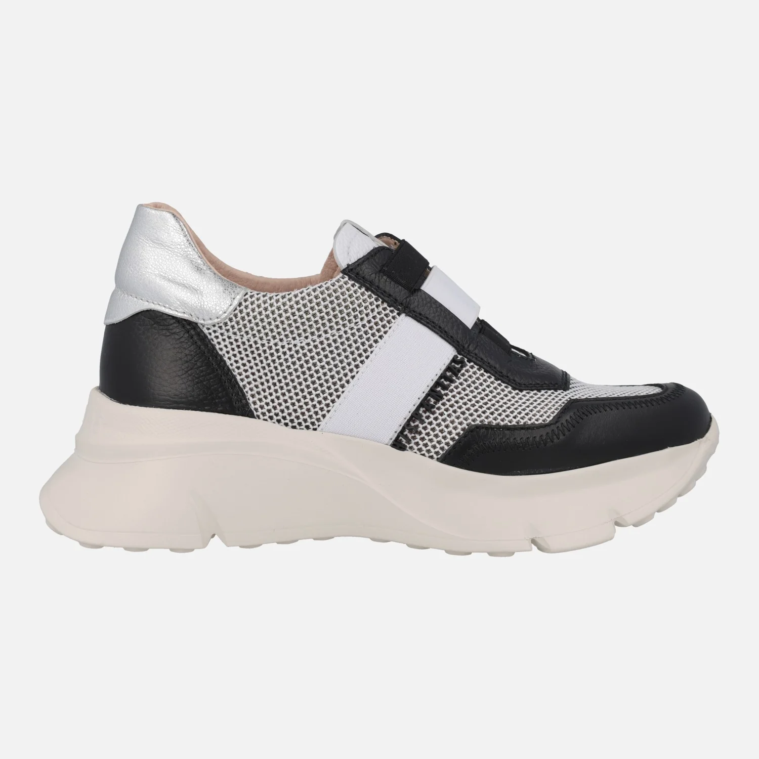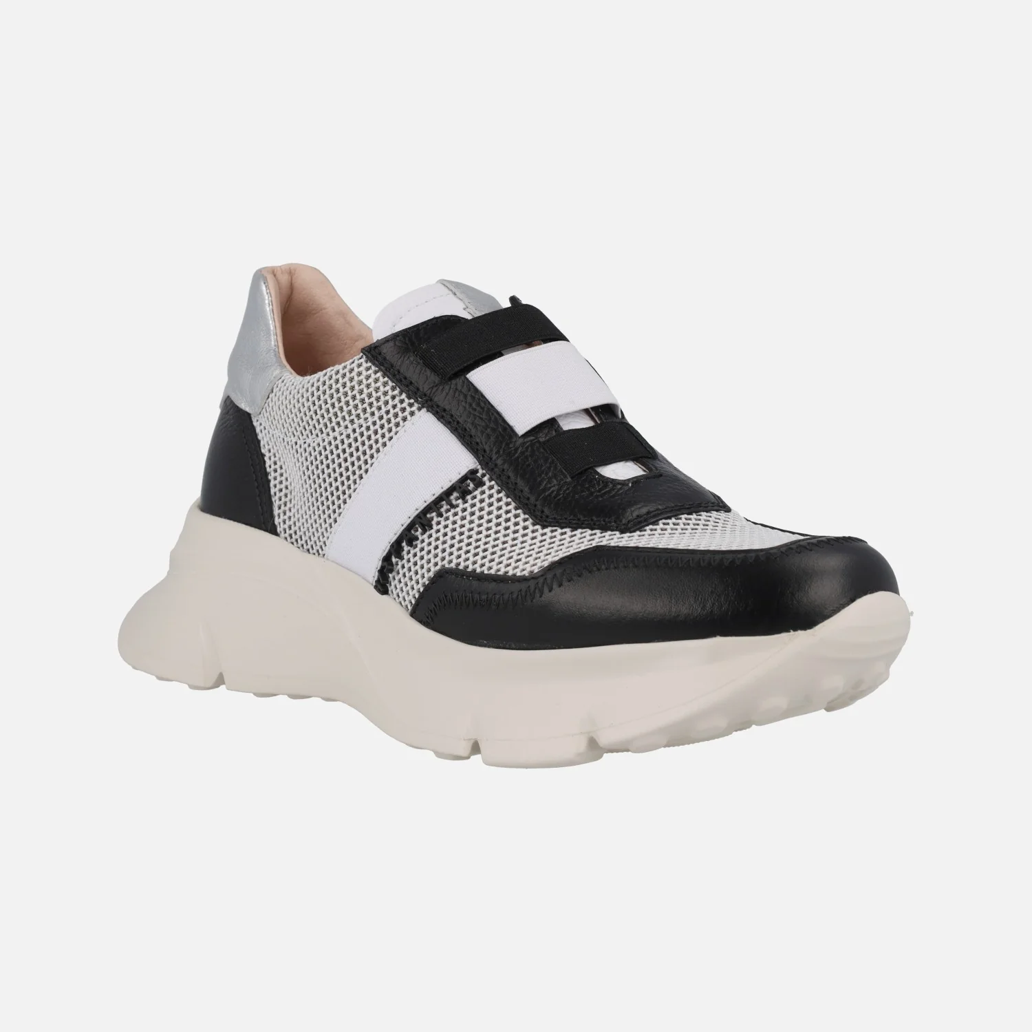 Deportivas multimaterial de la marca Hispanitas modelo HV243314 Black. Deportivas elaboradas en tejido rejilla combinado con piel negra y metalizado plata. Cierre de cordones elásticos, además lleva una cinta elástica blanca cruzando el empeine. Interior textil con plantillas extraíbles. Piso volúmen de 5 cms de altura trasera. Sistema TRIFLOW de triple almohadillado, para un gran confort al caminar. Made in SPain.