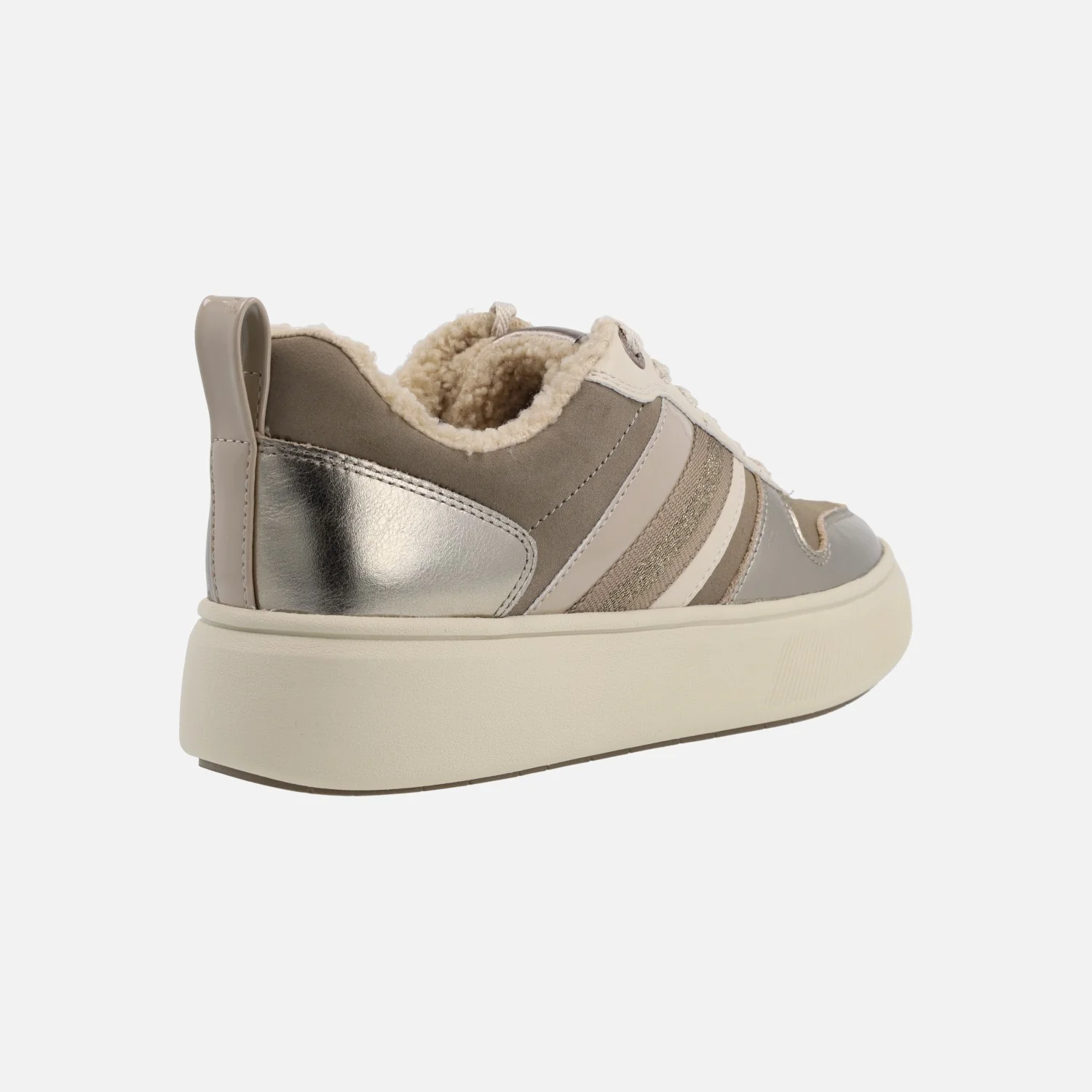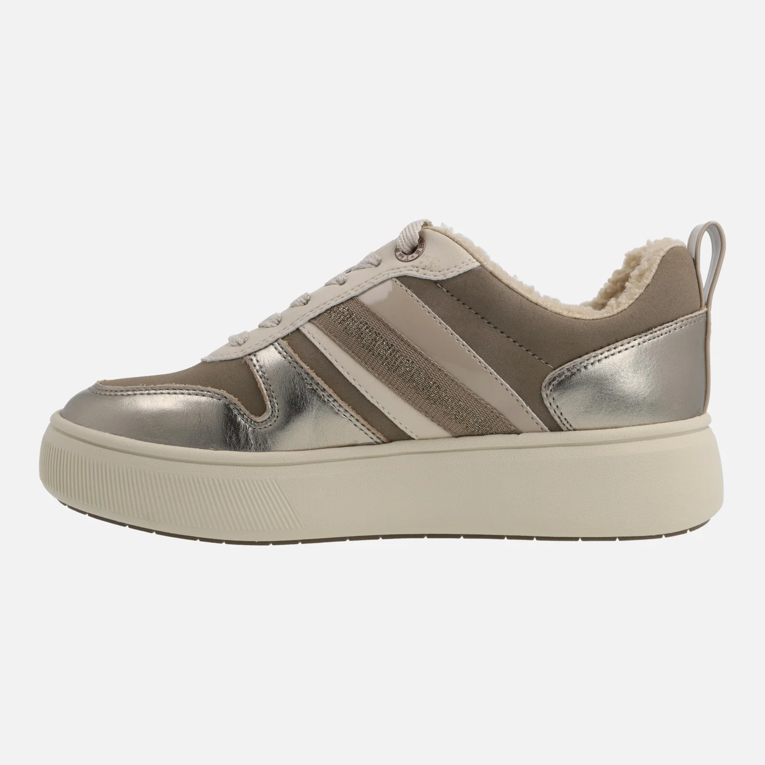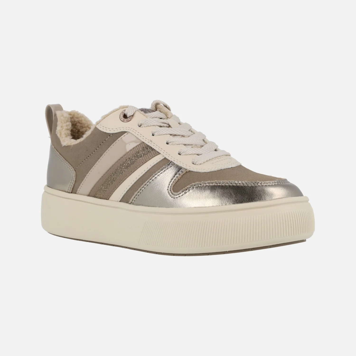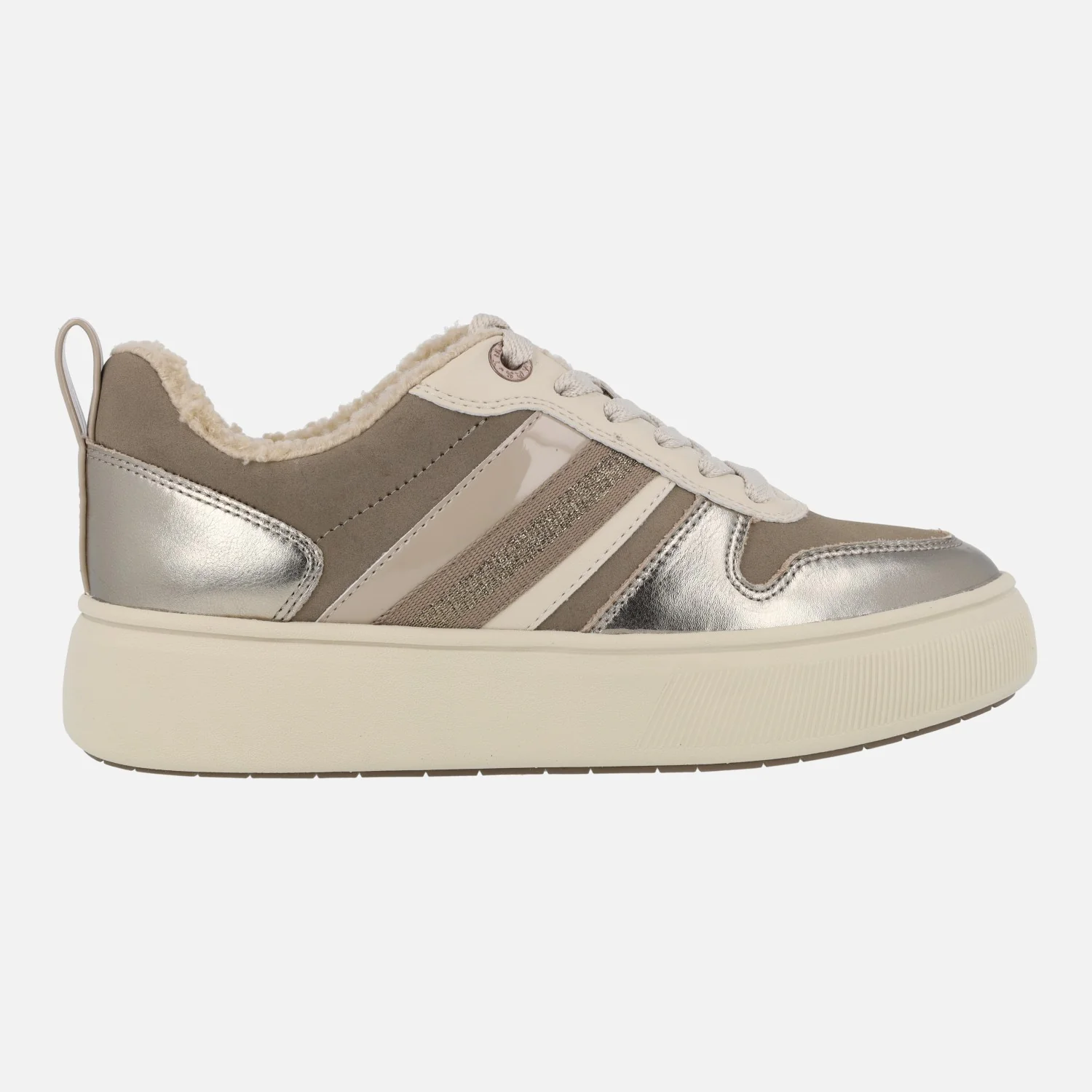 Enamorada de las nuevas deportivas Tamaris modelo 1-23727-41 Platinum. Deportivas con cordones, elaboradas en combinado de tejido y piel en tonos taupe, beige y metalizado platino. Forro de borreguillo beige (forro y lengüeta, planta no). Planta textil acolchada. Piso de goma super ligero, con 4 cms de plataforma.