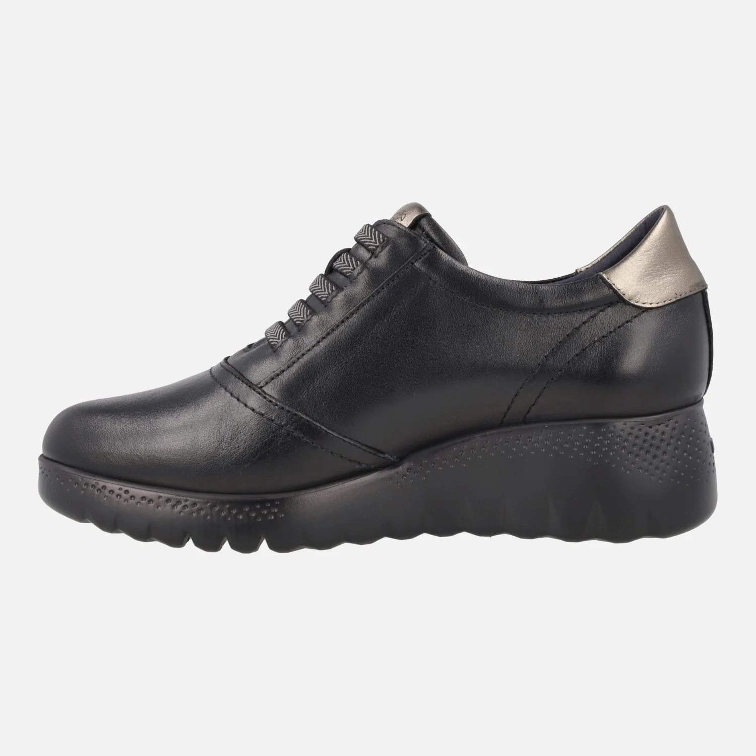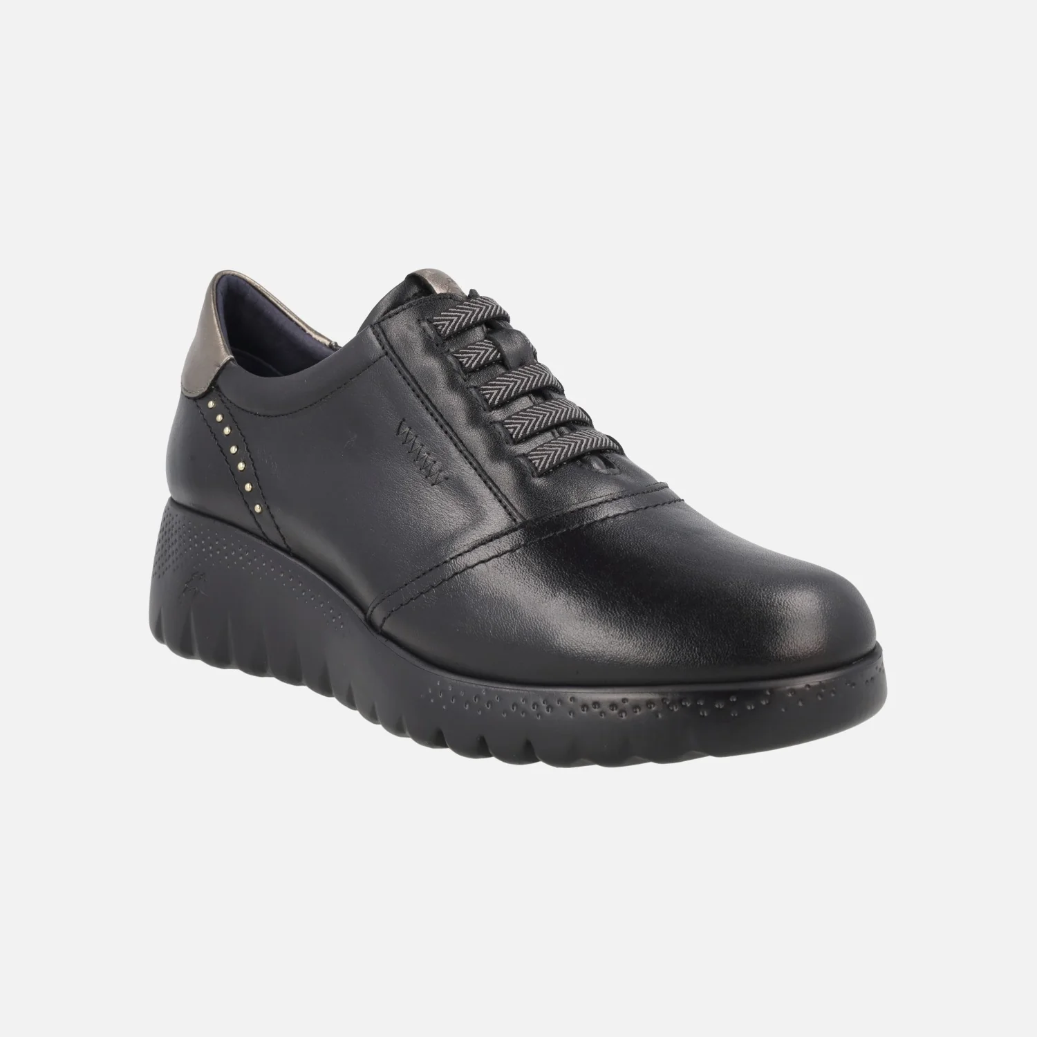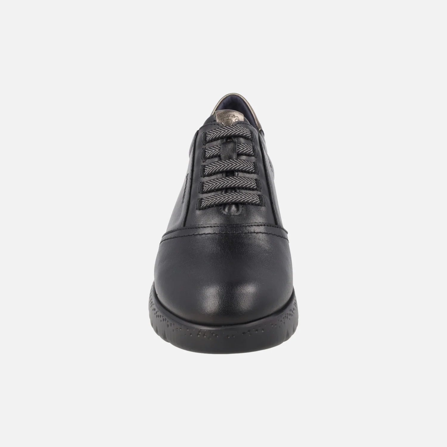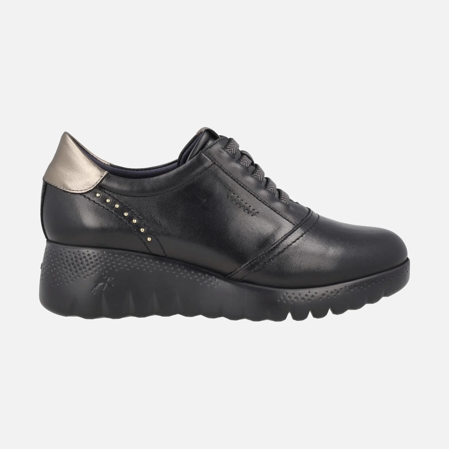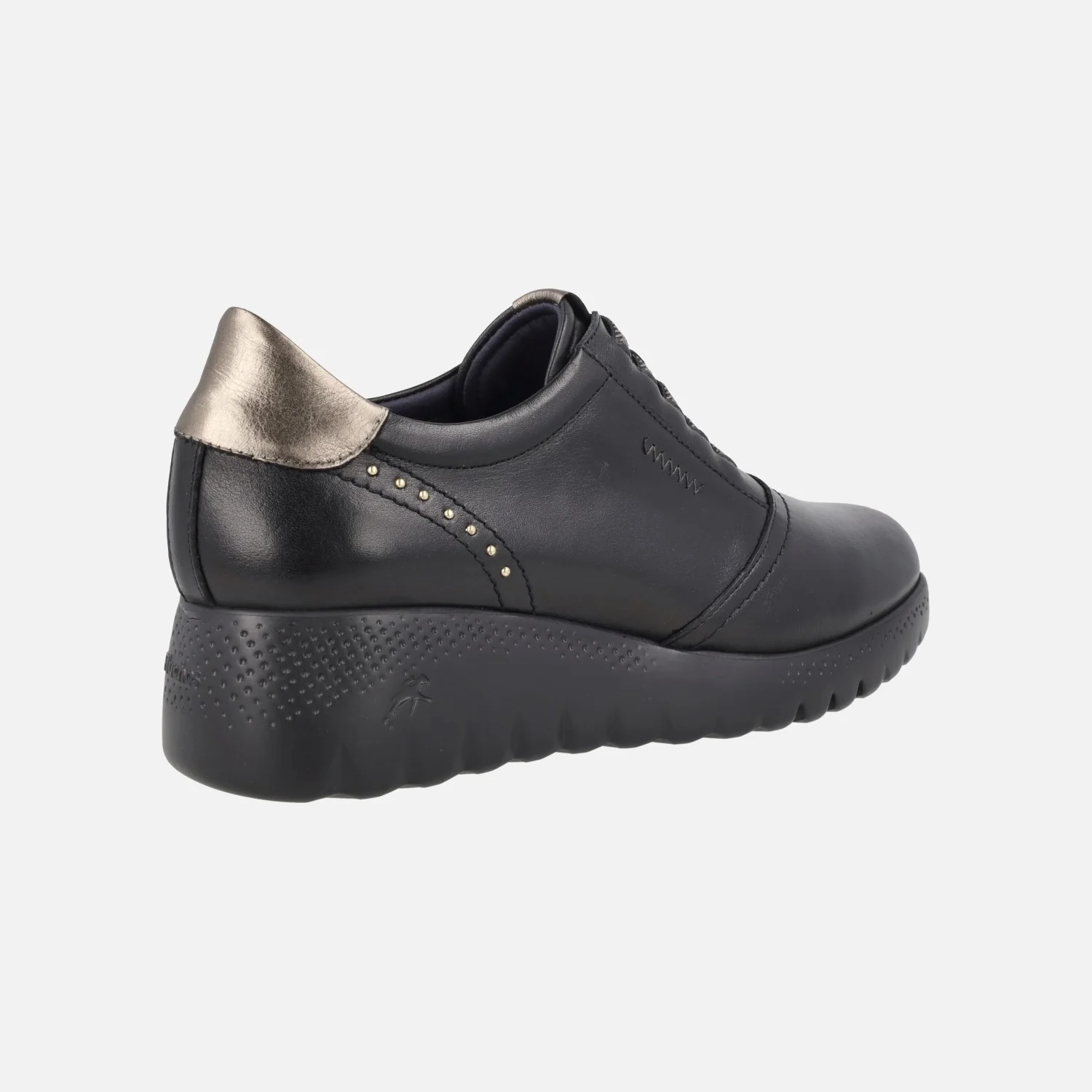Zapatos deportivos para mujer de la marca Fluchos, modelo Live F2096 Sugar Negro. Deportivas elaboradas en piel negra, con talonera en metalizado oro y pequeñas tachas doradas en la parte de atrás. Cordones elásticos. Interior textil con plantillas extraíbles. Piso de goma, con 4,5 cm de altura trasera (2 cm parte delantera).
