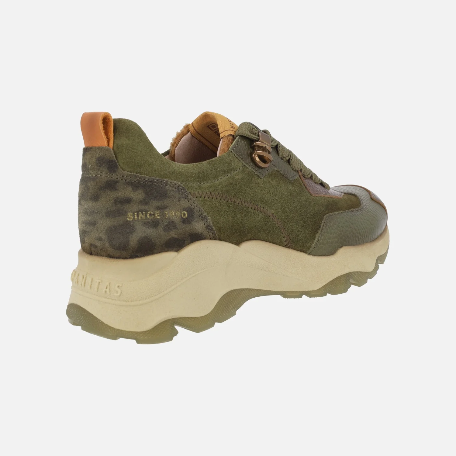 Zapatos de cordones estilo deportivo de la marca Hispanitas, modelo Nepal CHI254320 Army. Zapatos deportivos, elaborados en piel y serraje, en color verde militar con detalles en marrón y talonera en animal print. Lengüeta forrada de pelo borreguillo. Cierre de cordones. Interior de microfibra con plantillas extraíbles. Piso de goma termoplástica, con 4 cm de altura trasera (2,5 cm parte delantera). Tecnología TRIFLOW de triple almohadillado para un gran confort al caminar.