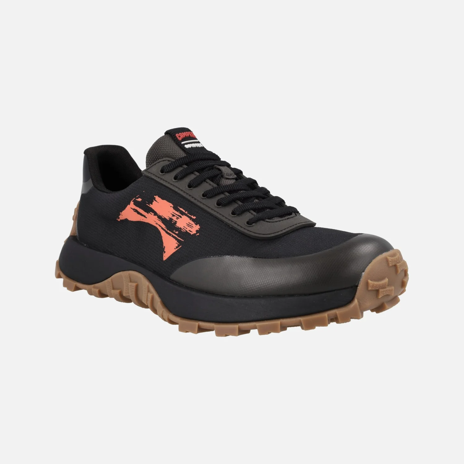 Zapatillas deportivas para hombre de la marca Camper modelo Drift Trail K101077. Deportivas elaboradas en materiales textiles y sintéticos, en color negro con logo contrastado en rojo. Cierre de cordones. Interior textil con membrana interior de Gore tex, impermeable. Plantillas extraíbles. Piso de goma VIBRAM.
