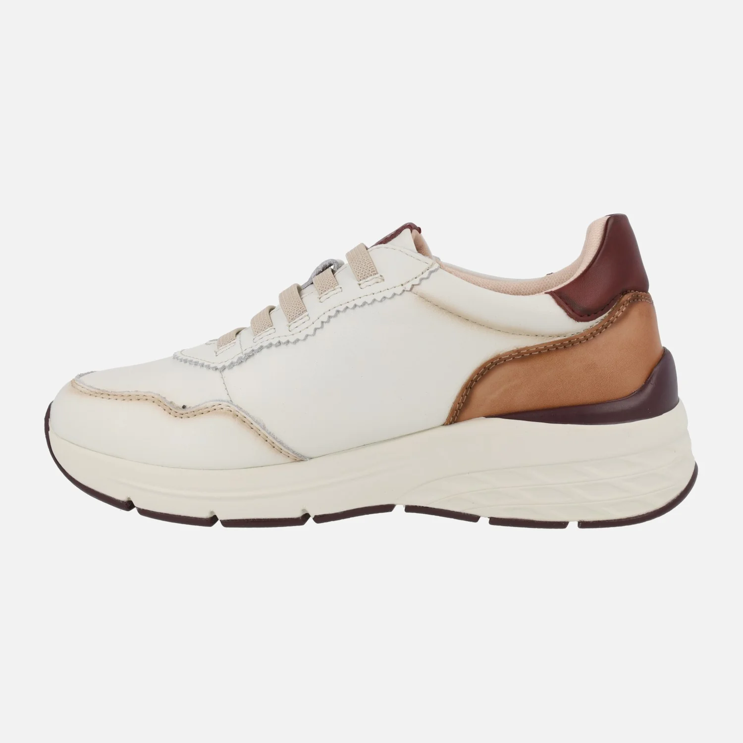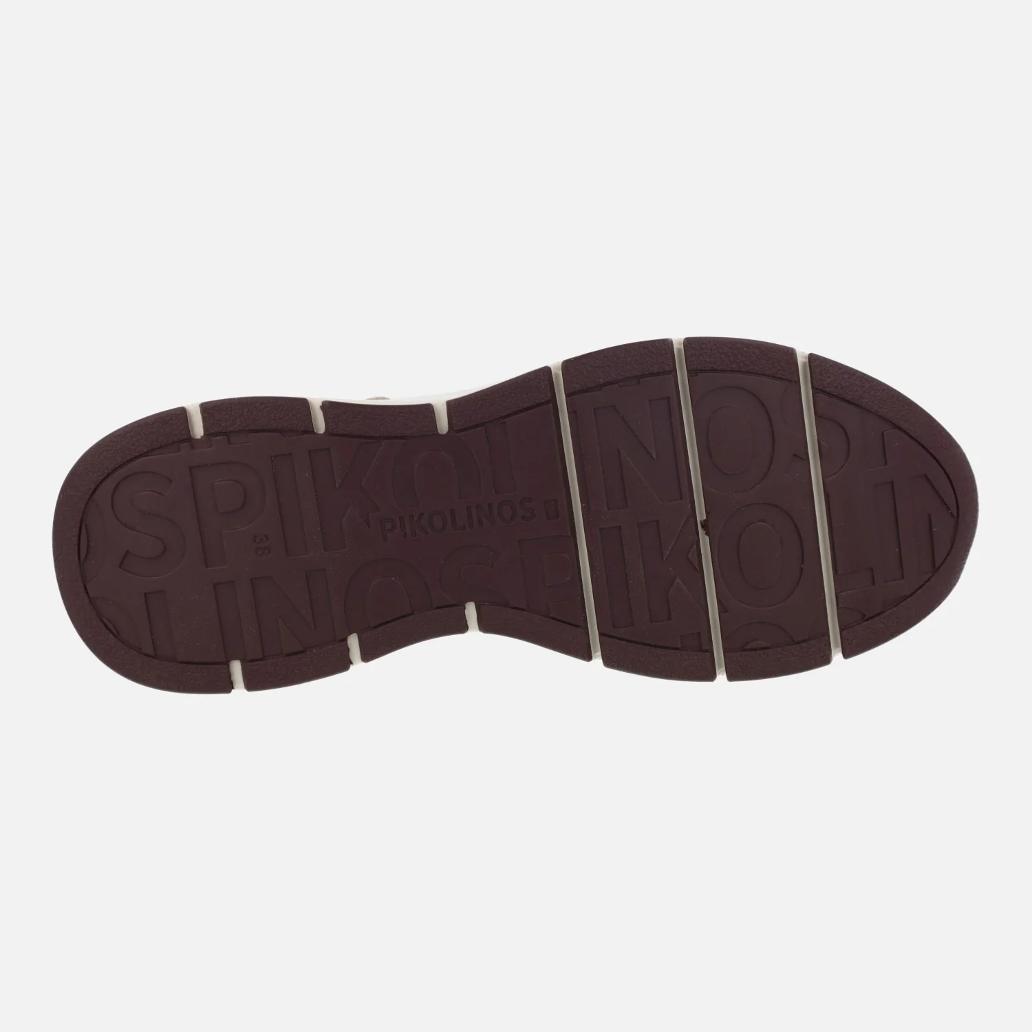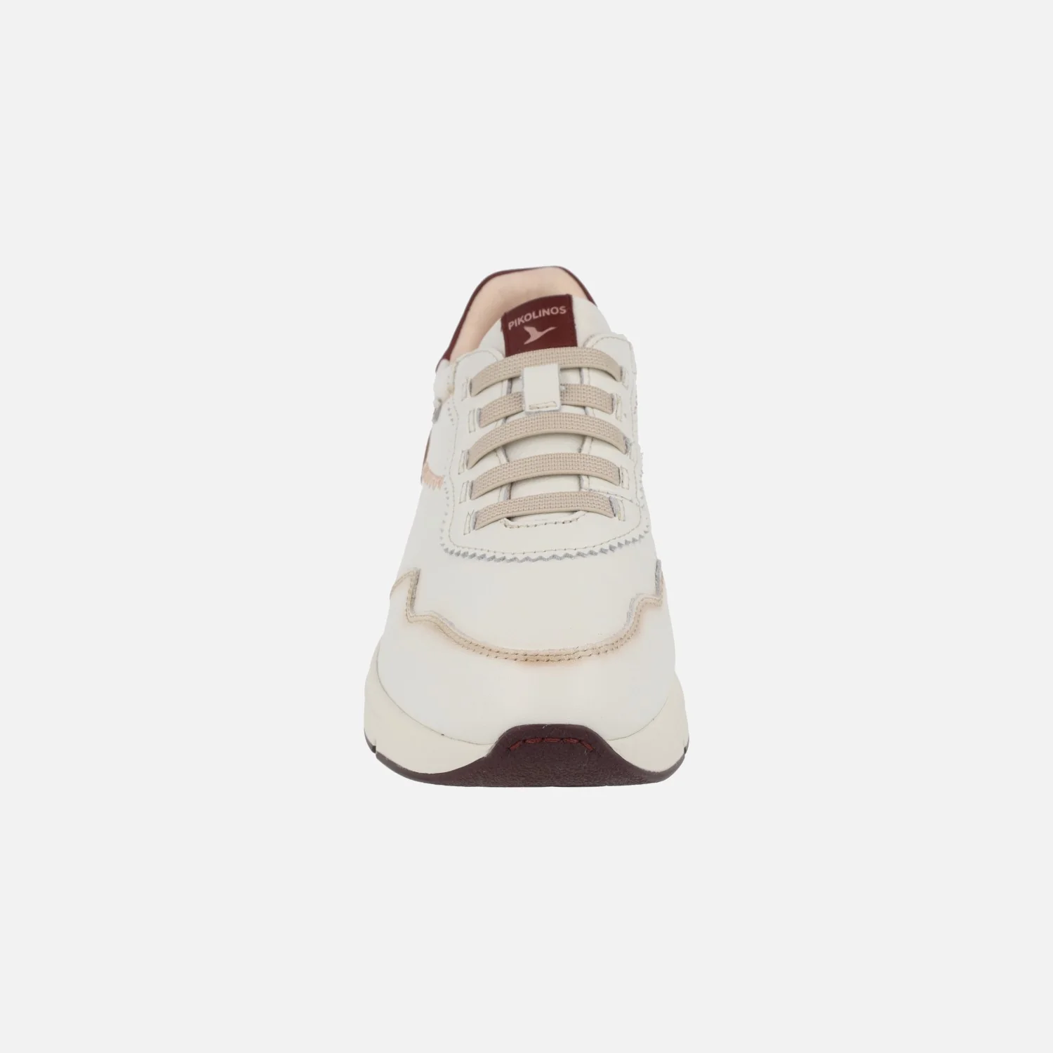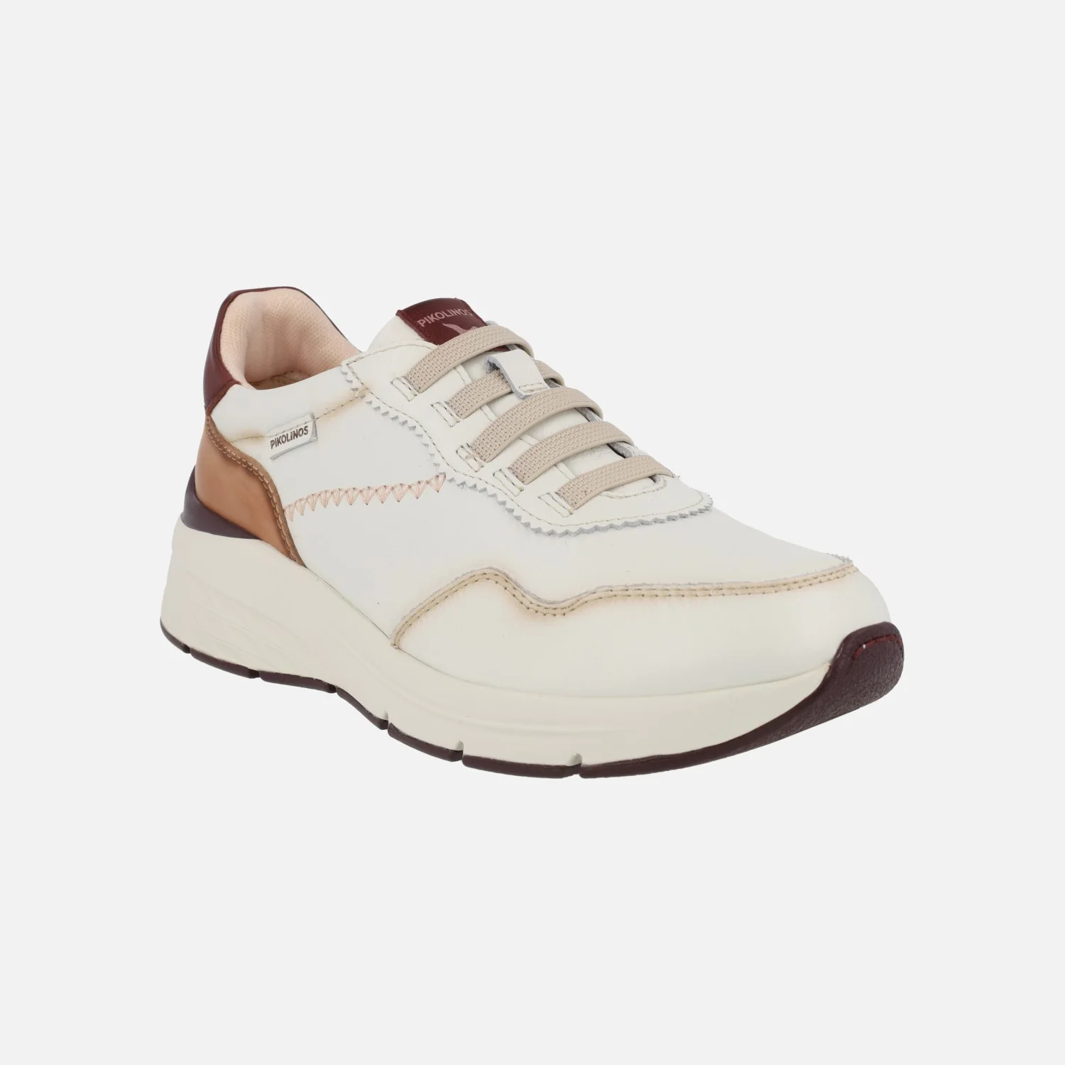 Zapatos deportivos Pikolinos Cuenca W6A-6681 Off white. Deportivos de piel elaborados en piel beige clarito (hielo) con detalles en marrón y granate. Cordones elásticos. Interior en tejido y otros materiales. Plantillas extraíbles Memory foam. Piso Extralight con 4 cm de altura trasera (2 cm parte delantera).
