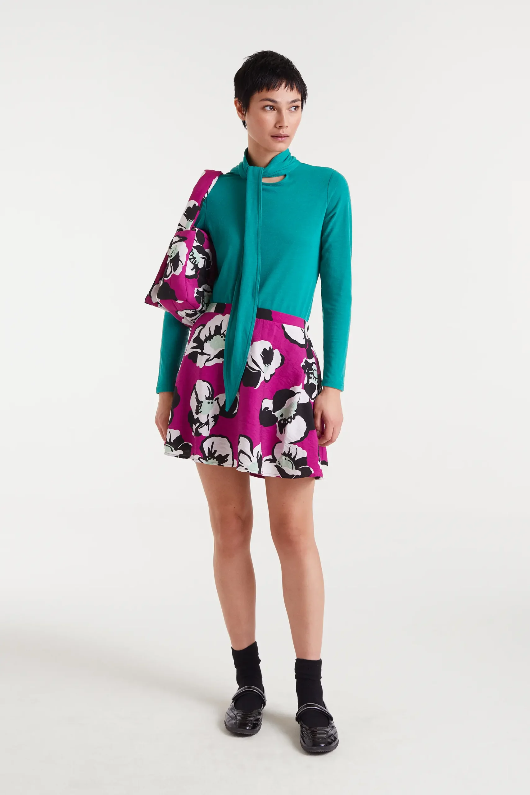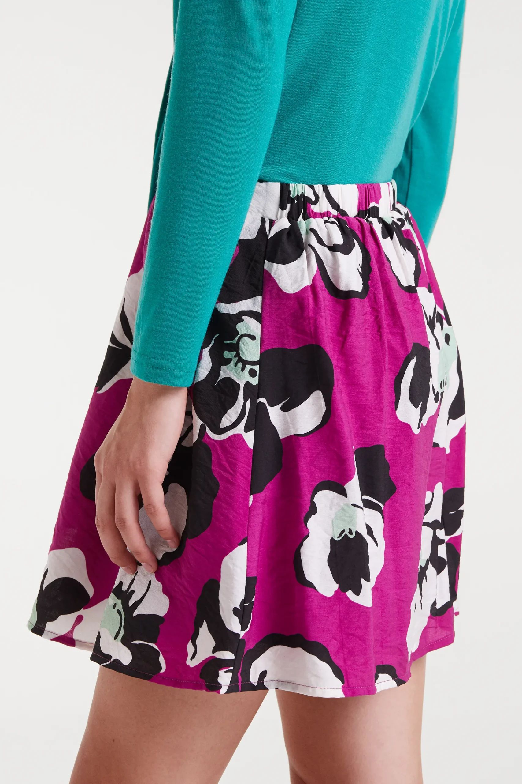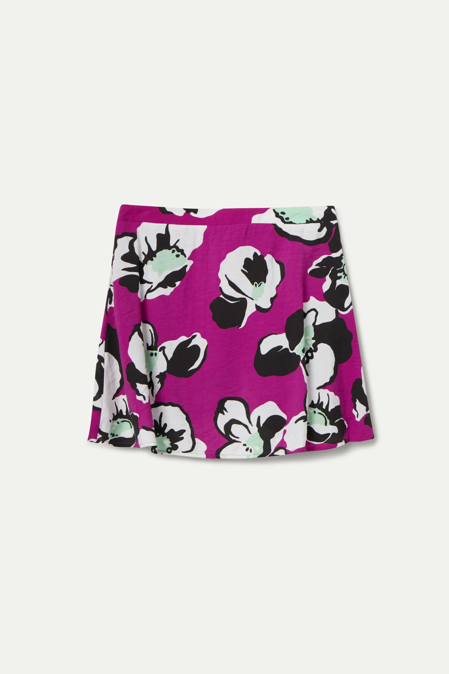 Falda corta de tejido crepé ligero con estampado Vivid Viola. Tiro fijo alto. Cierre con cremallera invisible lateral. Forro interior. La modelo mide 177 cm y lleva la talla S.