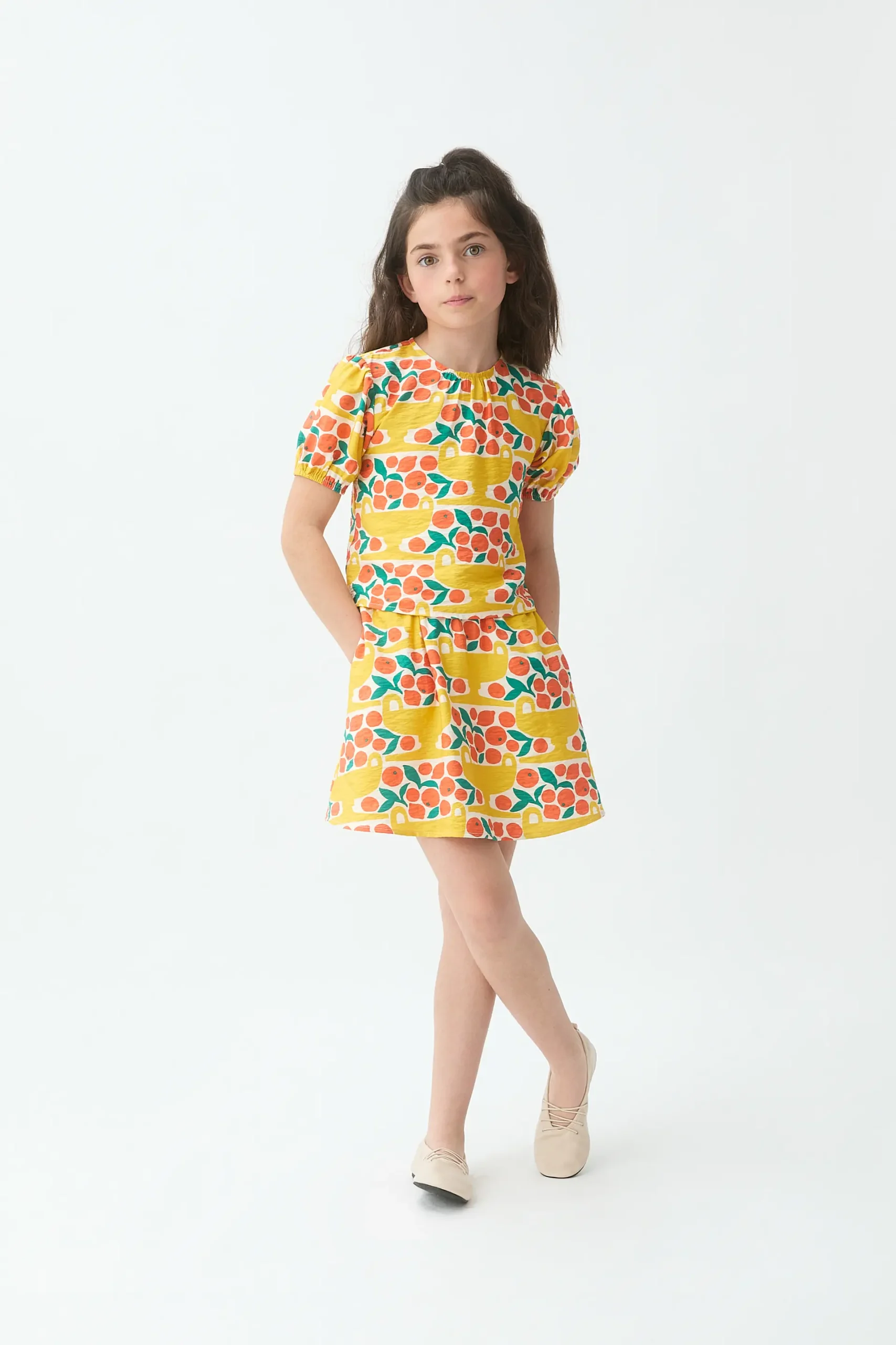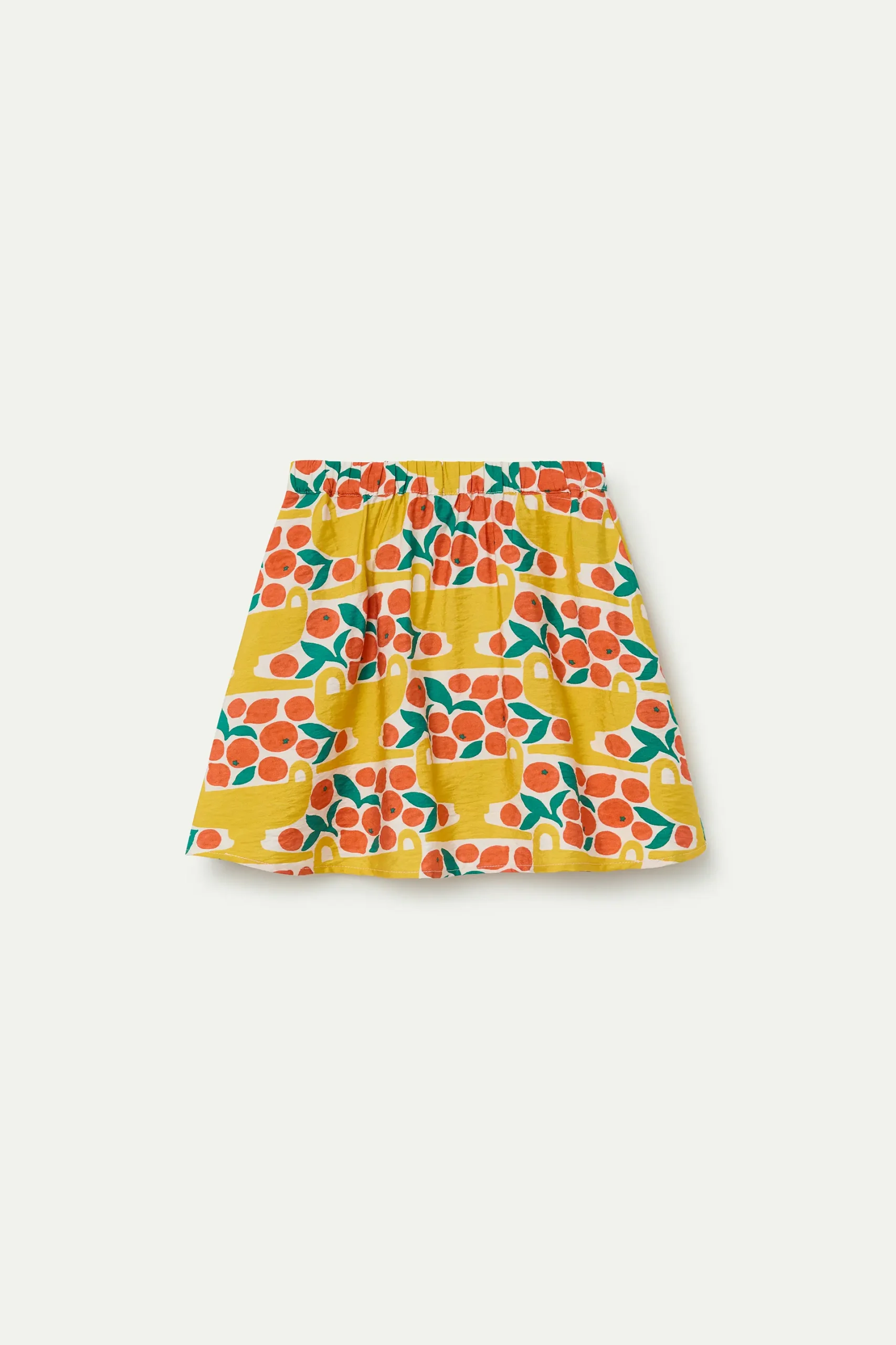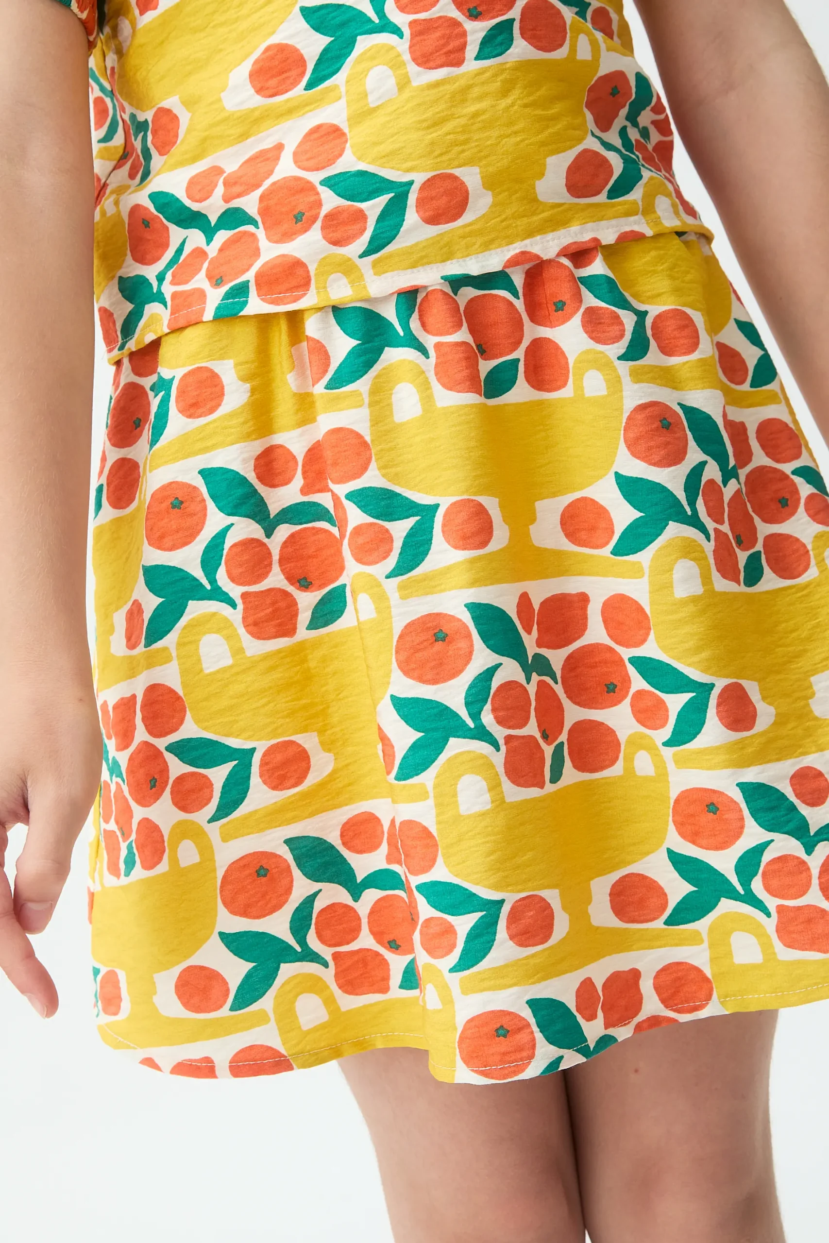 Falda corta de niña de tejido crepé con estampado citrus. Cintura fija de tiro elástico. Bolsiillos laterales funcionales. La modelo mide 135 cm y lleva la talla 8-9 años.