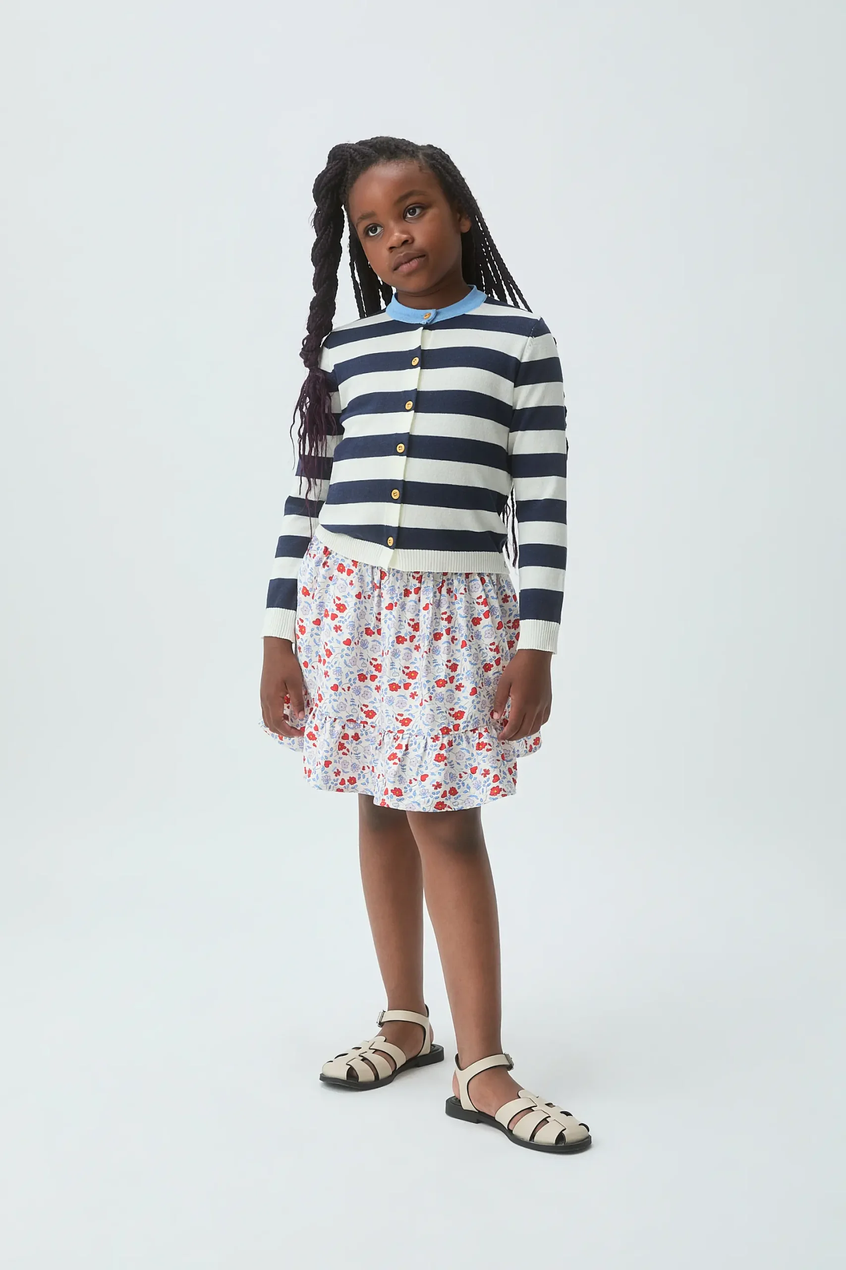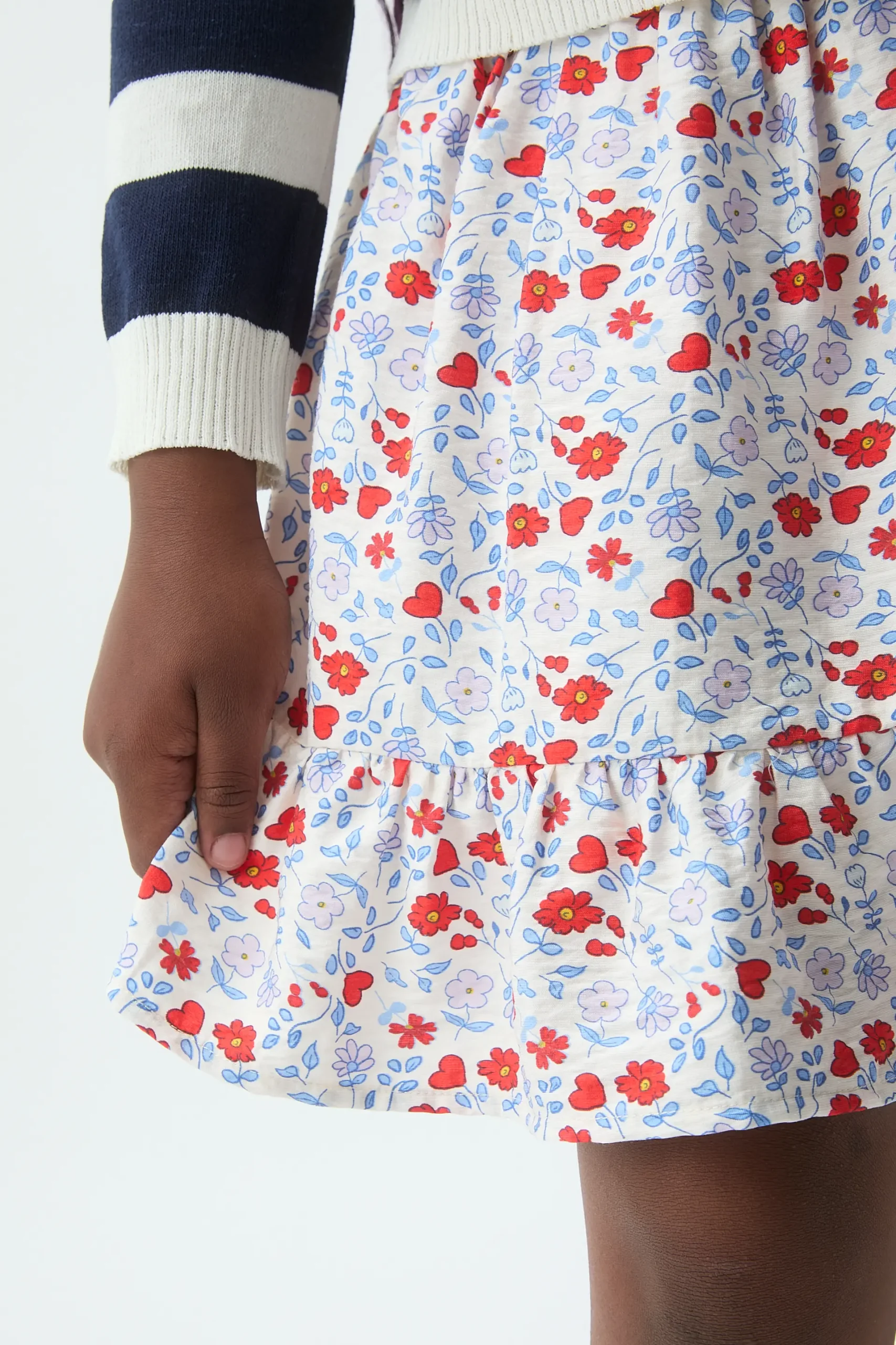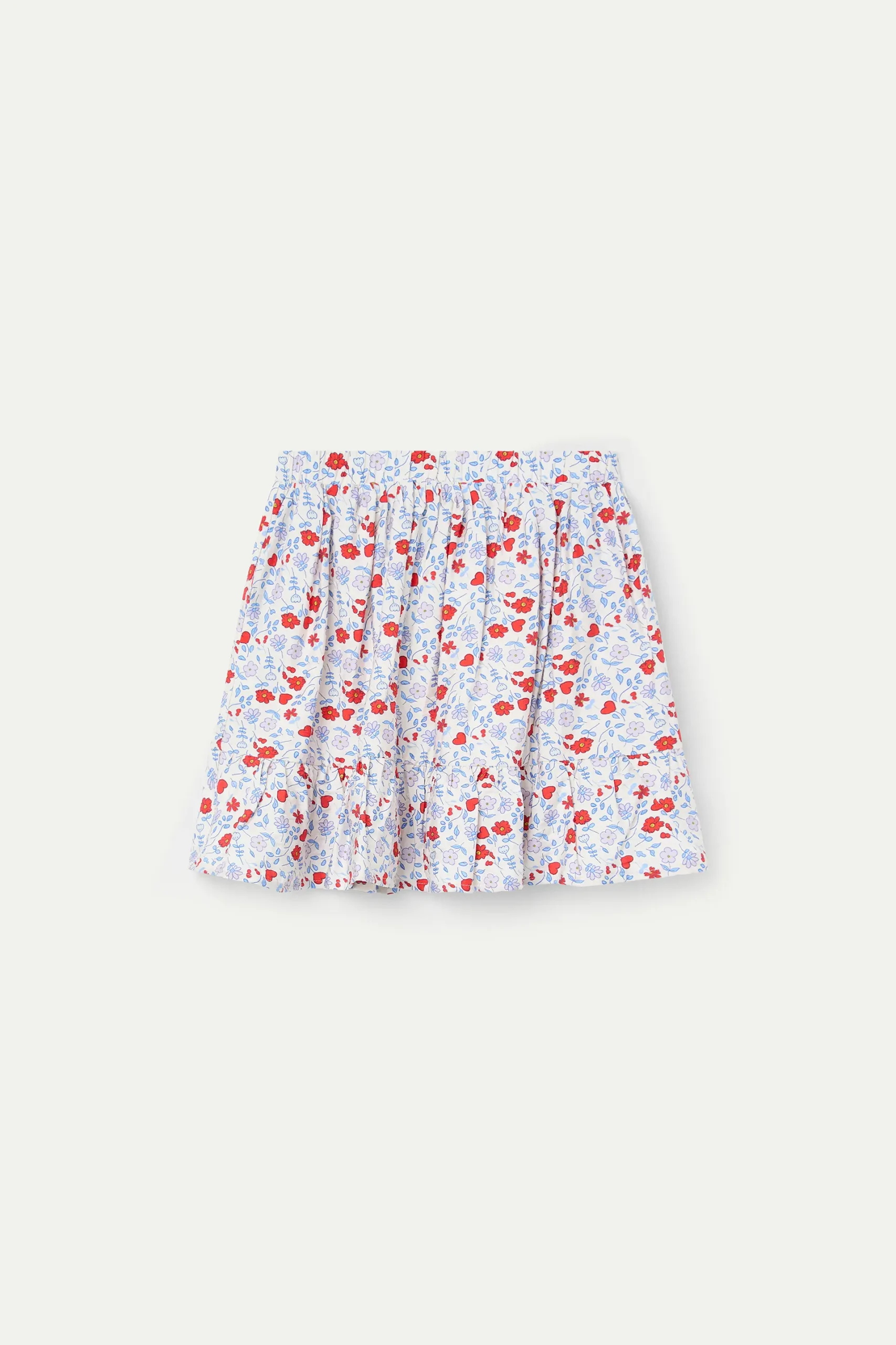 Falda corta de niña de tejido crepé con estampado cute. Cintura elástica de tiro fijo. Detalle de volantes. La modelo mide 133 cm y lleva la talla 8-9 años.