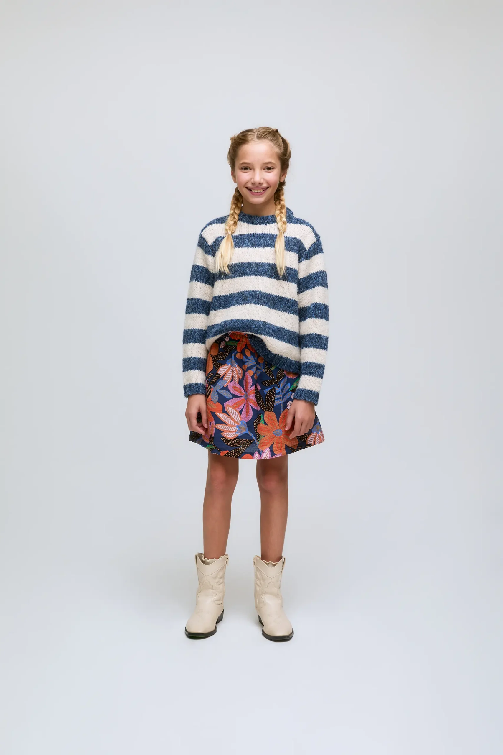 Falda corta de niña en crepé ligero con un estampado de flores Tigerlilly. Silueta fluida con cintura elástica.