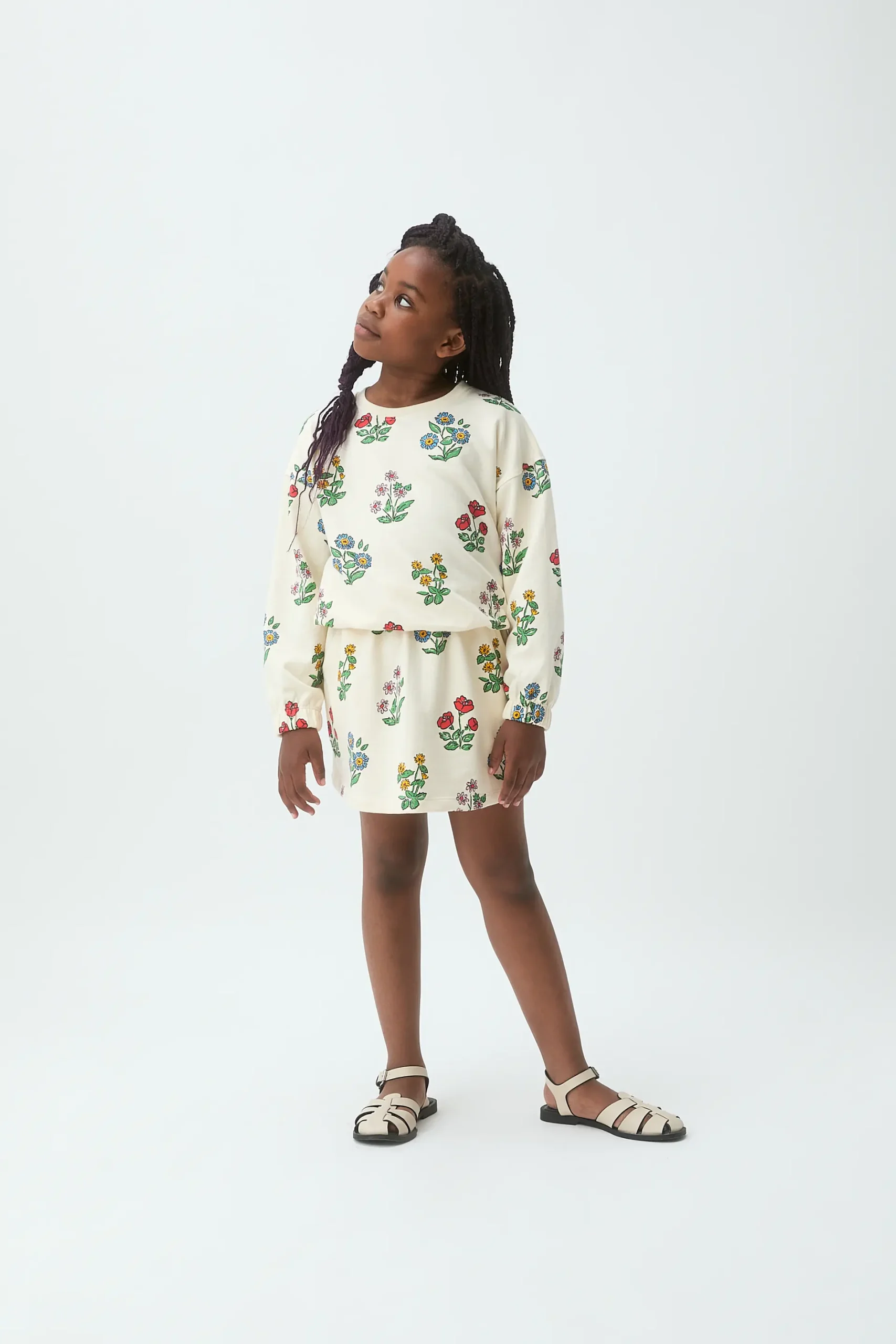 Falda corta de niña de tejido 100% algodón con estampado gardener. Cintura elástica de tiro alto. Bolsillos laterales. La modelo mide 133 cm y lleva la talla 8-9 años.