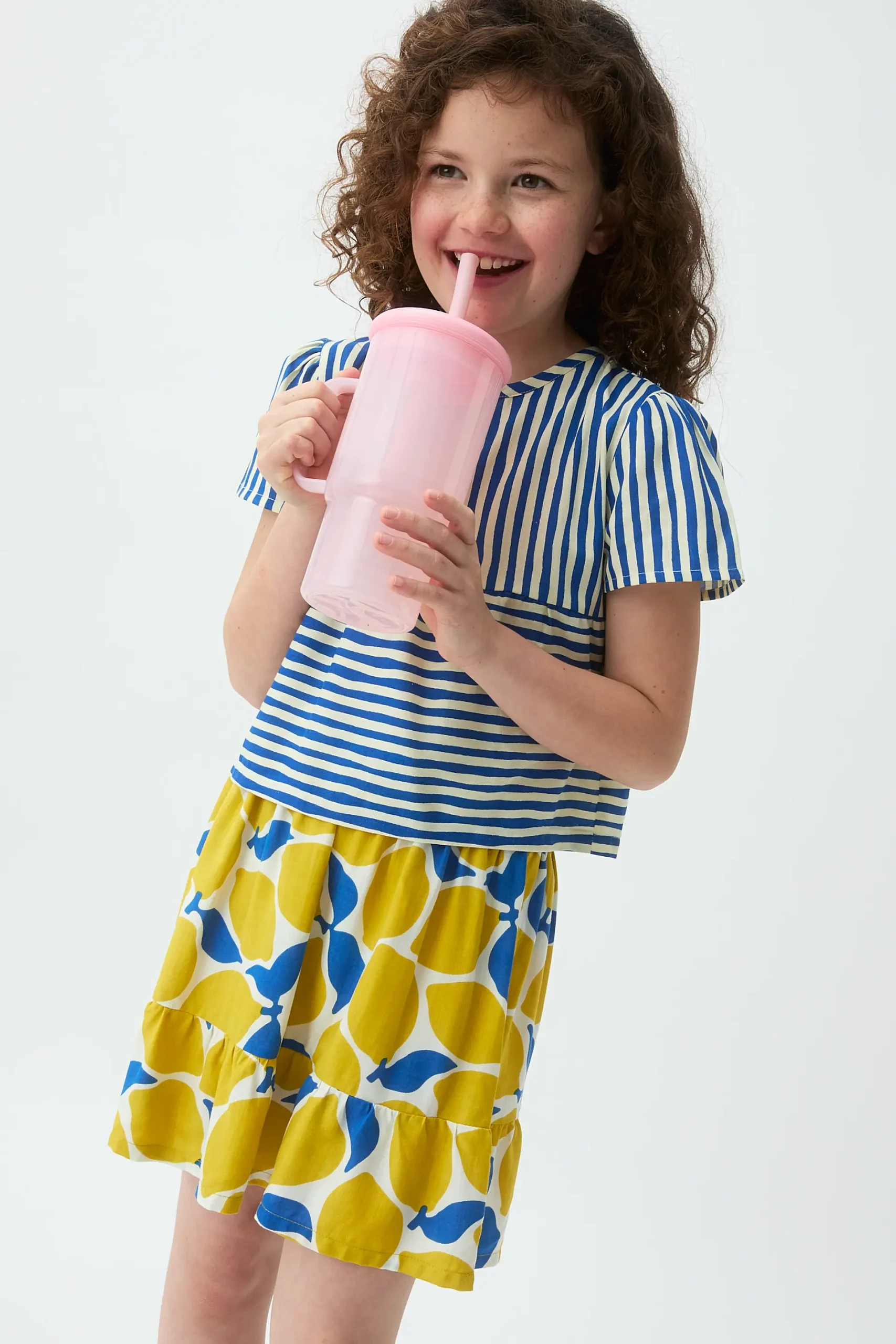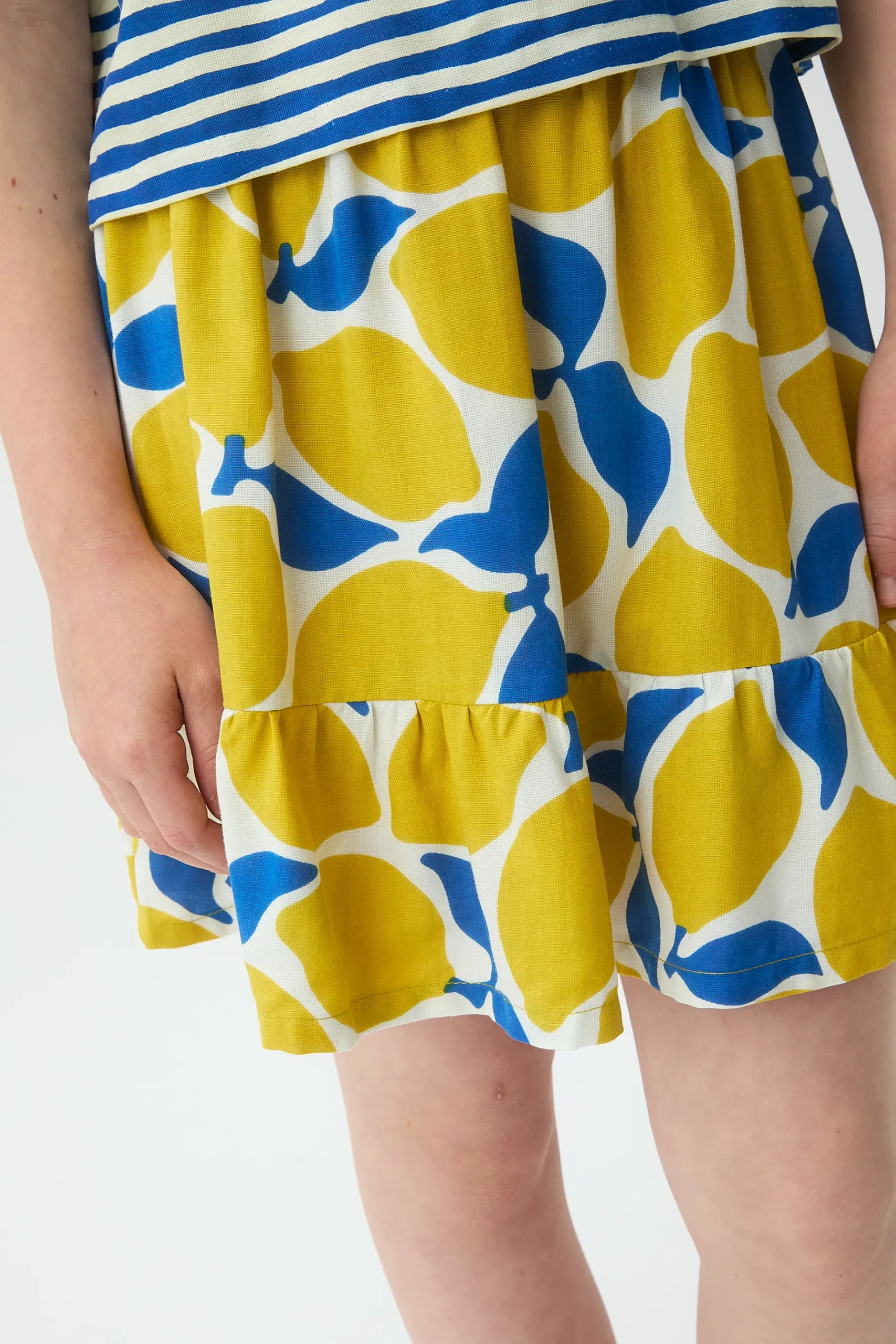 Falda corta de niña con estampado limoncello. Cintura elástica de tiro alto. Detalle en volante en la parte inferior. La modelo mide 134 cm y lleva la talla 8-9 años.