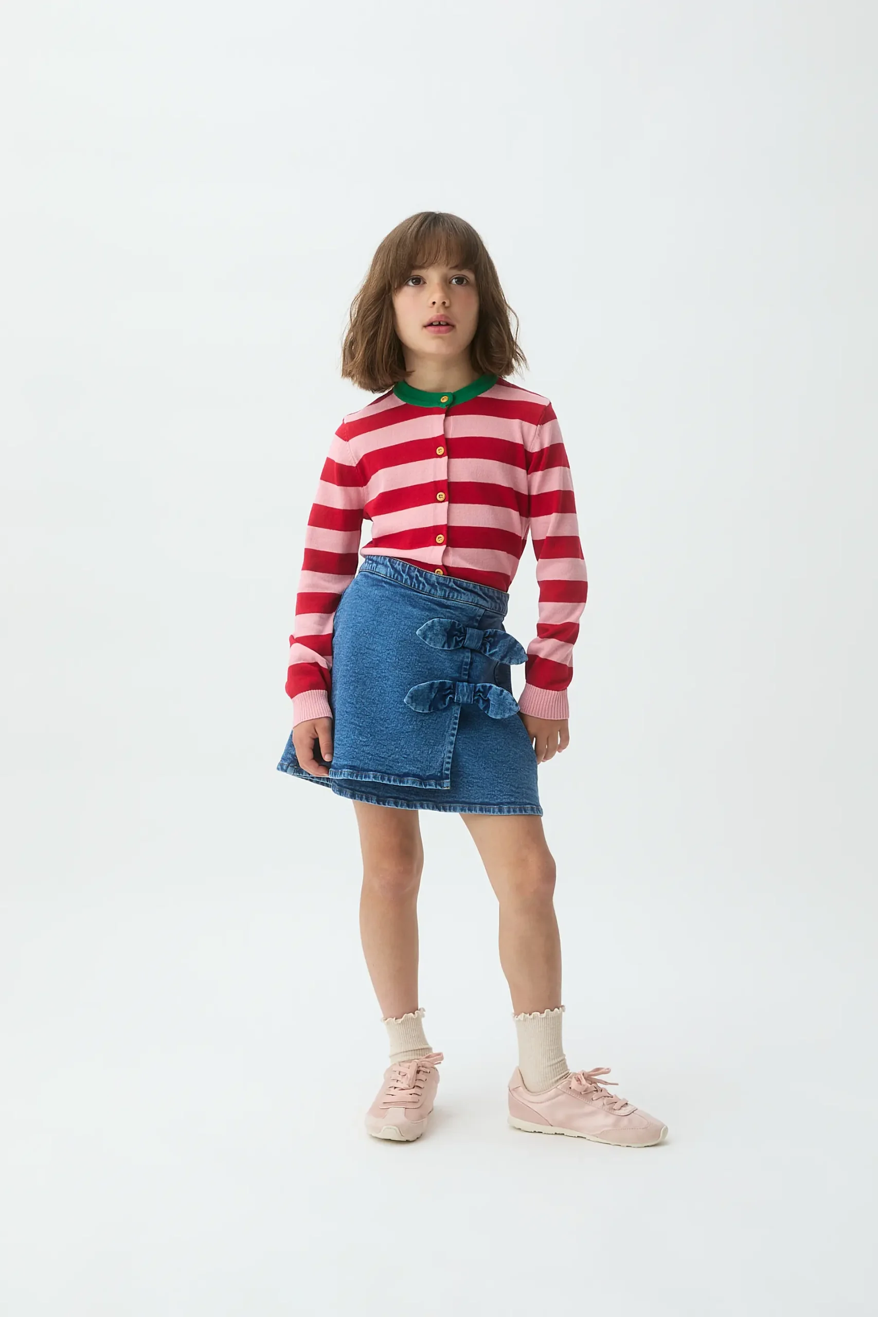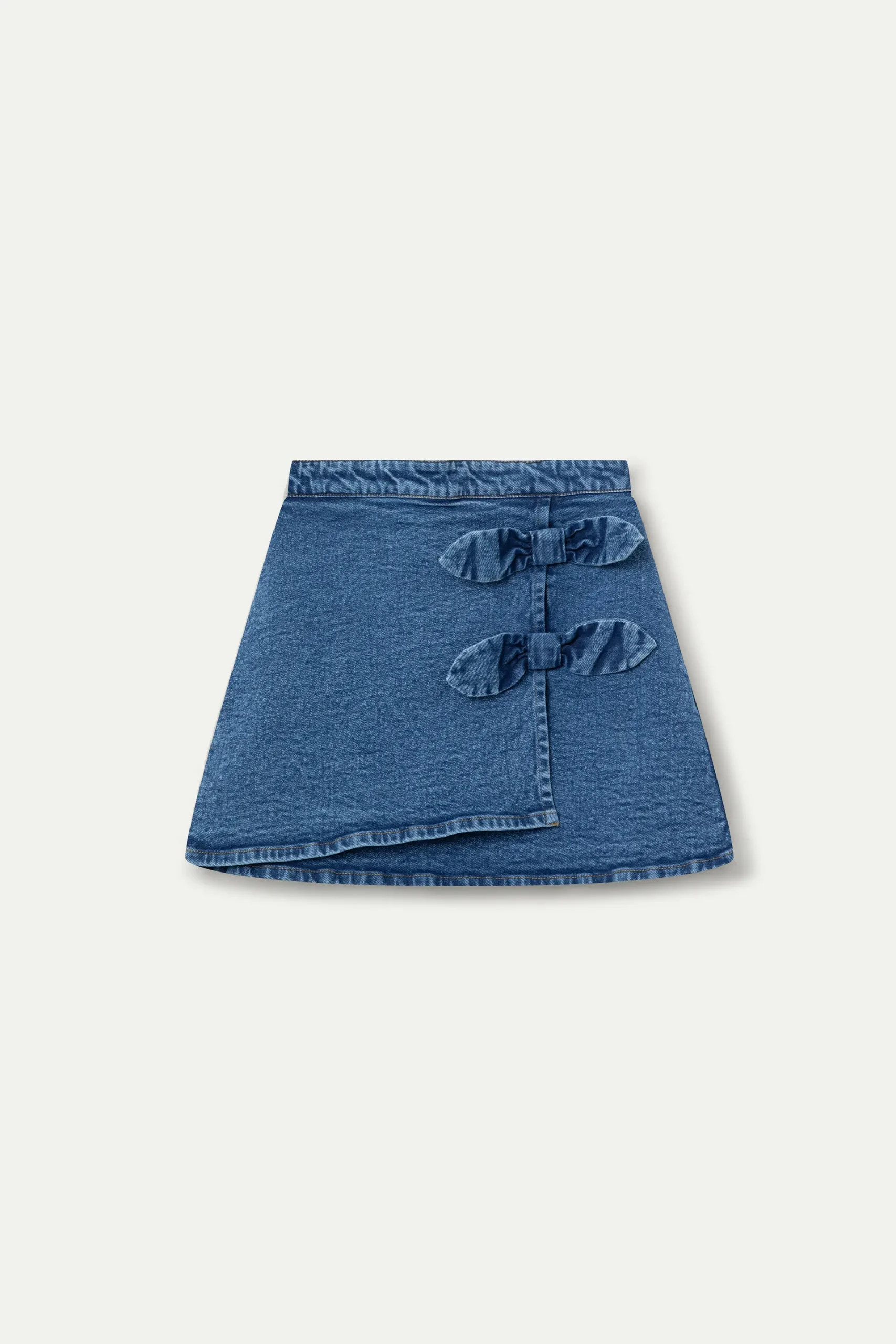 Falda corta de niña con tejido denim de color azul. Cintura fija elástica de tiro alto. Detalle de lazos. Corte tipo pareo. La modelo mide 127 cm y lleva la talla 8-9 años.