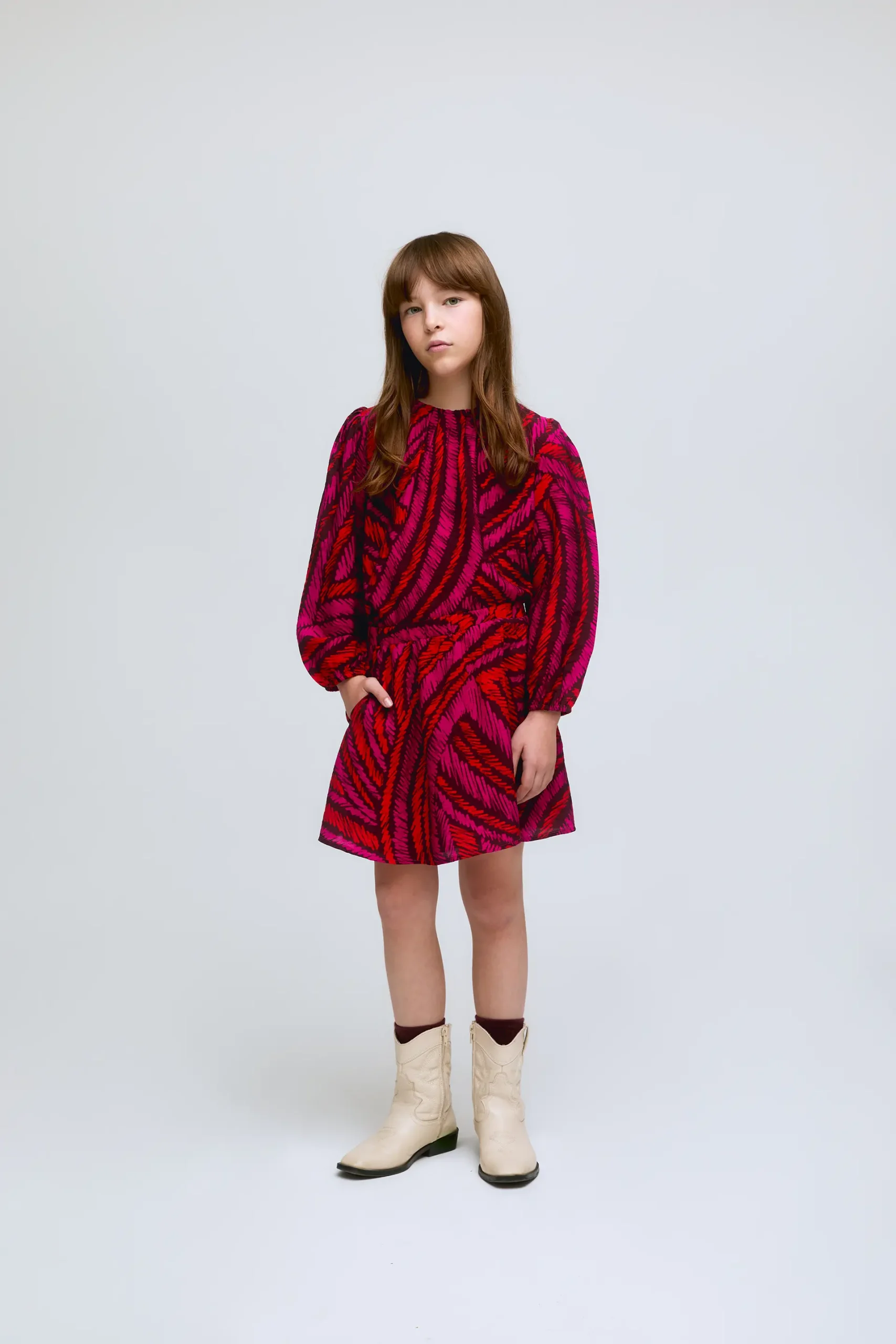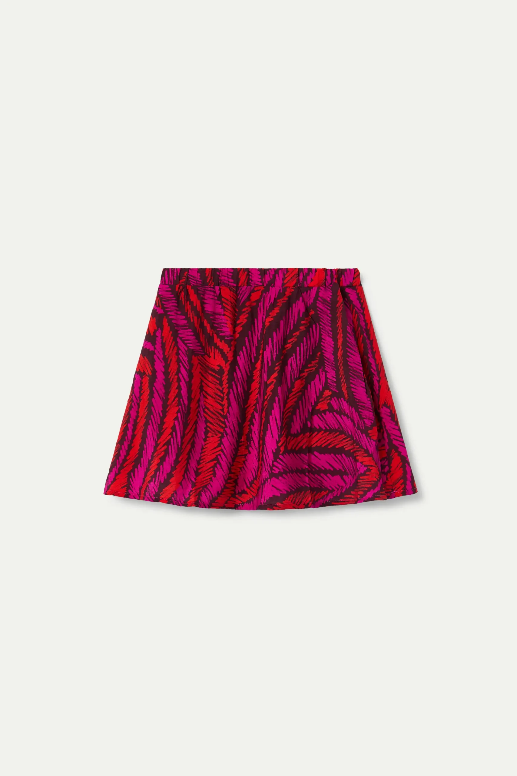 Falda corta de niña en crepé ligero con estampado Fedora. Con cintura elástica. Forro interior.