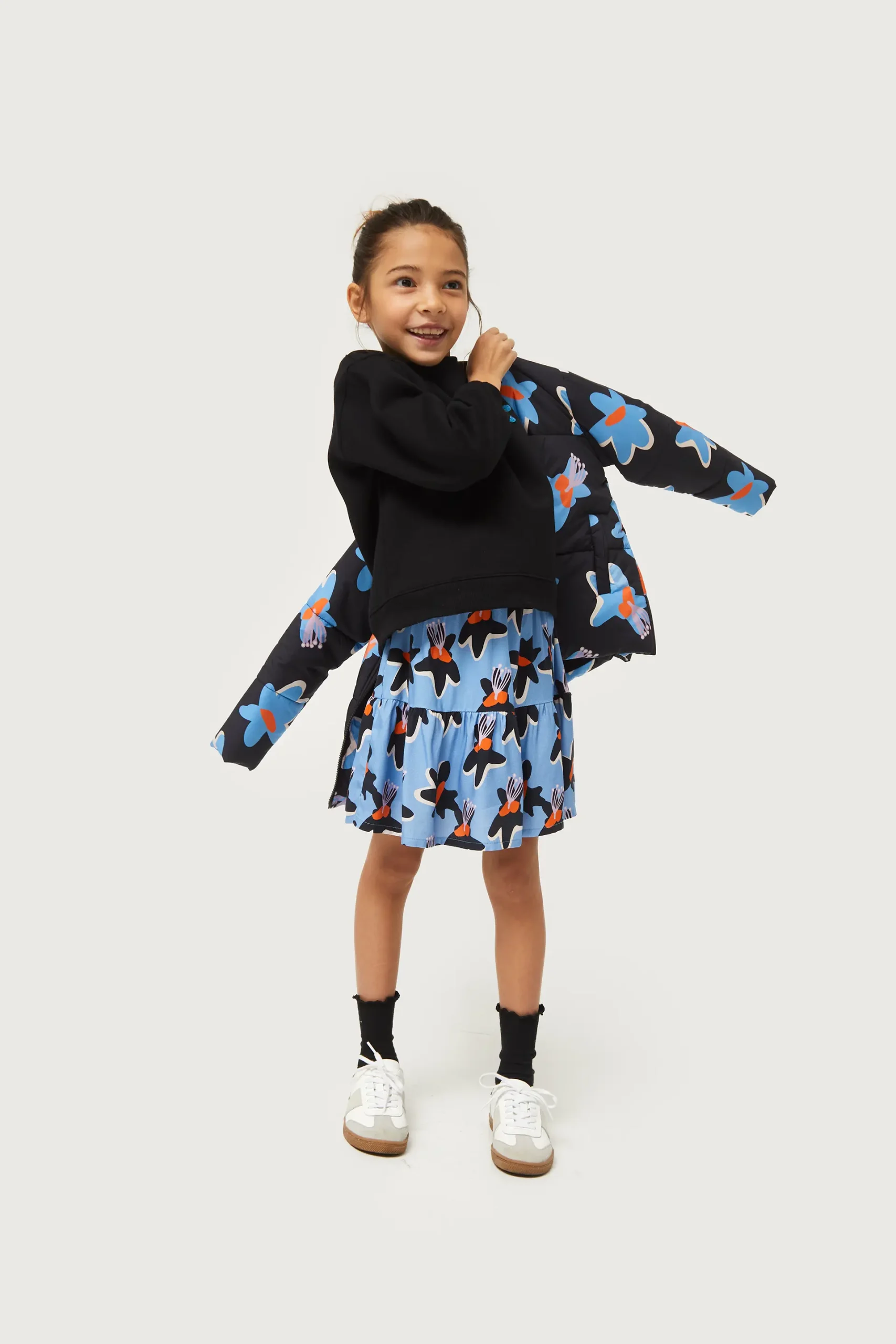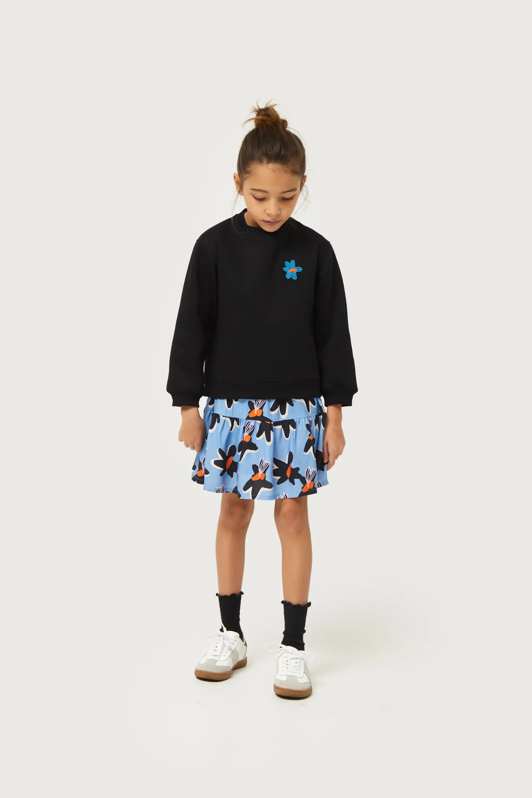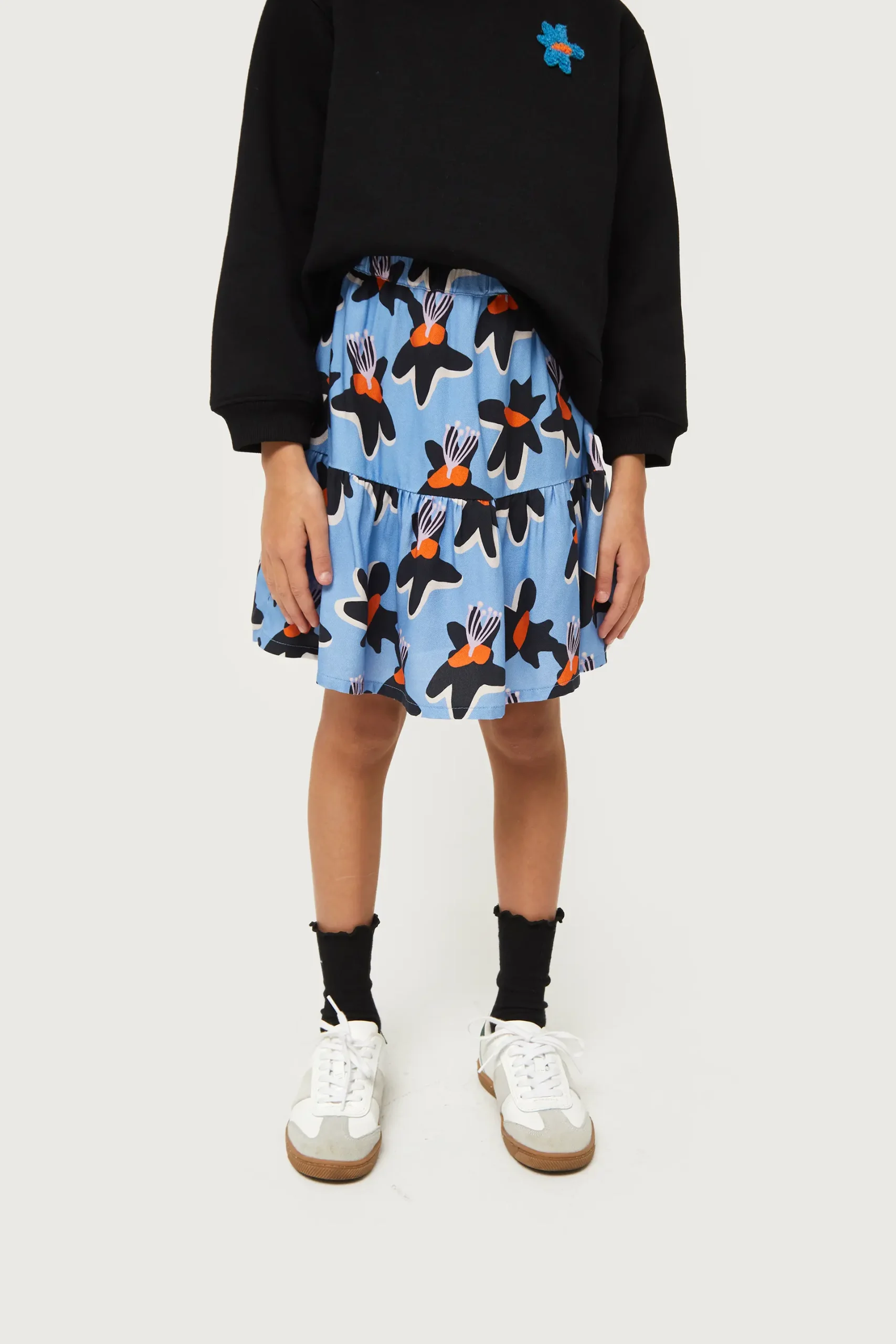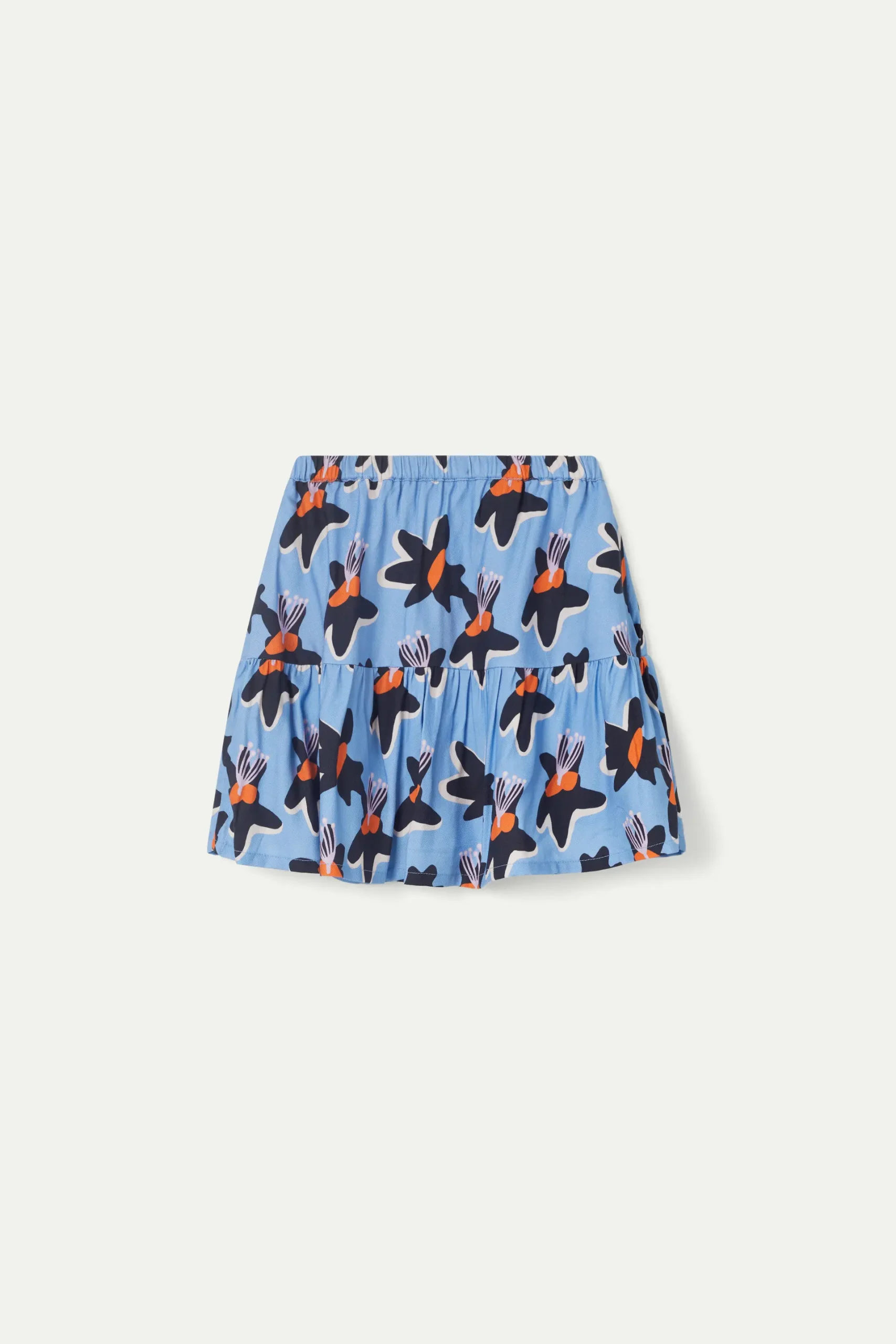 Falda corta de niña en twill de viscosa de color azul con estampado de flores negras y amarillas. Con cintura elástica. Detalle de volante. Forro interior. La modelo mide 130 cm y lleva la talla 8.