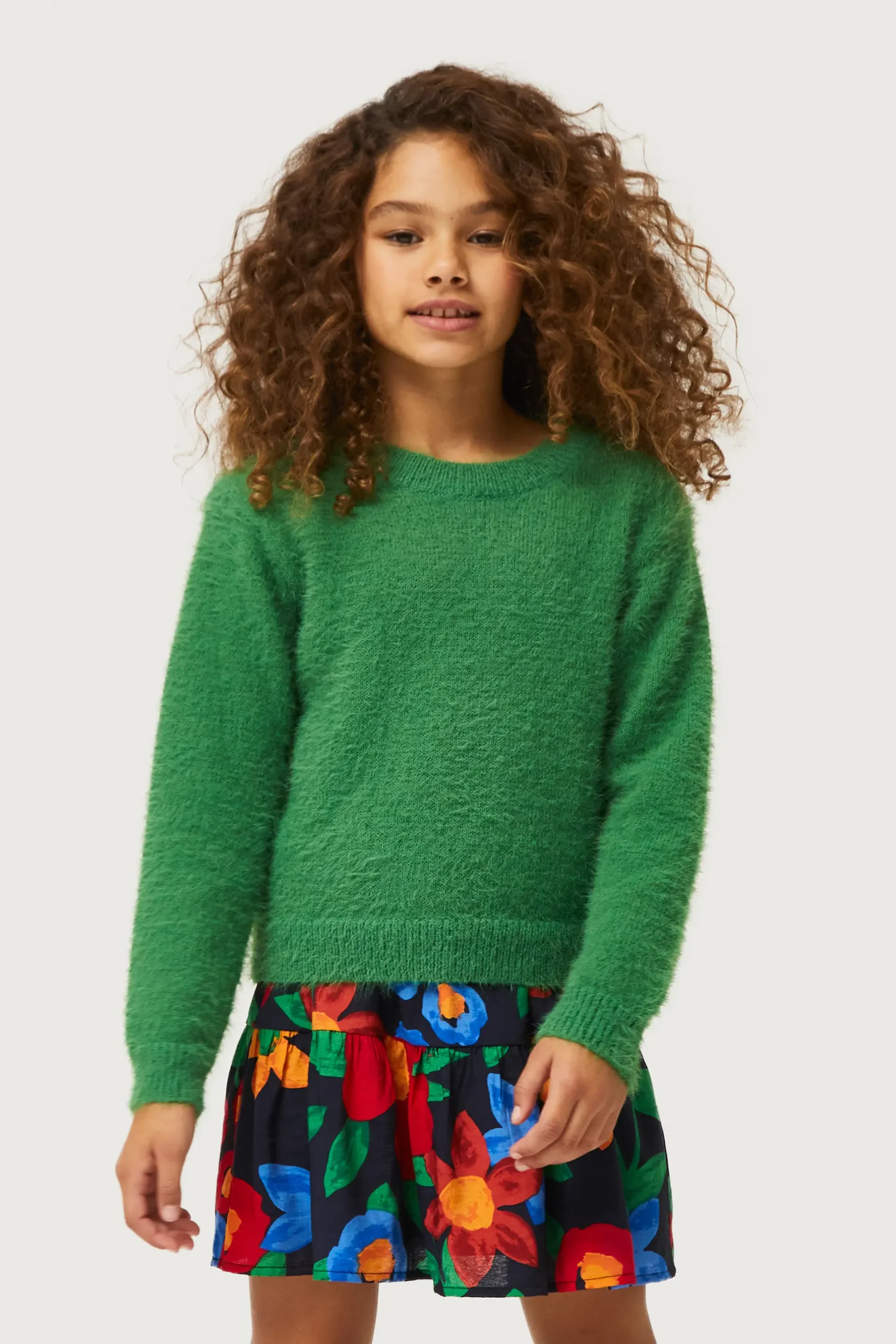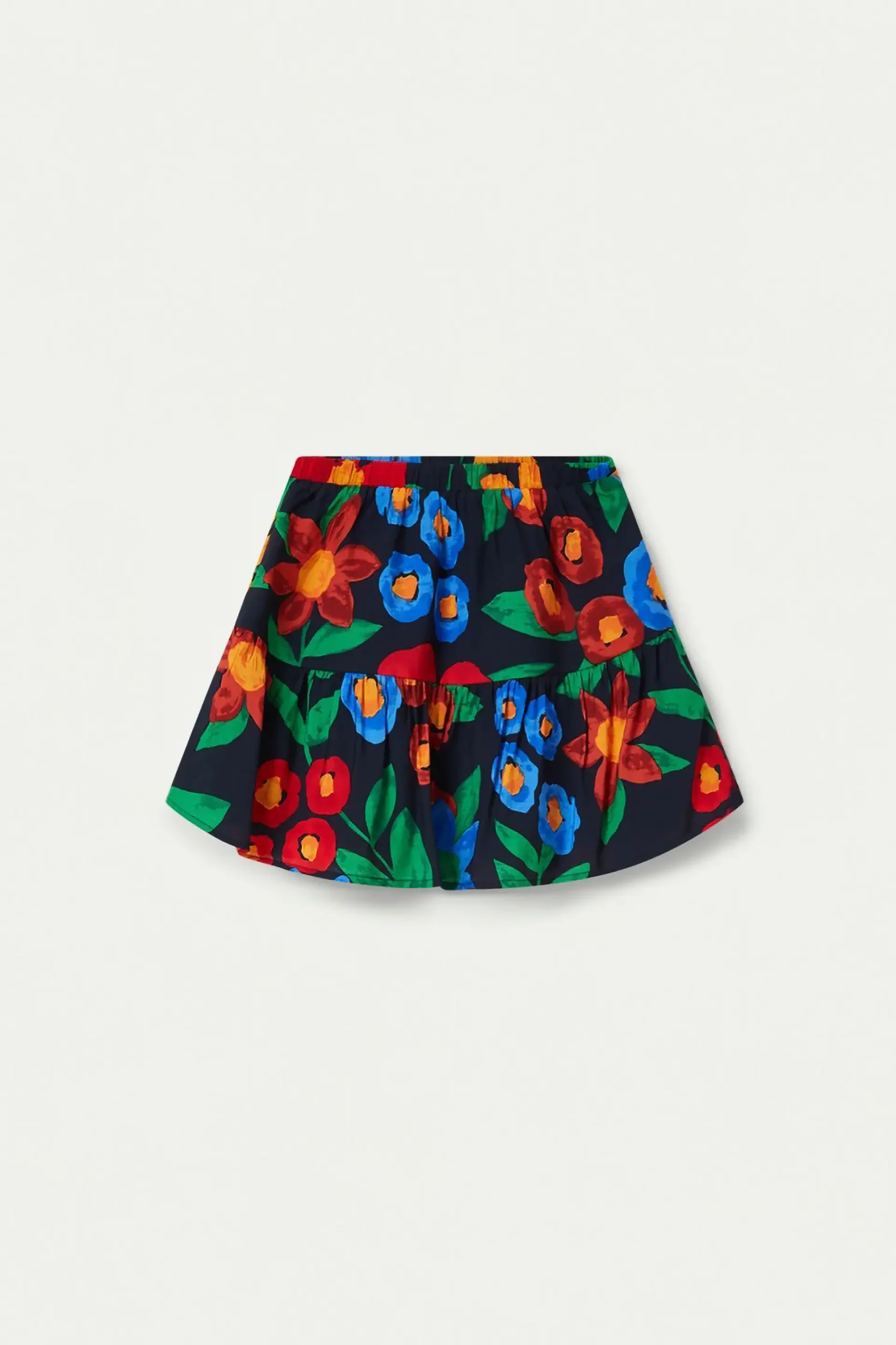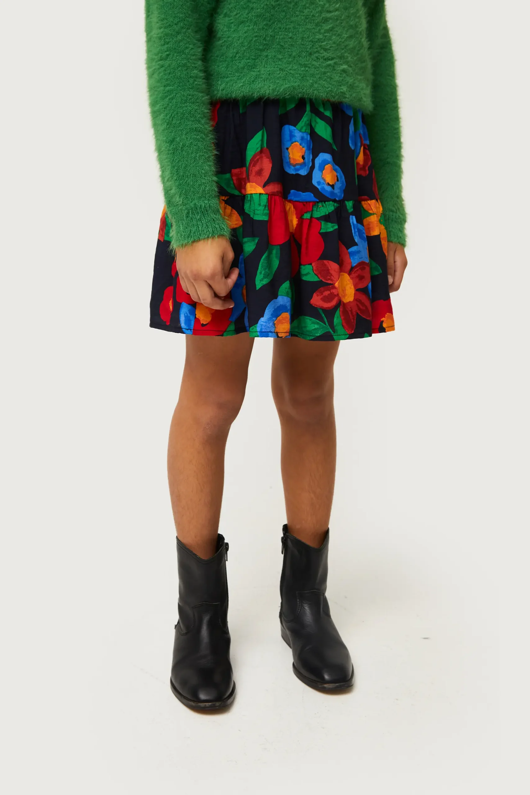 Falda corta de niña en crepé de viscosa con estampado de flores multicolor. Con cintura elástica. Detalle de corte horizontal. Forro interior. La modelo mide 137 cm y lleva la talla 8.