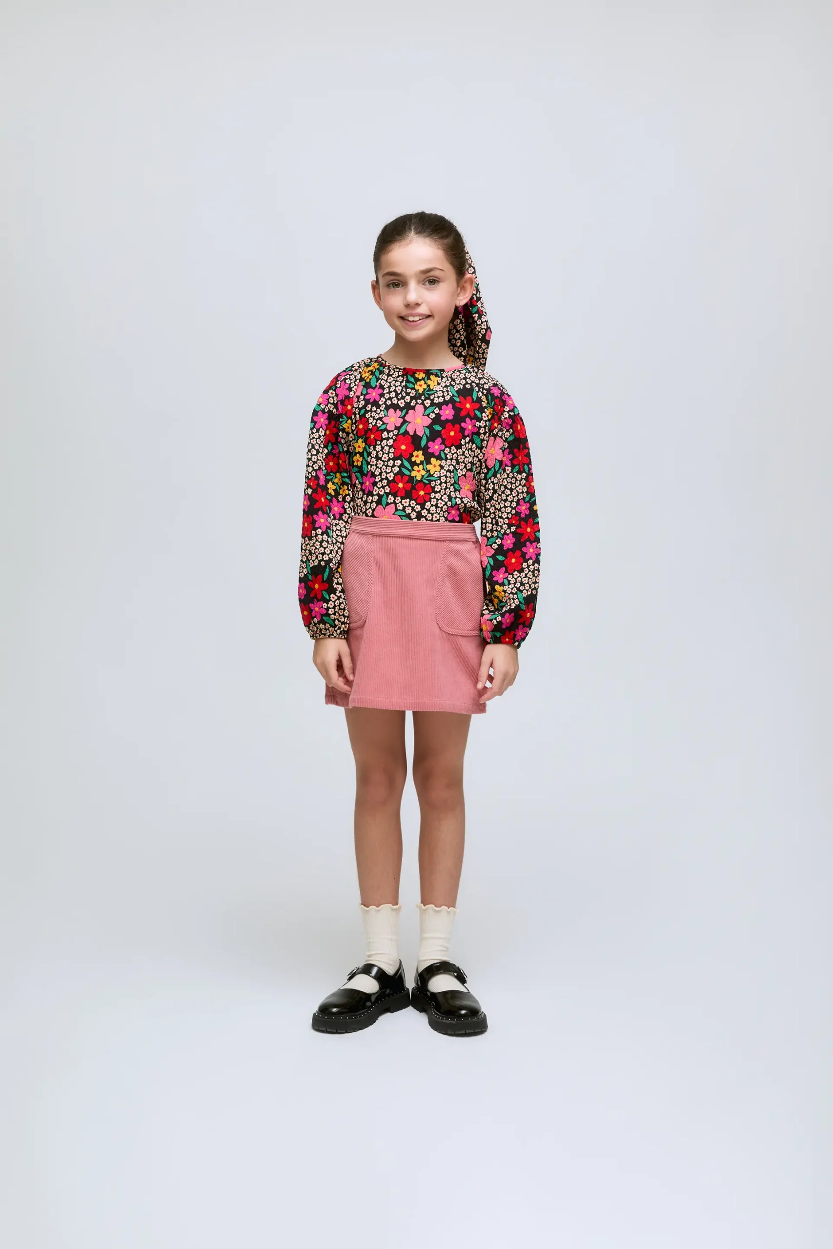 Falda corta de niña en pana de color rosa. Diseño evasé con dos bolsillos delanteros. La cintura es elástica en la parte trasera.