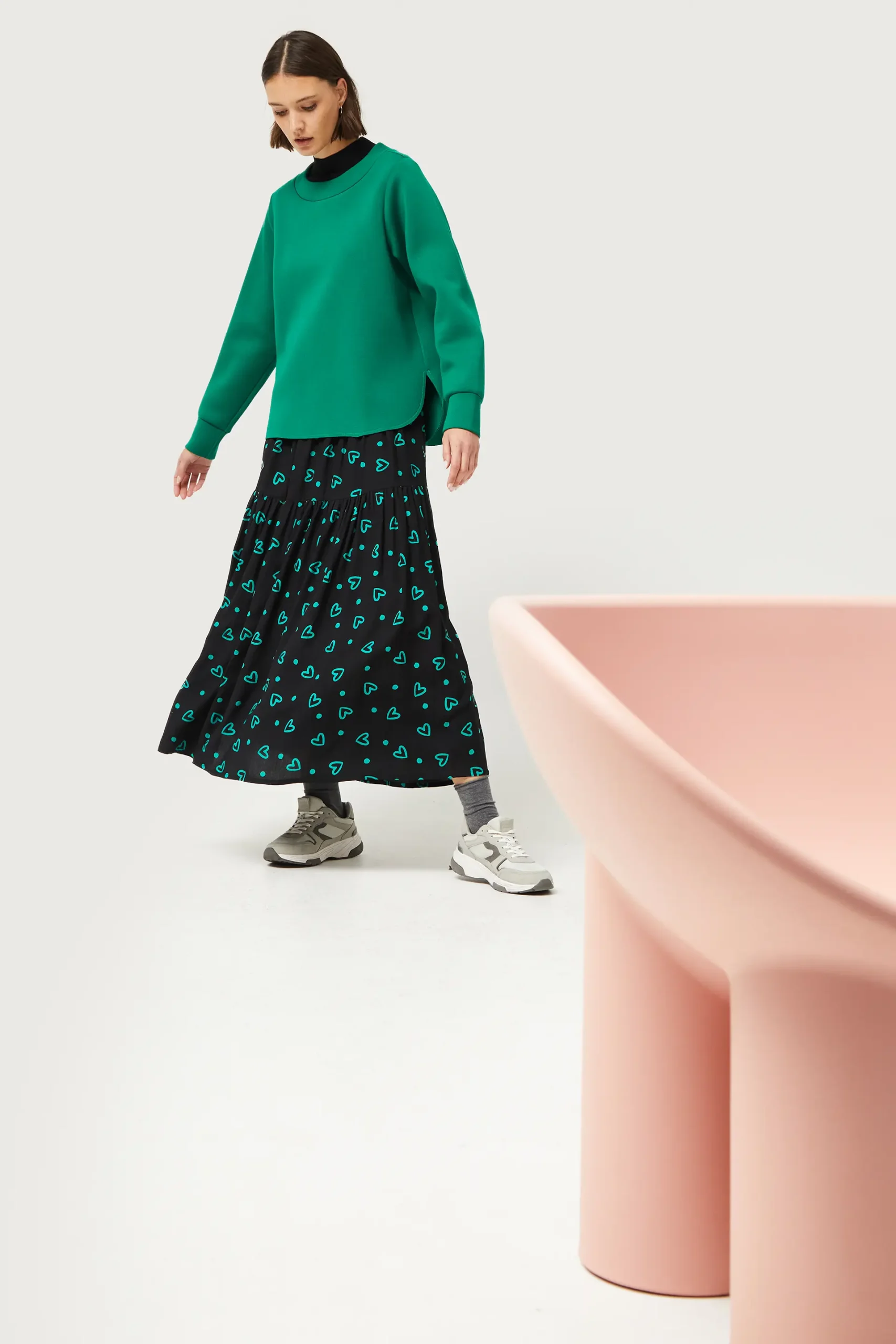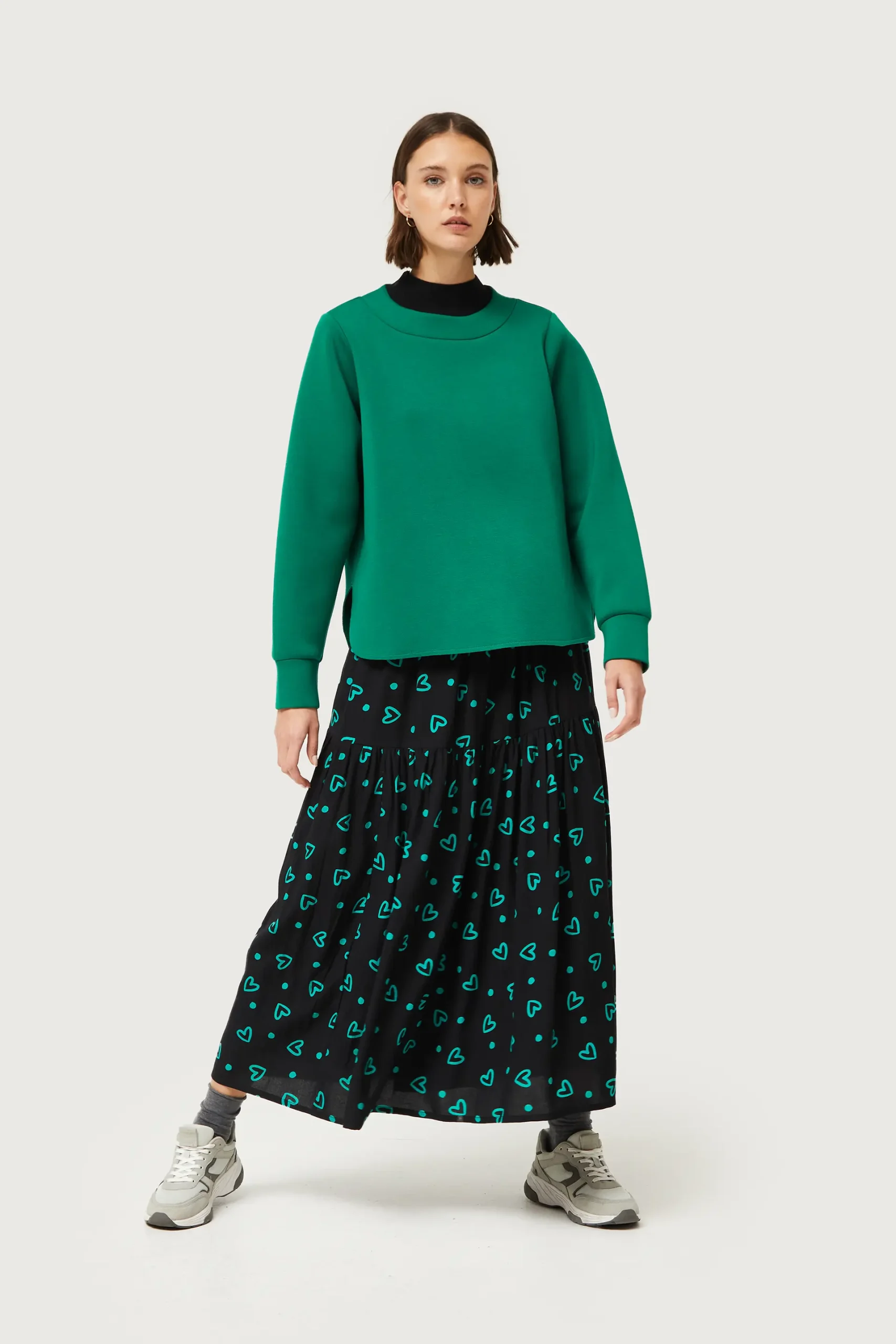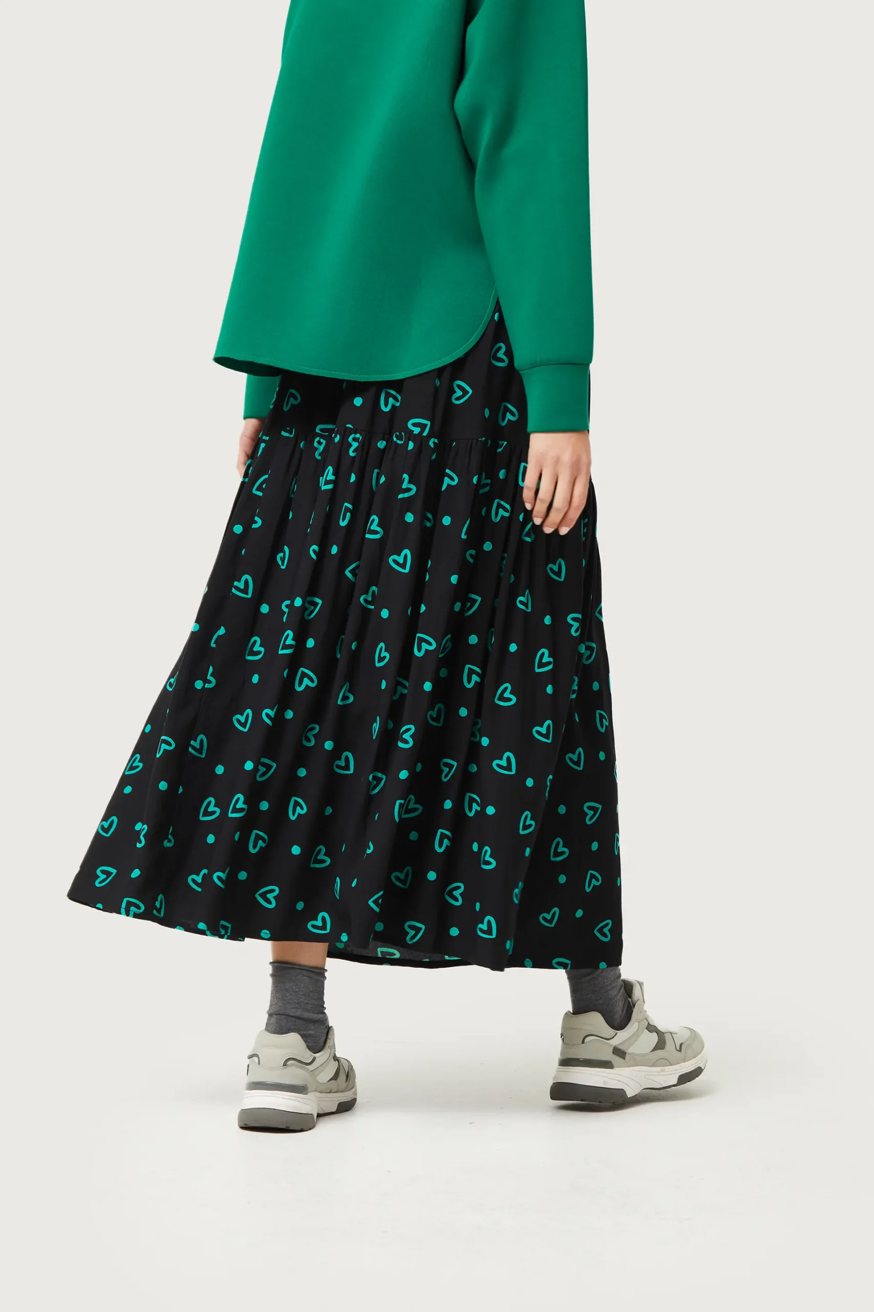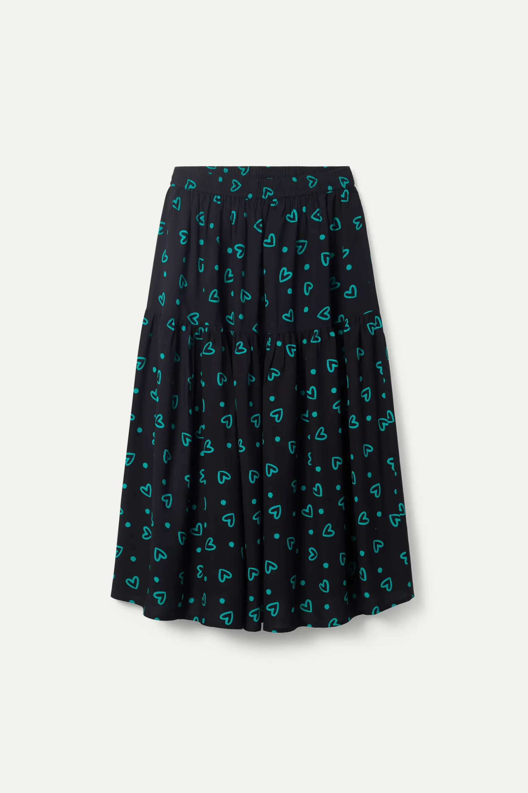 Falda larga de color negro con estampado de corazones verdes. Con cintura elástica. Forro interior. La modelo mide 176 cm y lleva la talla S.