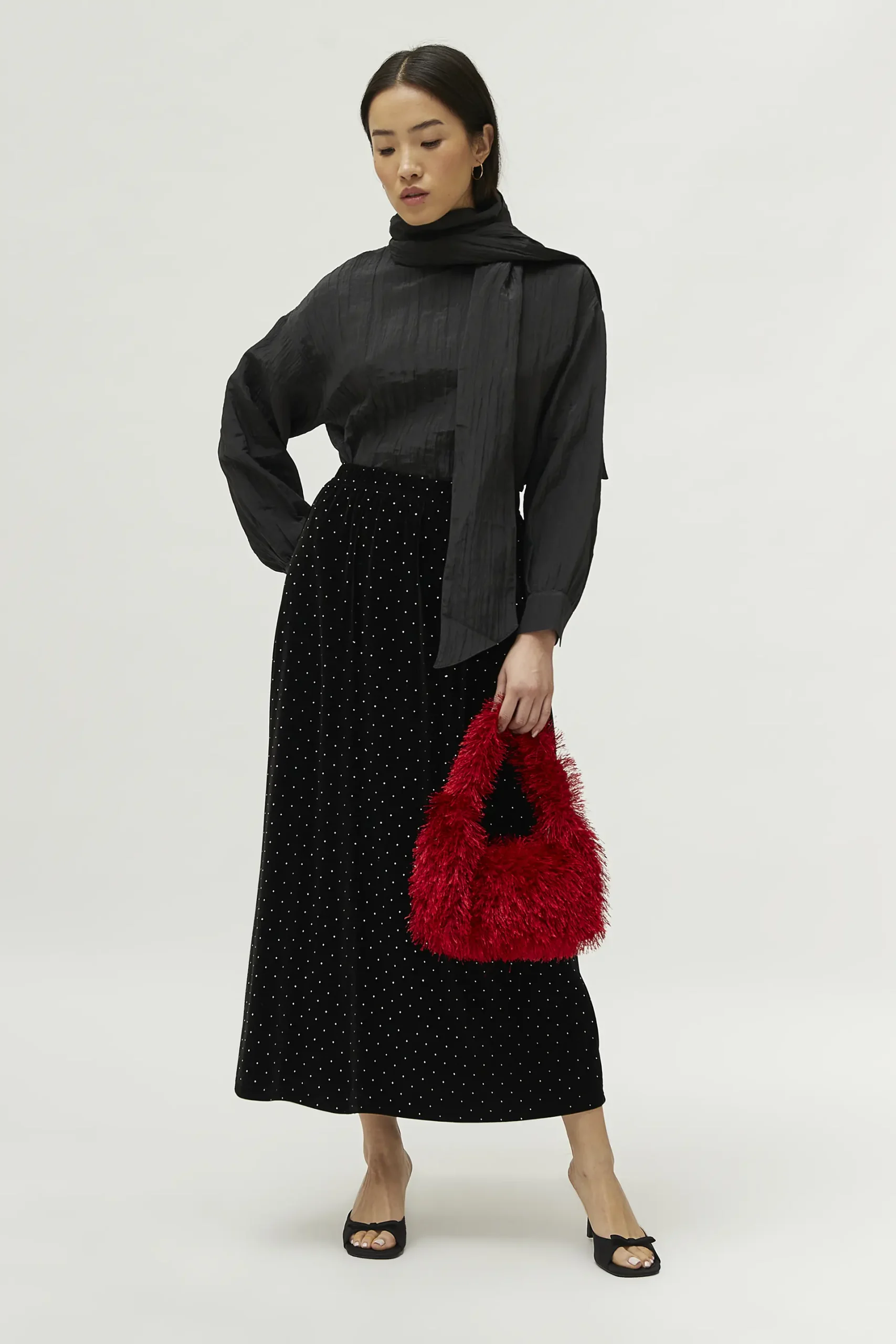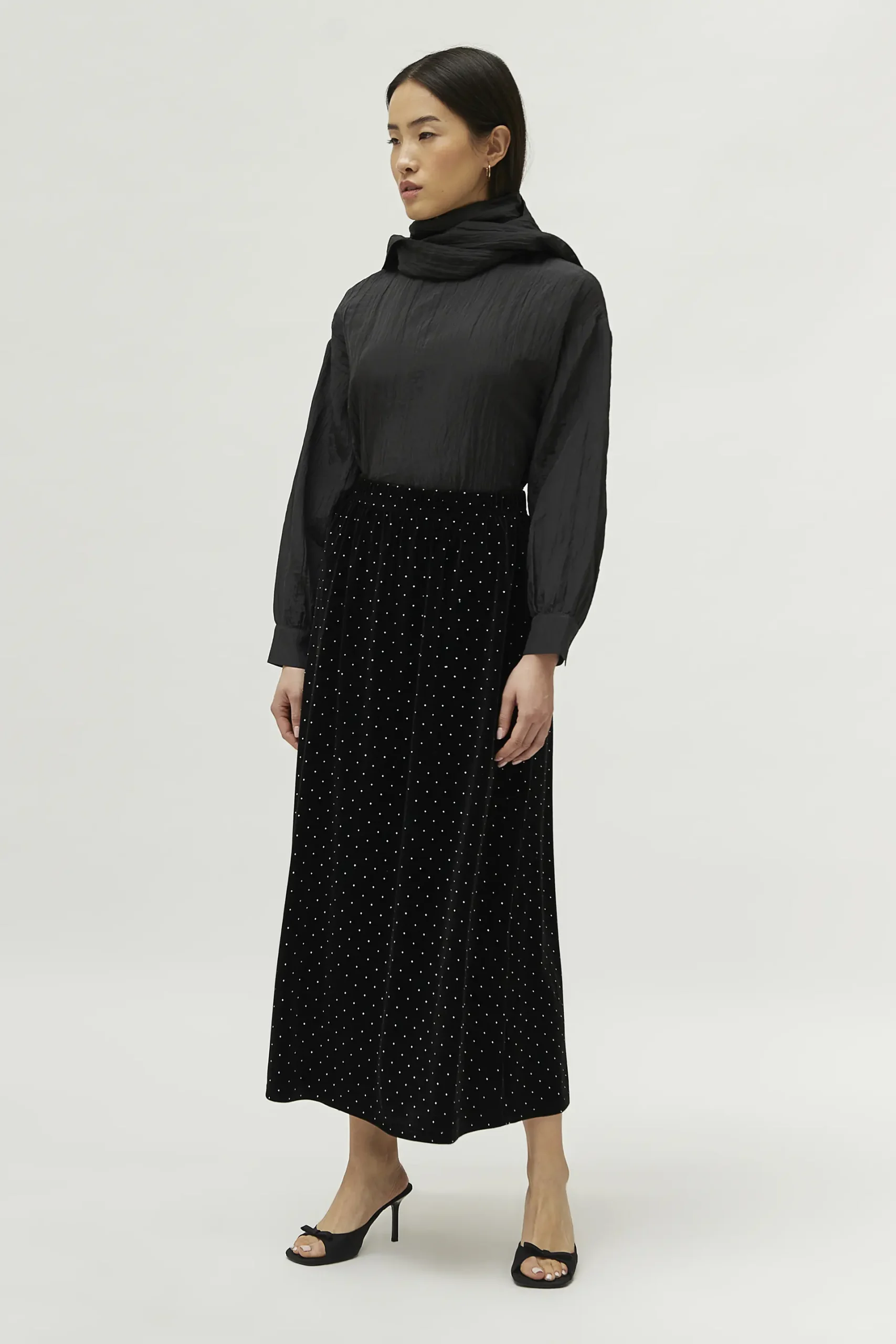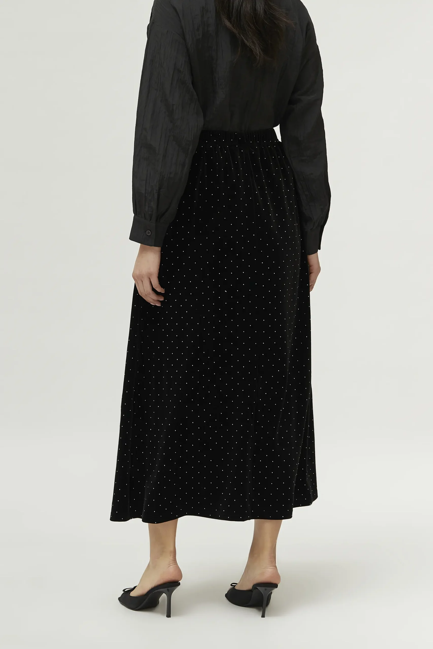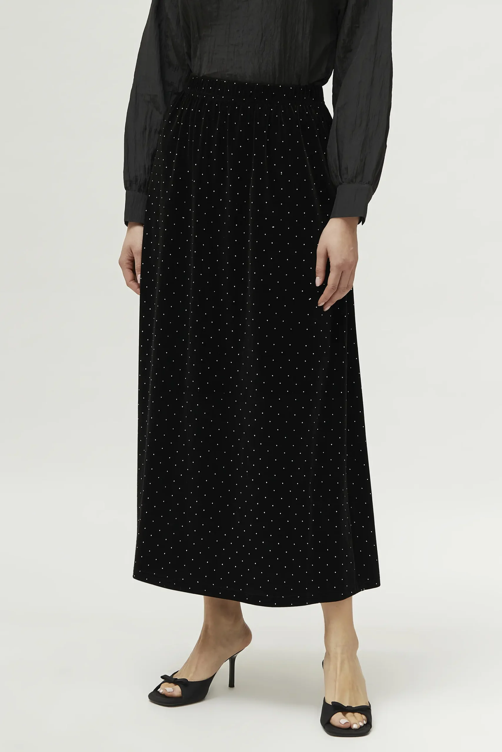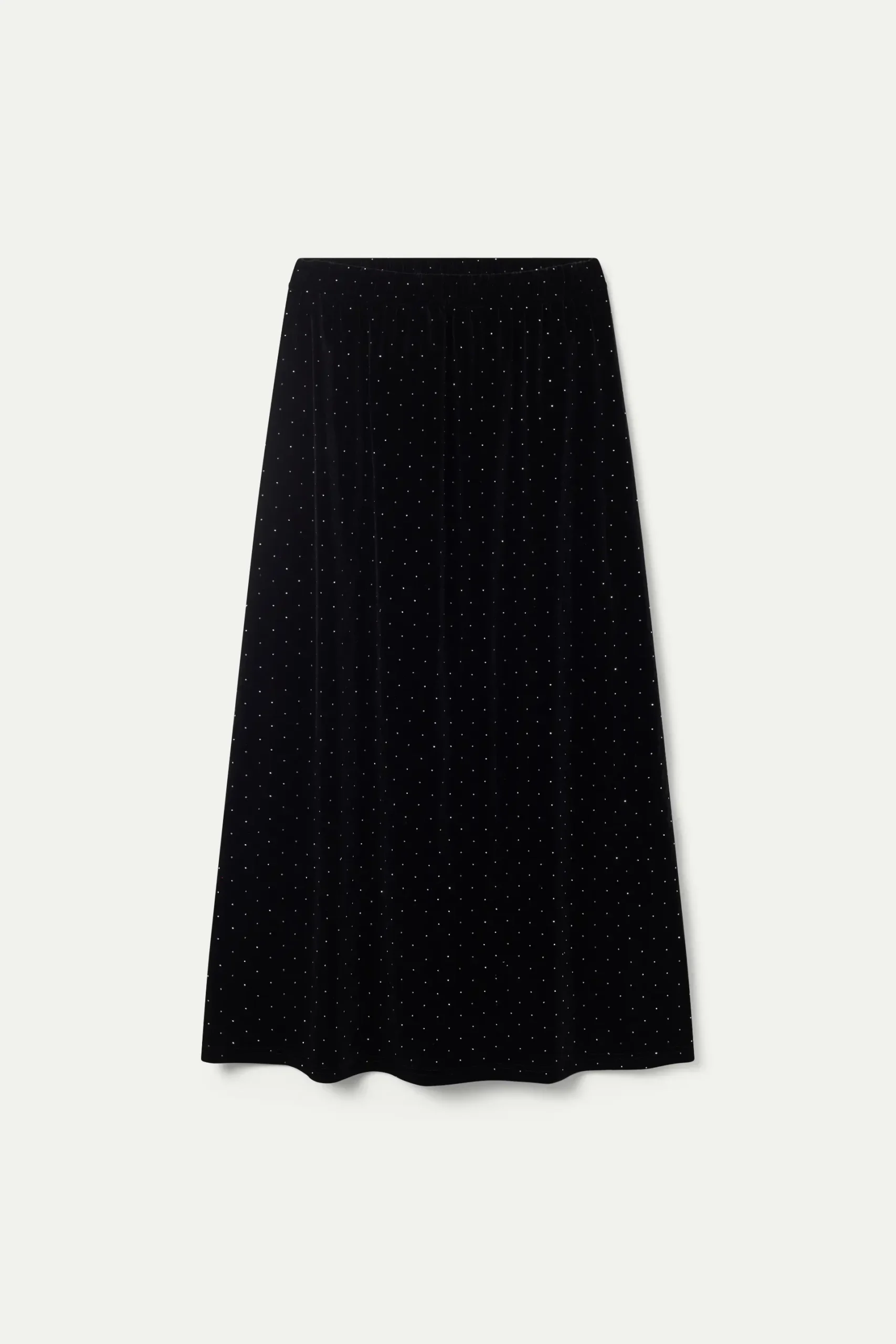 Falda larga de terciopelo de color negro. Con cintura elástica y detalle de abalorios. La modelo mide 171 cm y lleva la talla S.