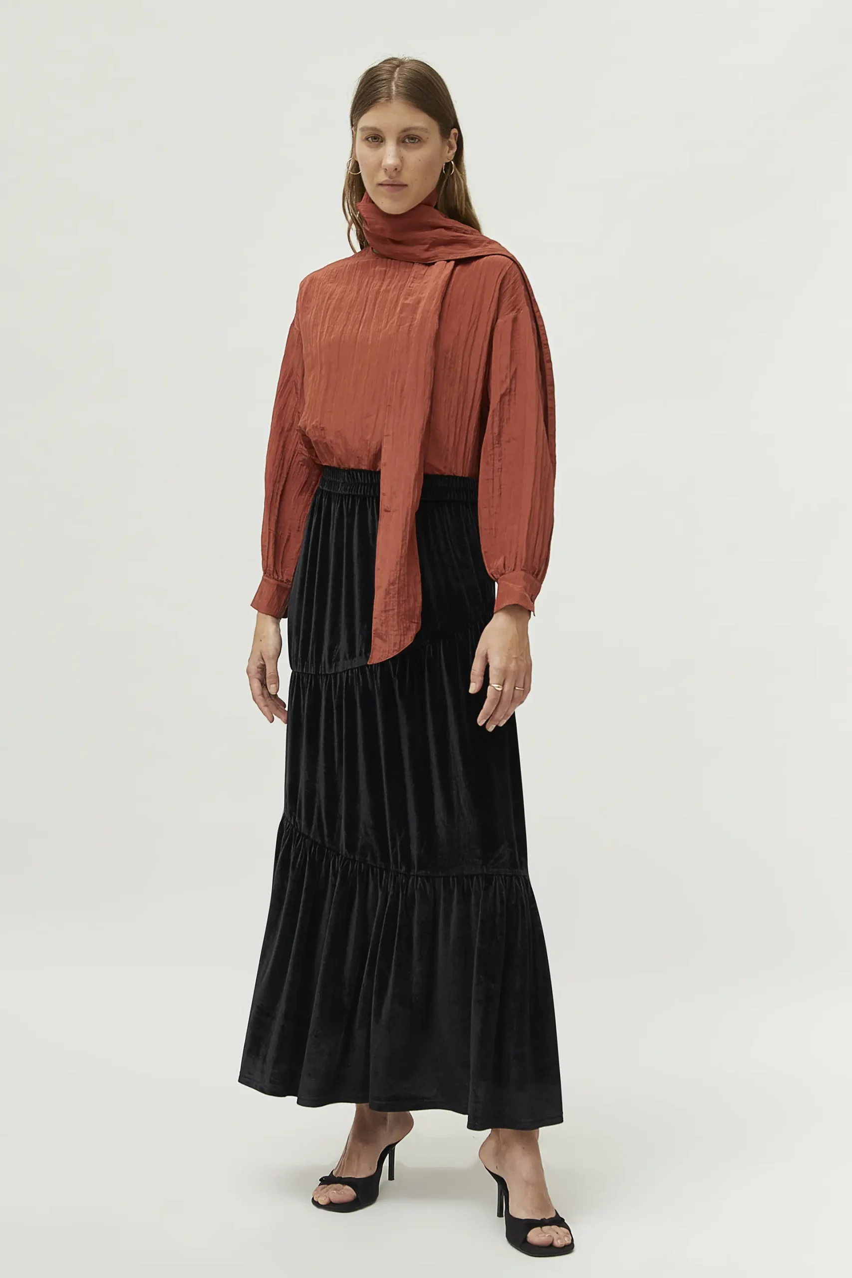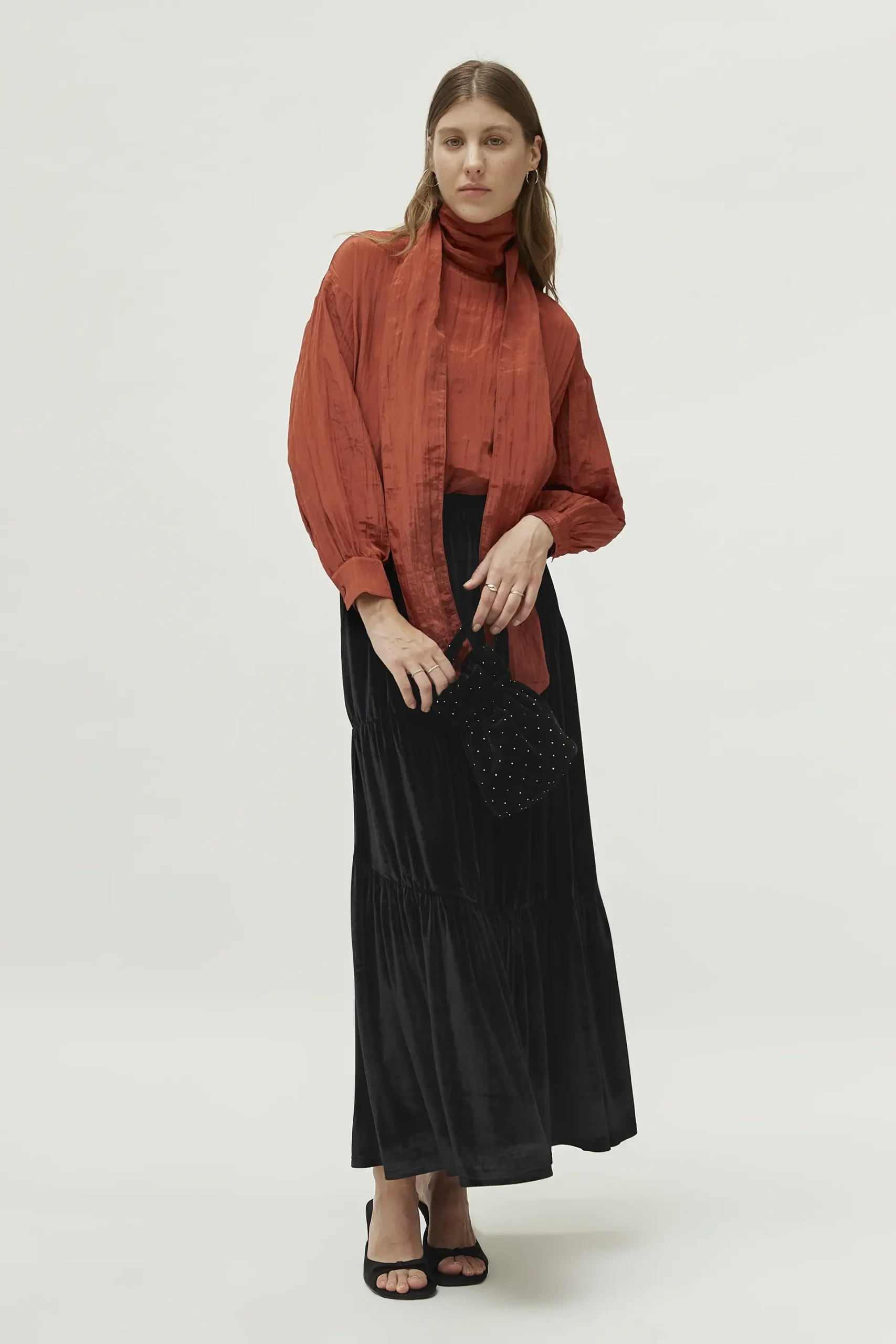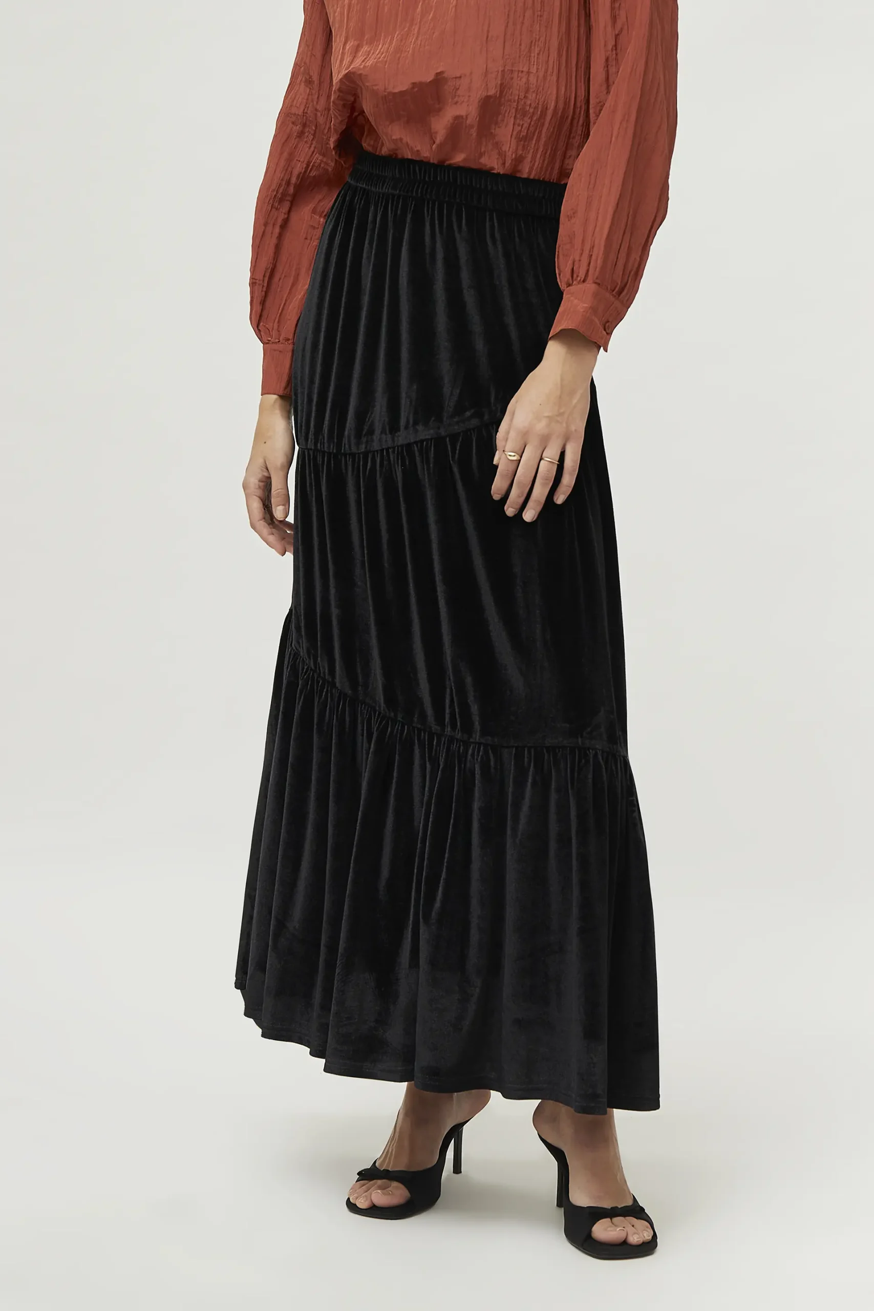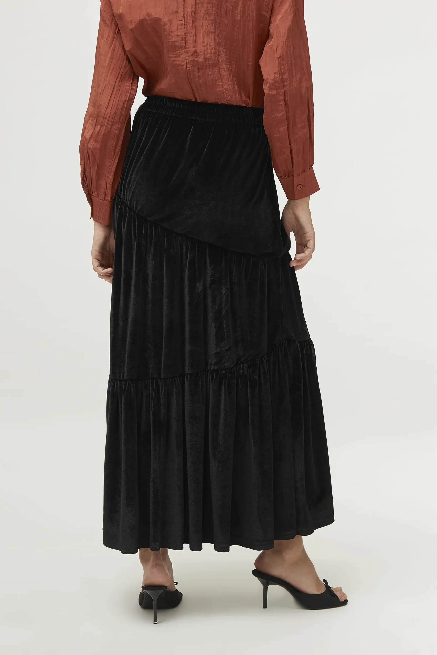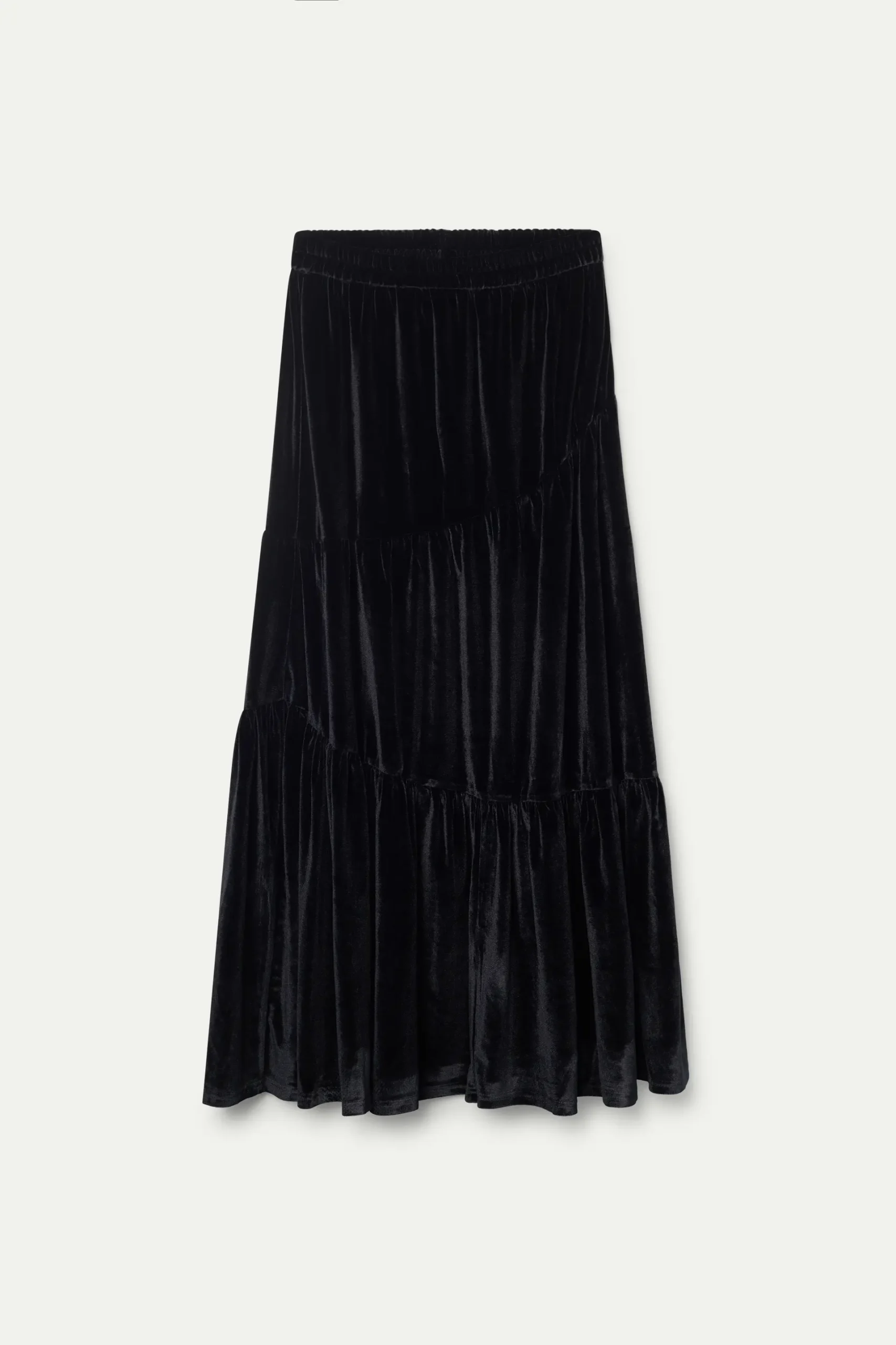 Falda larga de terciopelo de color negro. Con cintura elástica. Detalle de fruncidos. La modelo mide 177 cm y lleva la talla S.