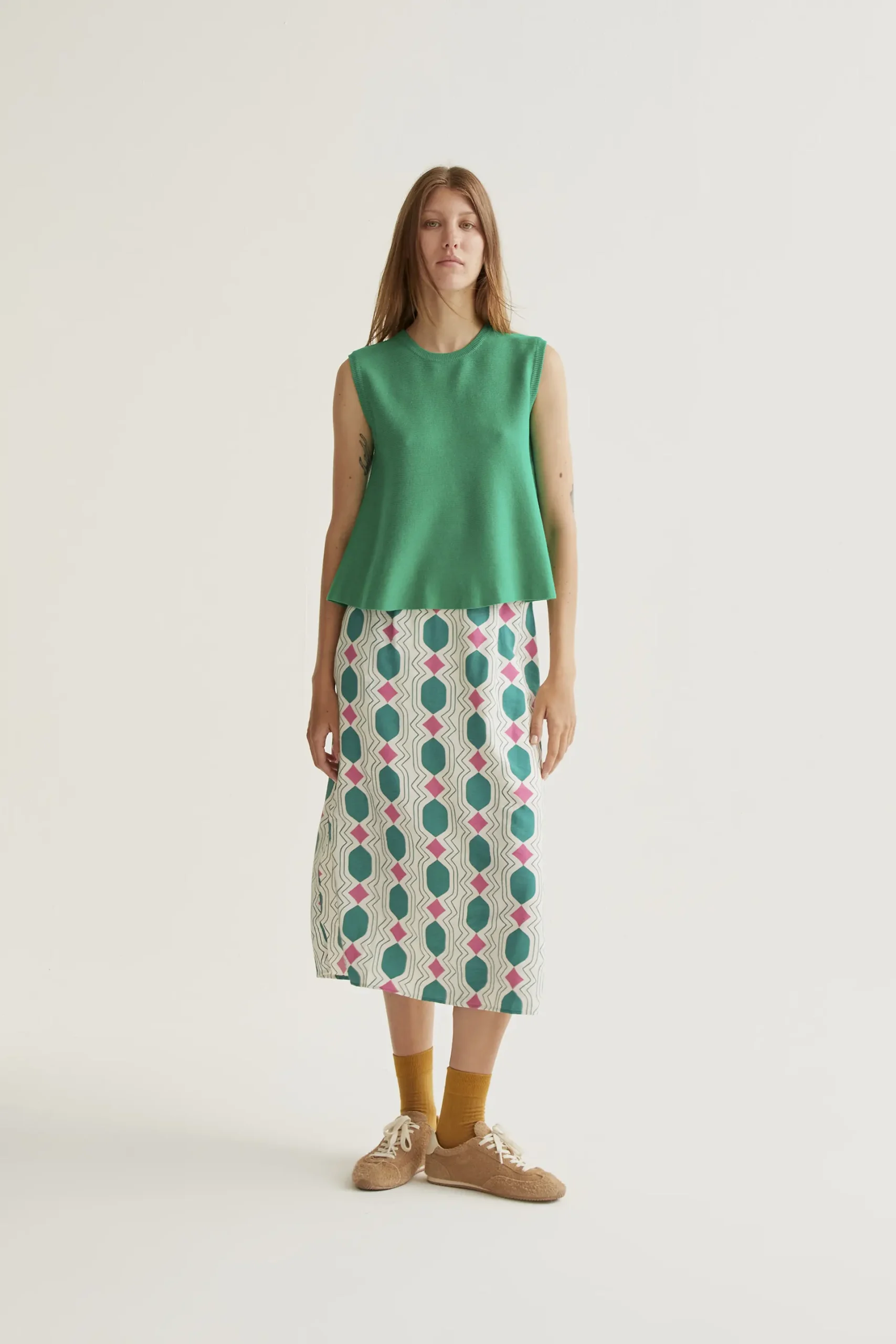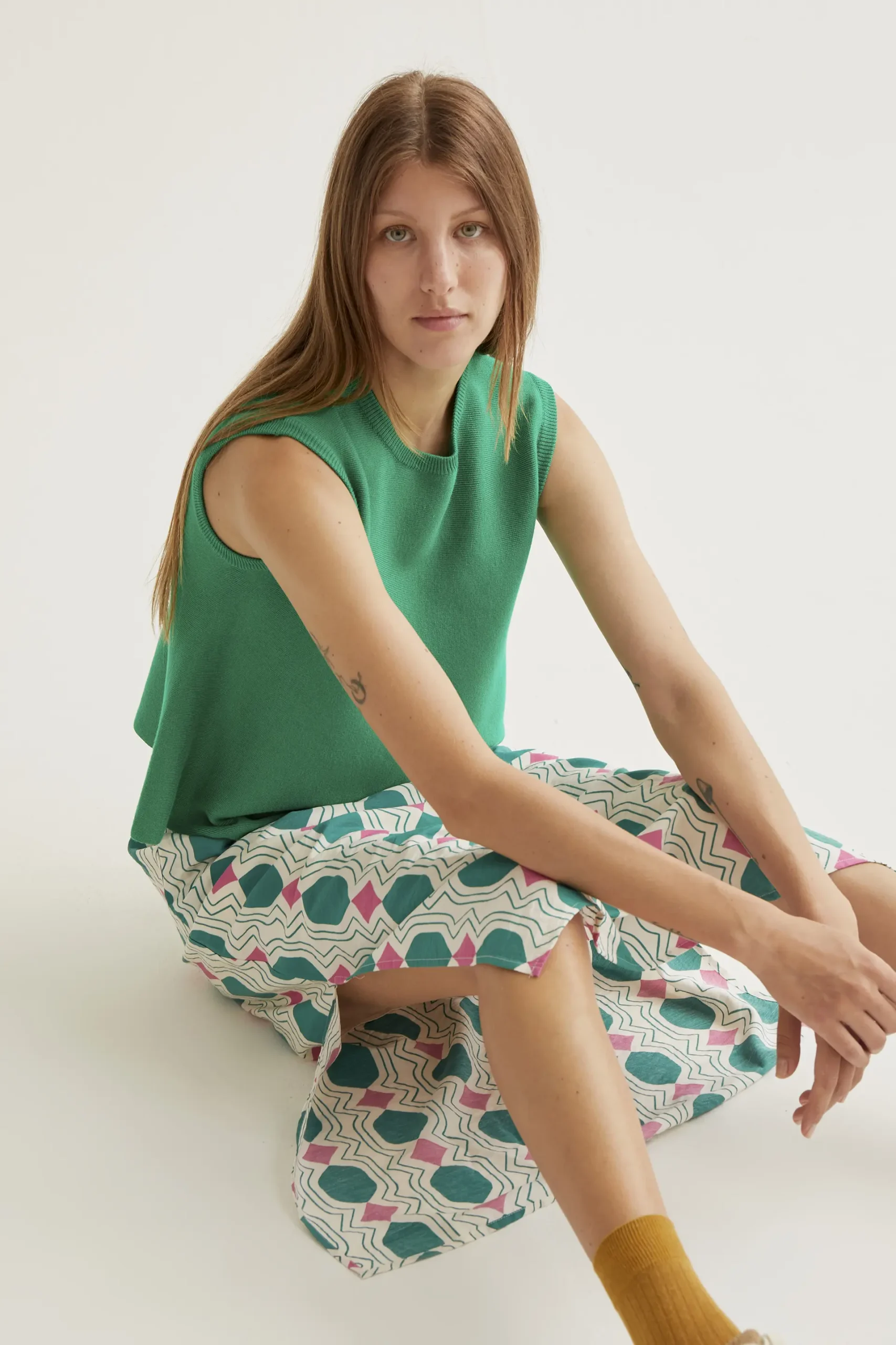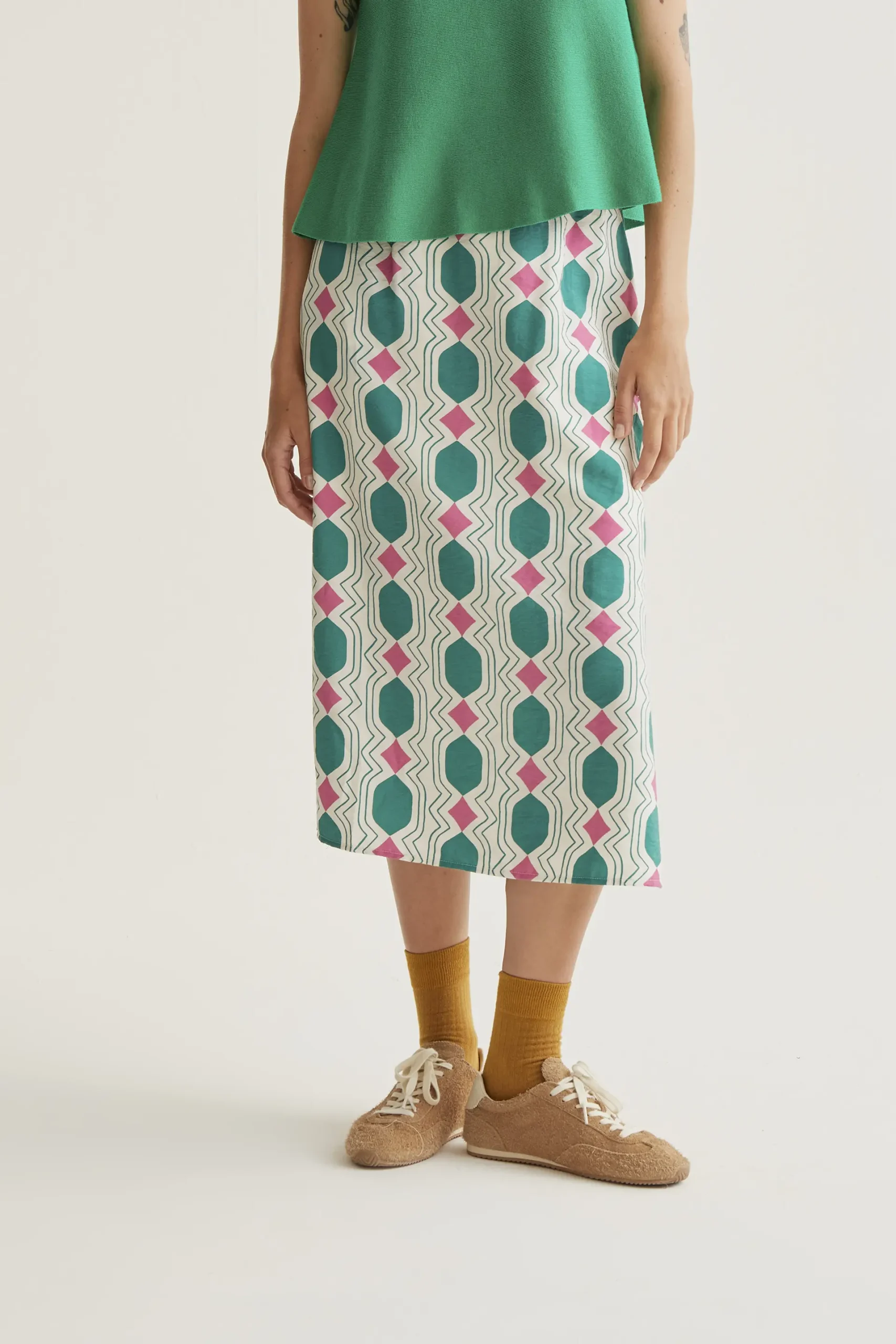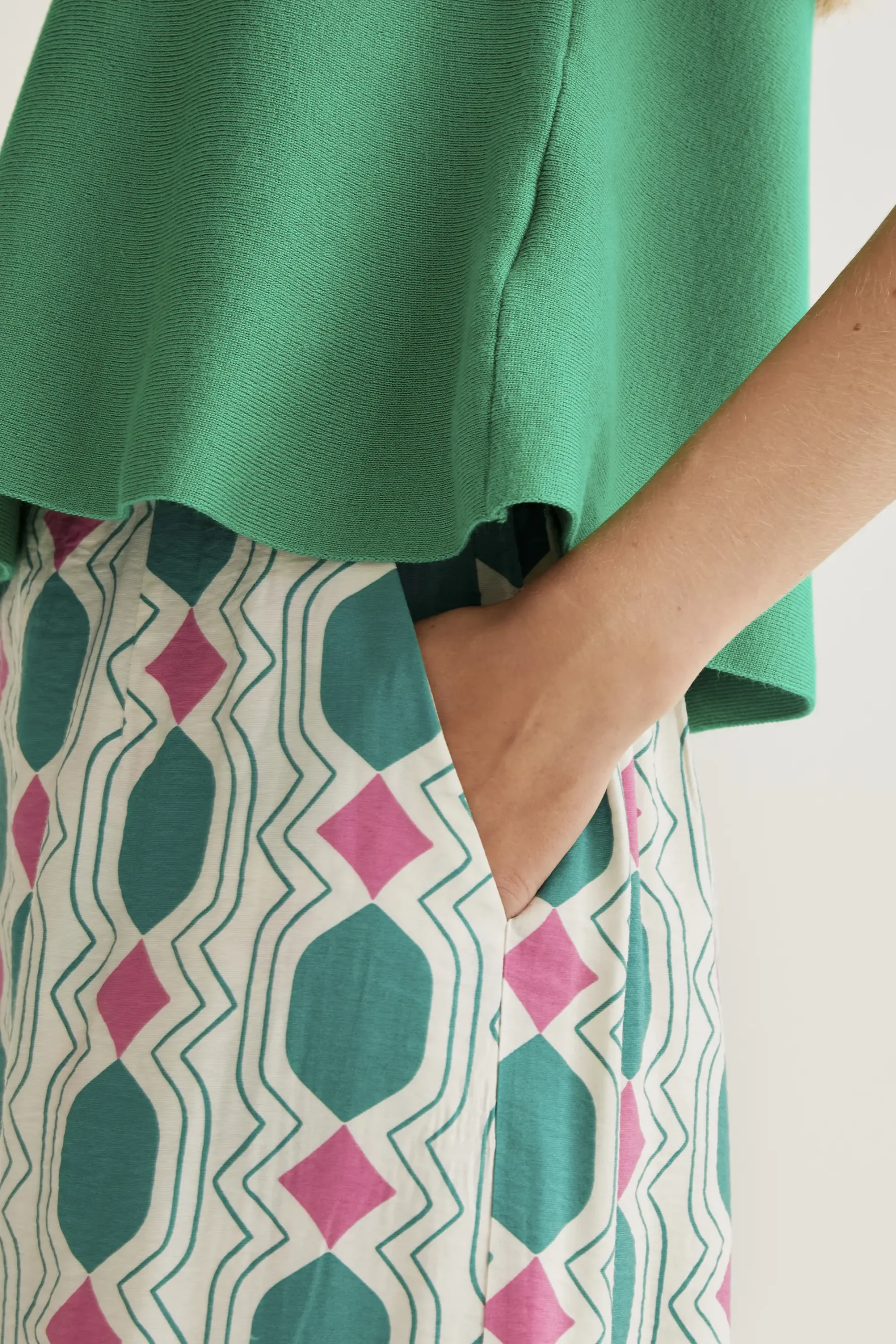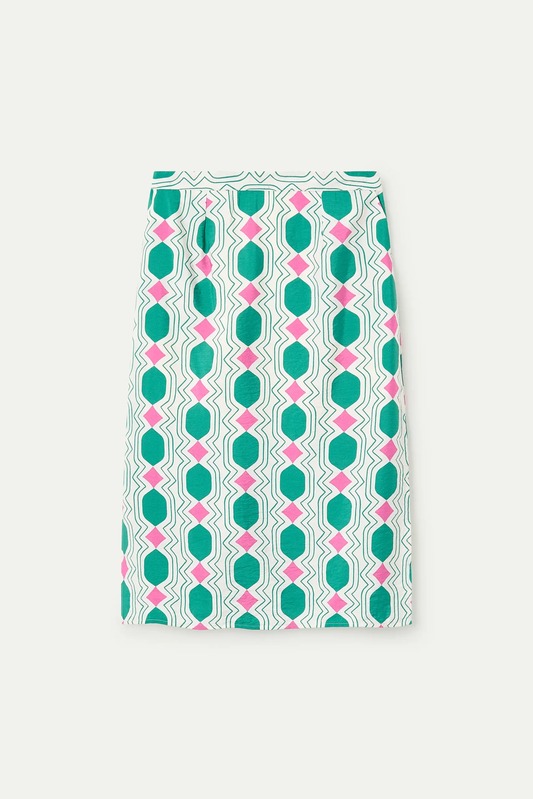 Falda midi con tejido crepé ligero con estampado geometric. Cintura fija elástica de tiro alto. Corte fluído. Ligera abertura lateral. Bolsillos laterales. Forro interior. La modelo mide 177 cm y lleva la talla S.