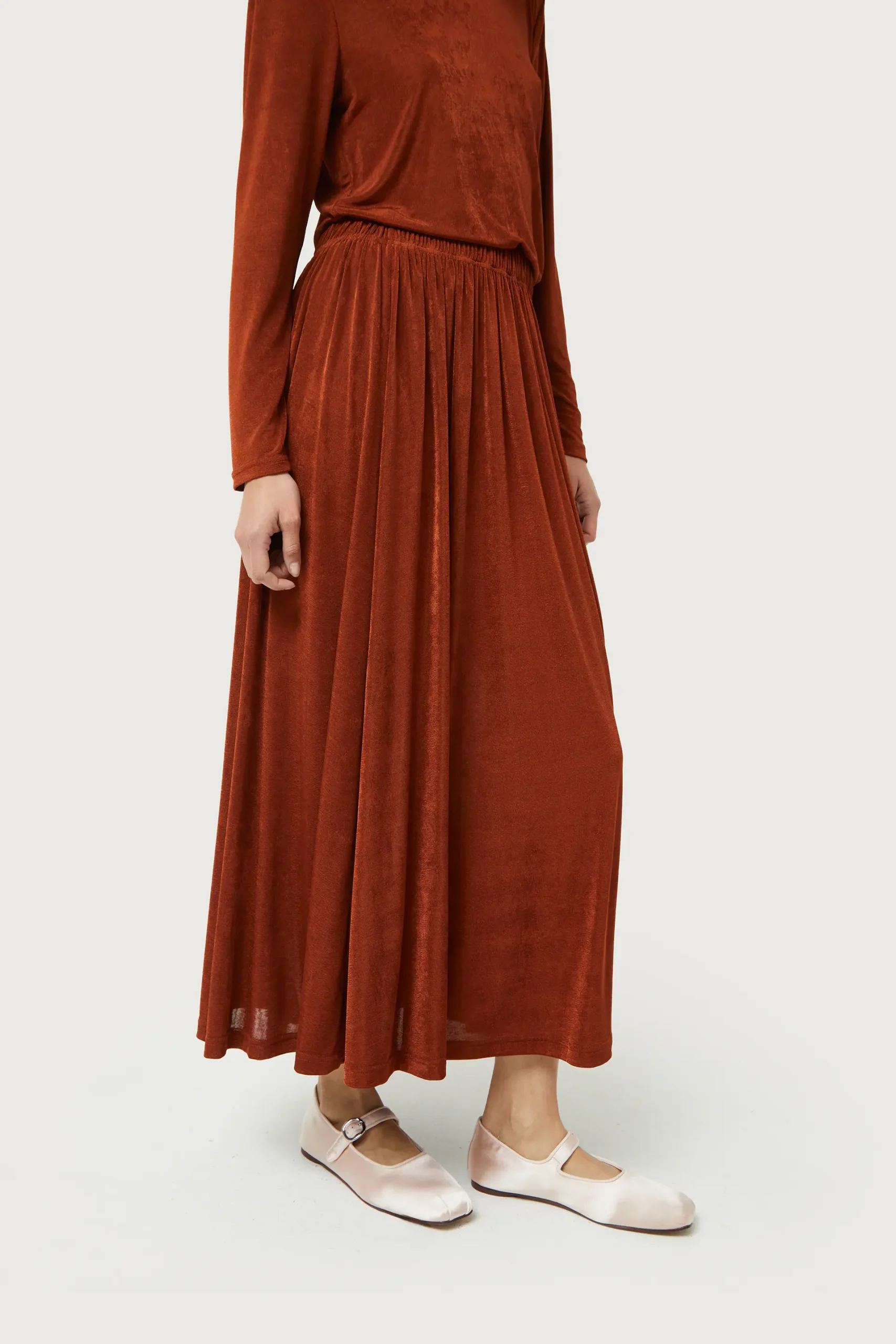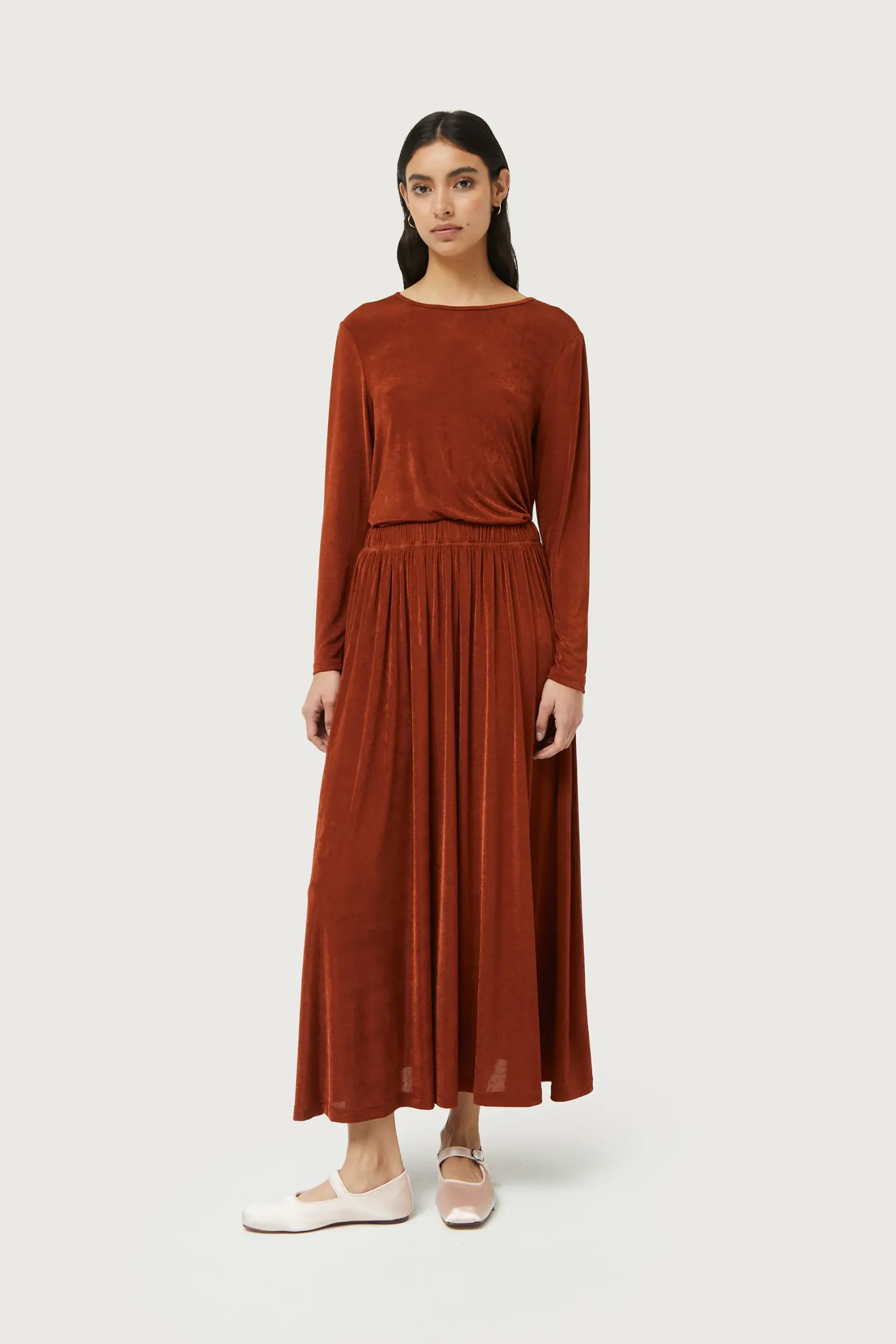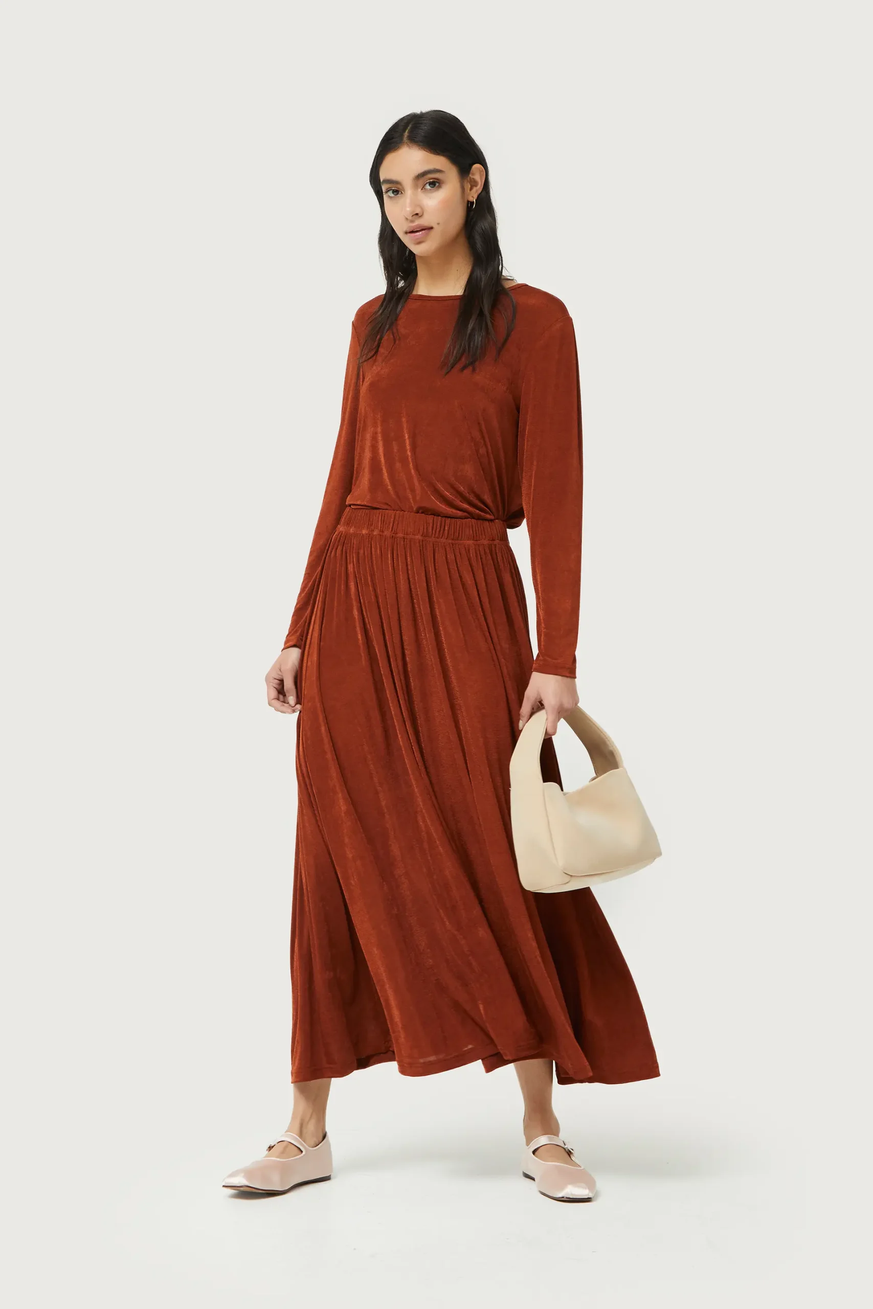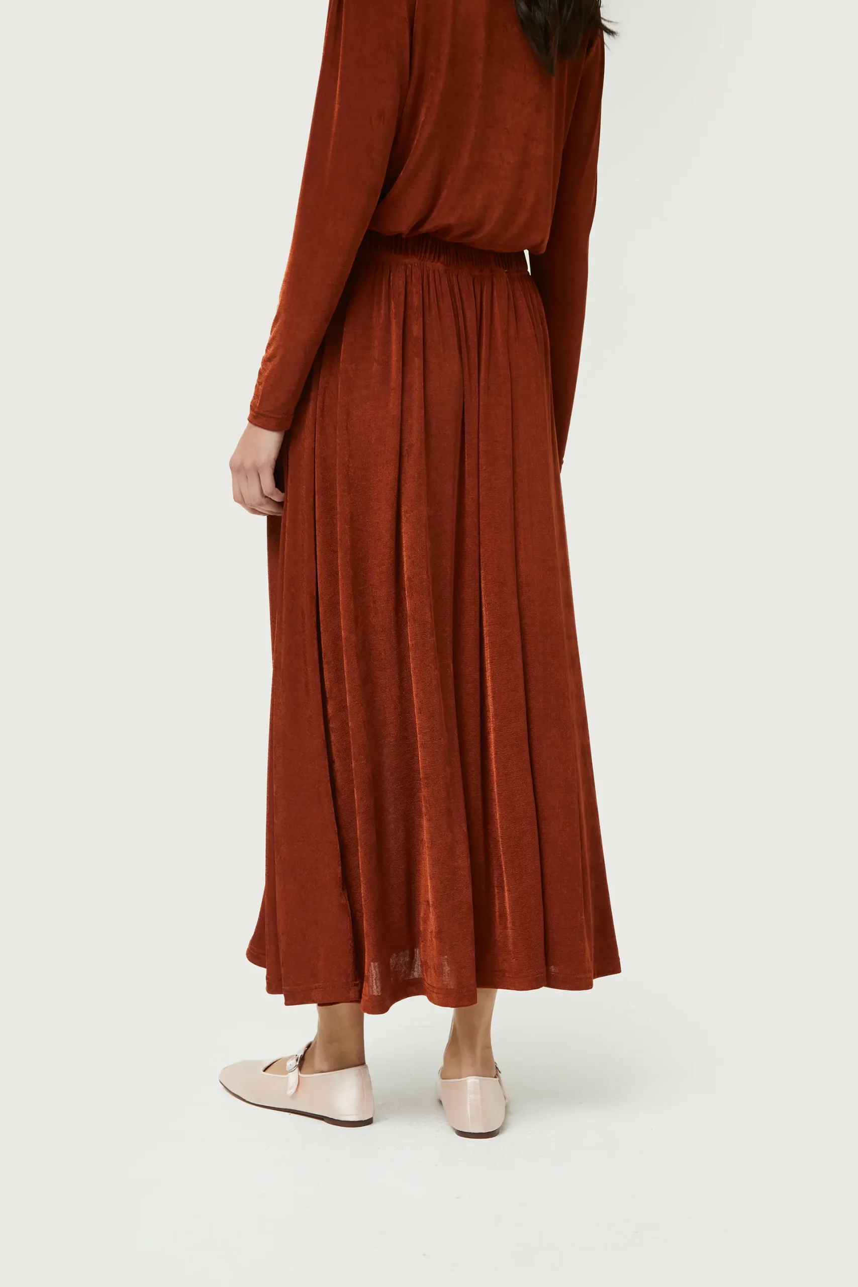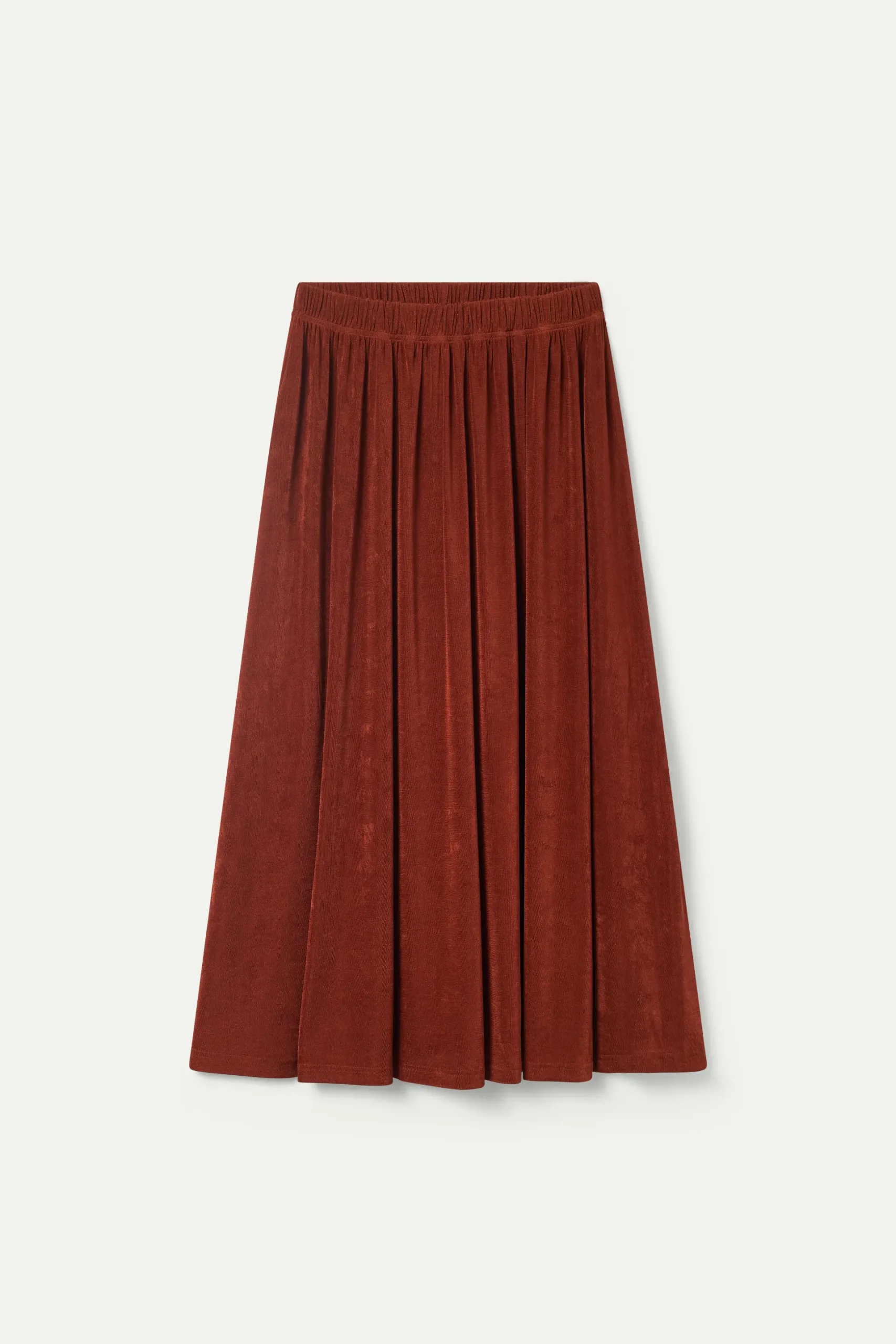 Falda midi de punto con acabado brillante de color marrón. Con cintura elástica. La modelo mide 176 cm y lleva la talla S.