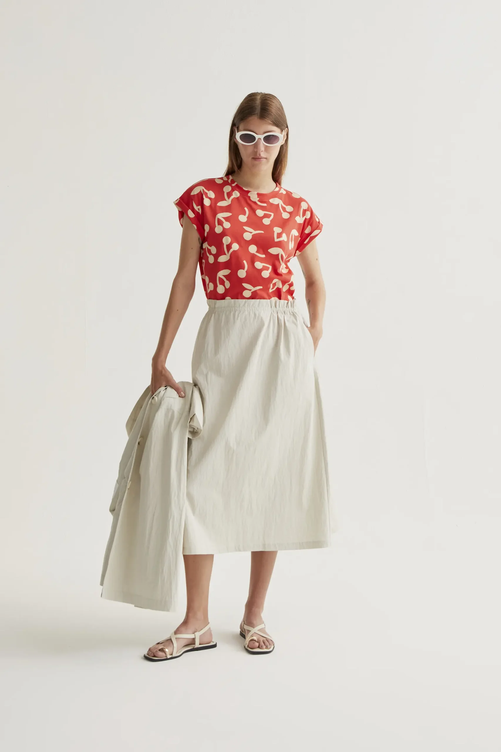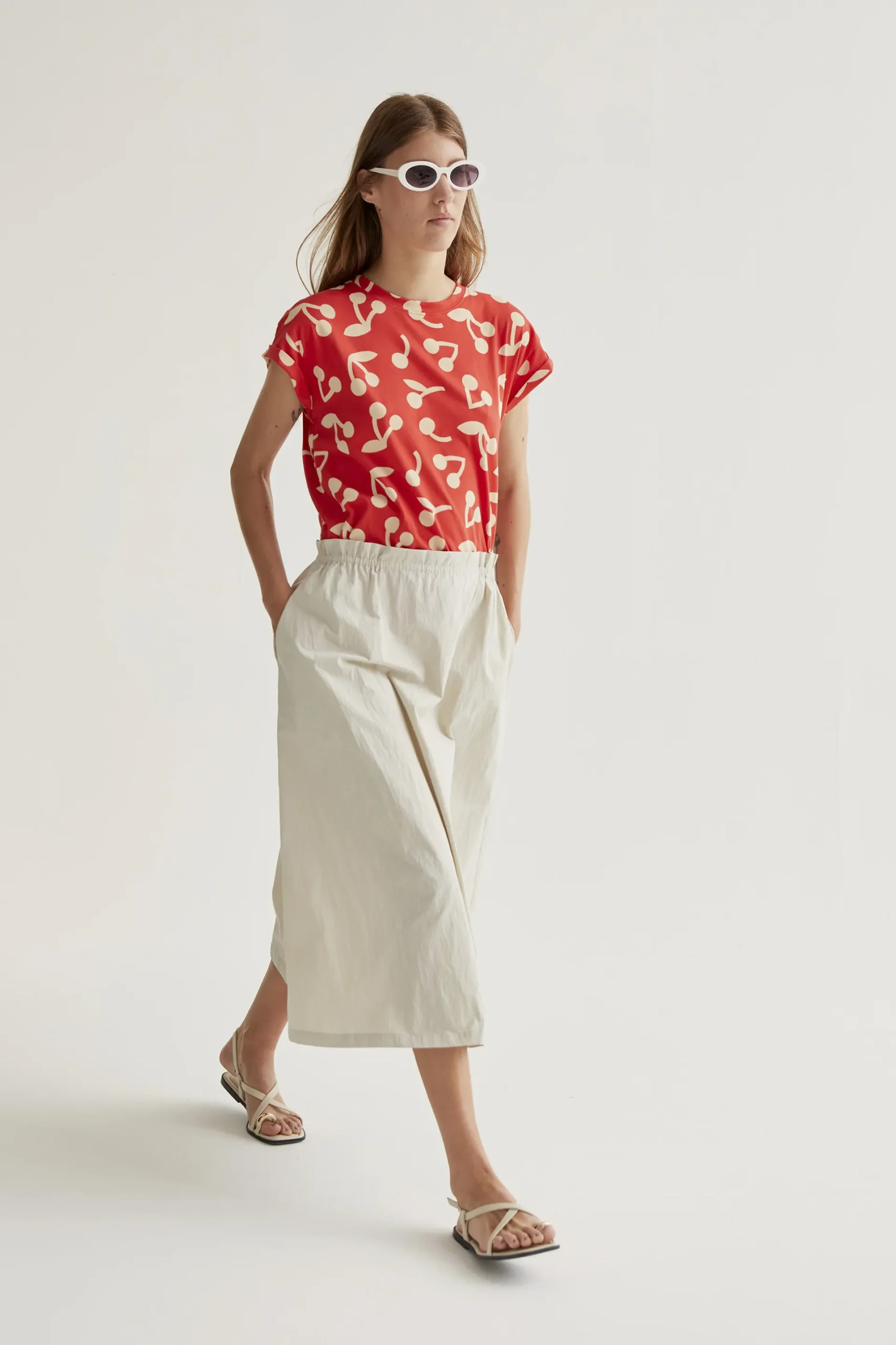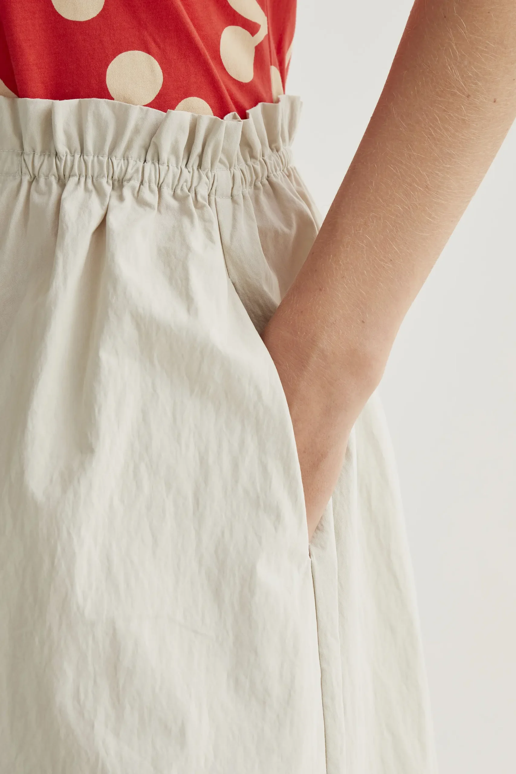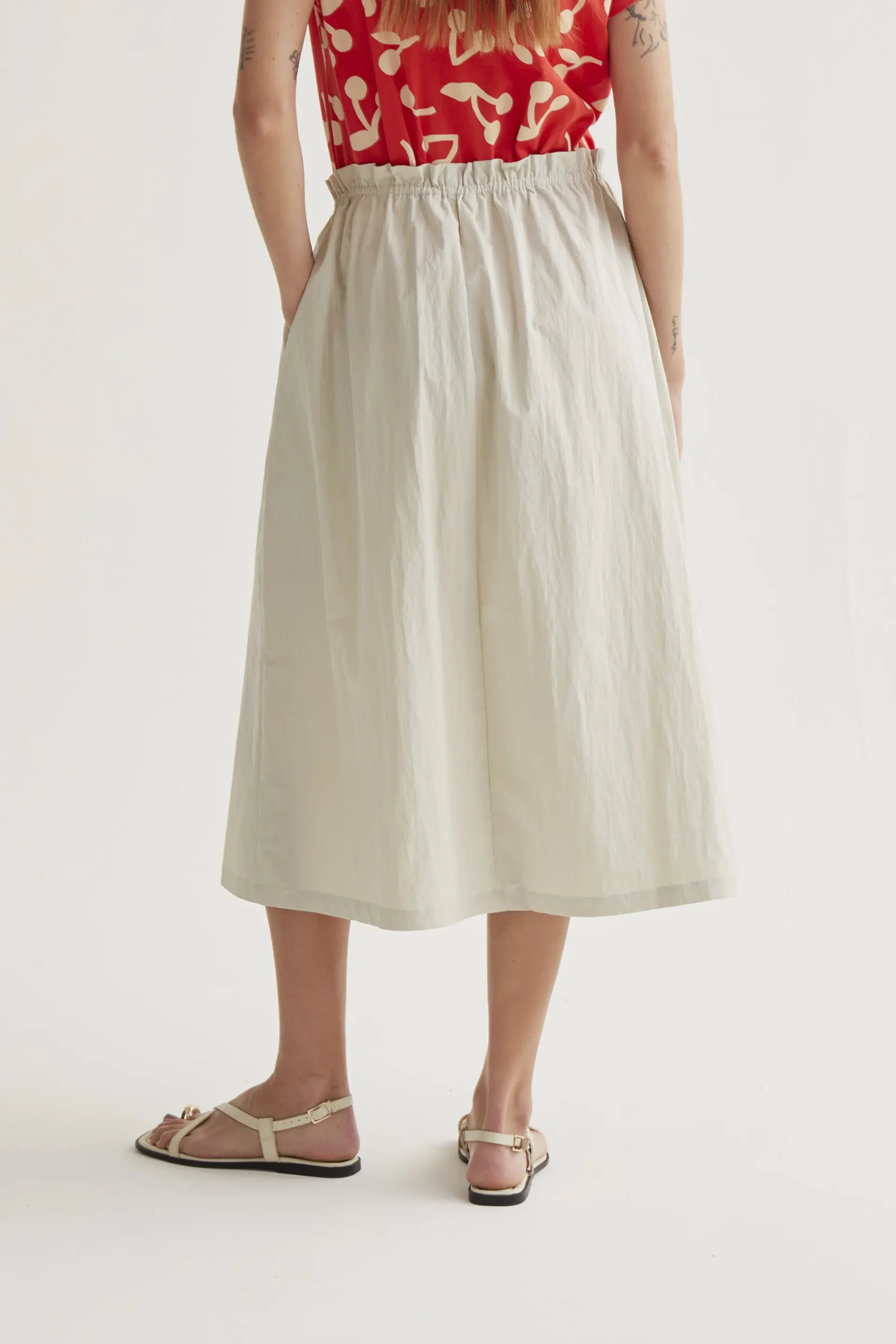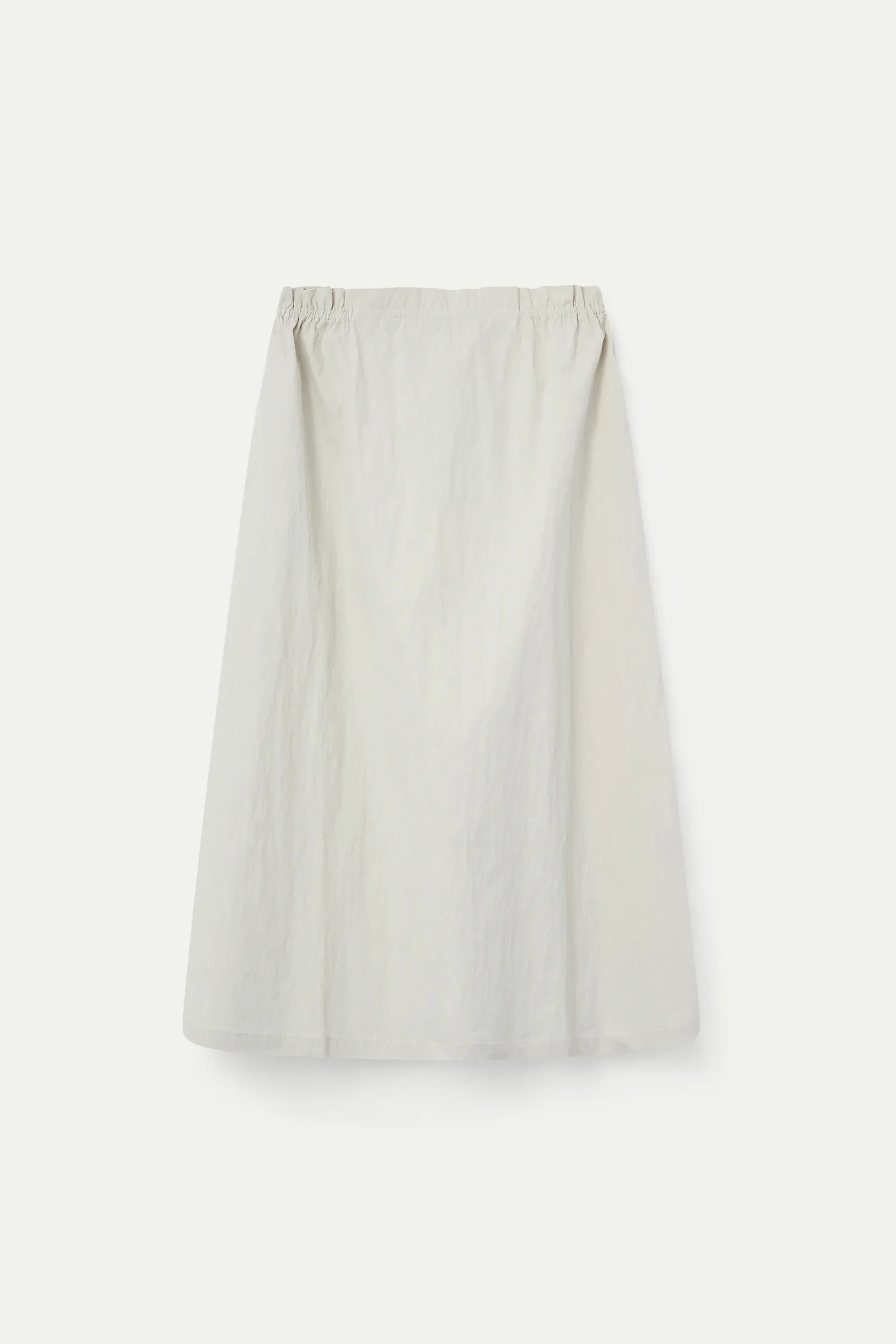Falda midi de tejido 70% algodón y 30% poliamida de color blanco roto. Cintura fija elástica de tiro alto. Bolsillos laterales. Corte amplio. La modelo mide 177 cm y lleva la talla S.