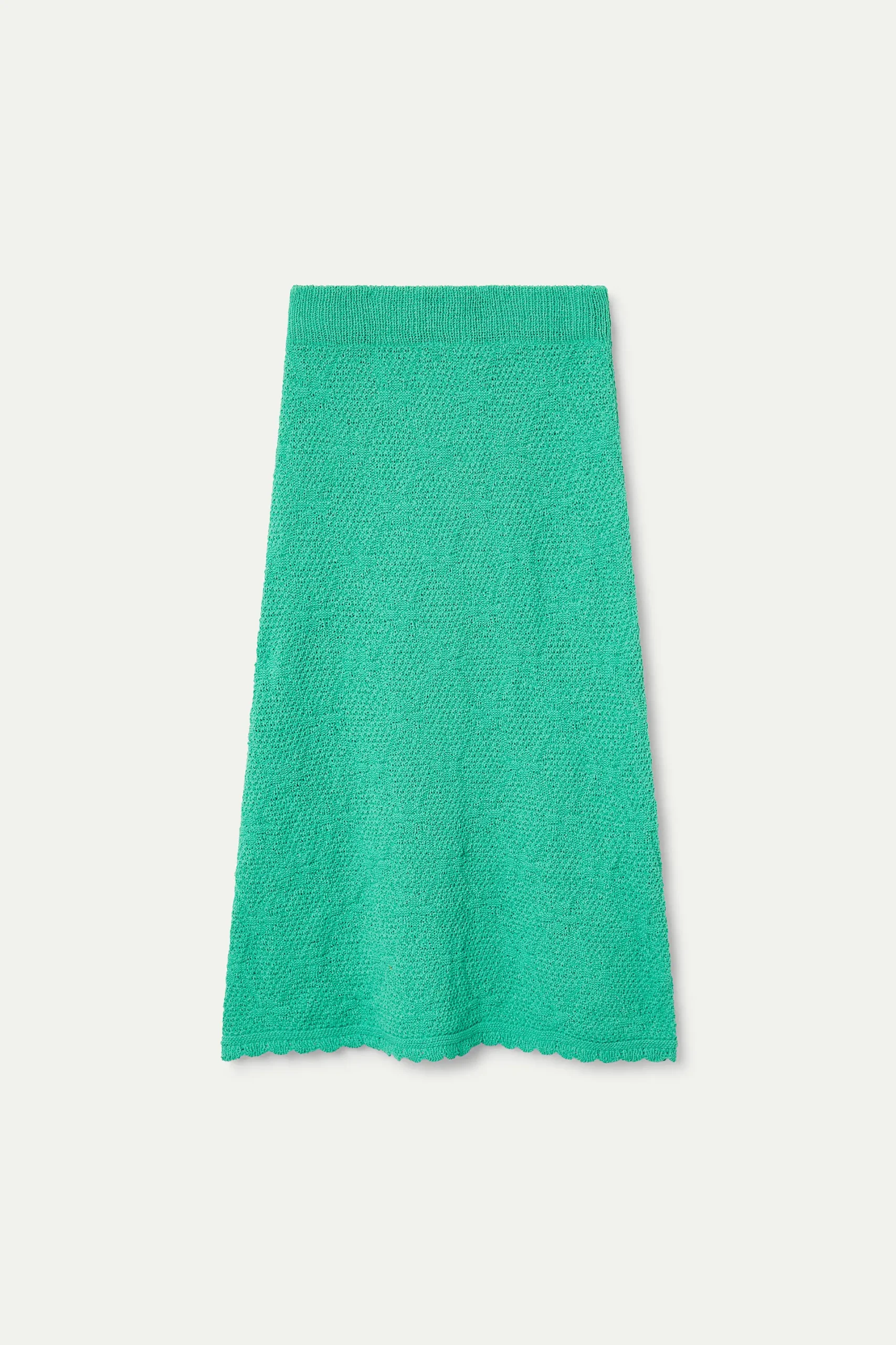 Falda midi con tejido de punto bordado encadenado de color verde. Cintura fija elástica de tiro alto. Detalles en relieves bordados.La modelo mide 177 cm y lleva la talla S.
