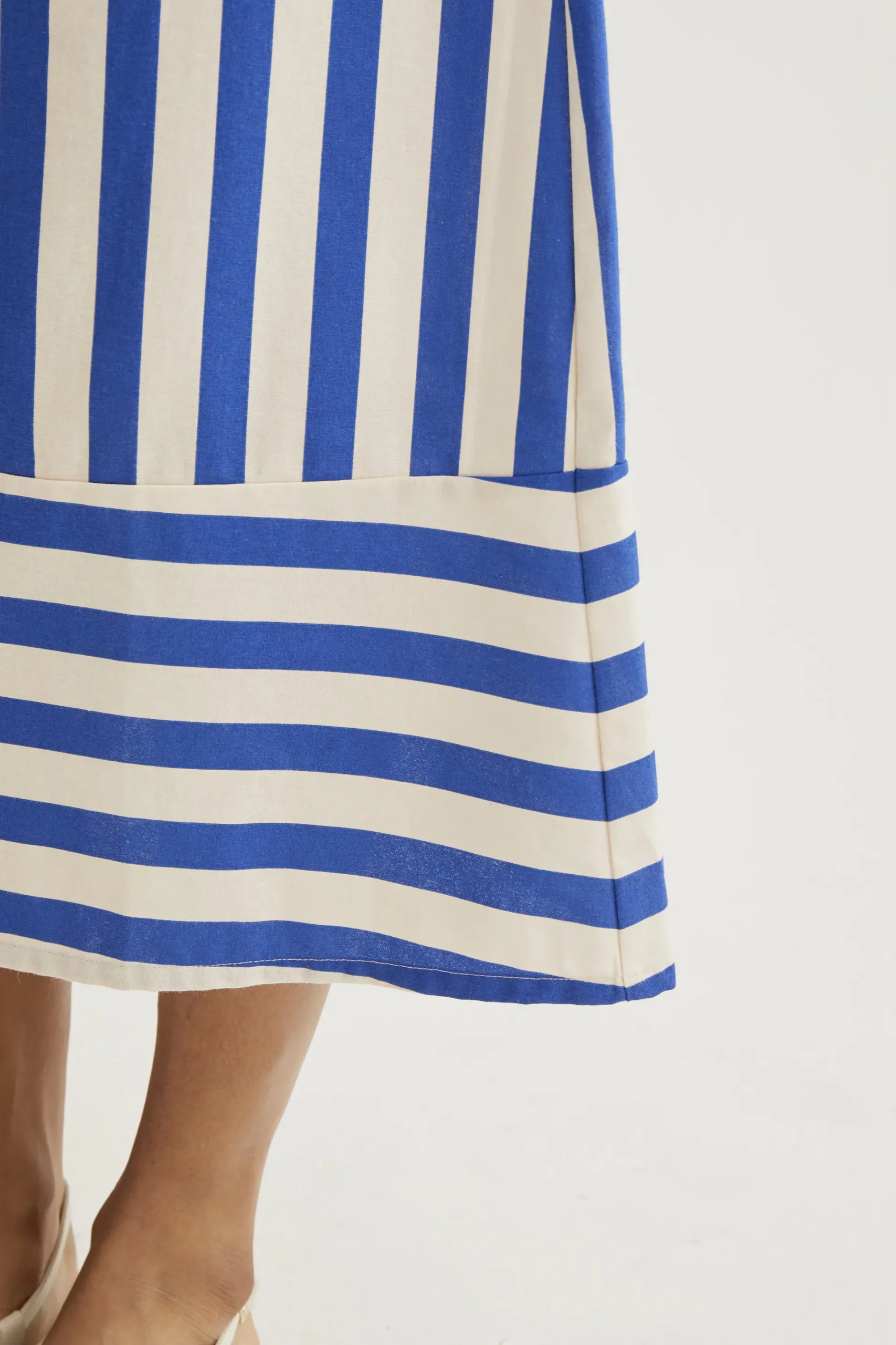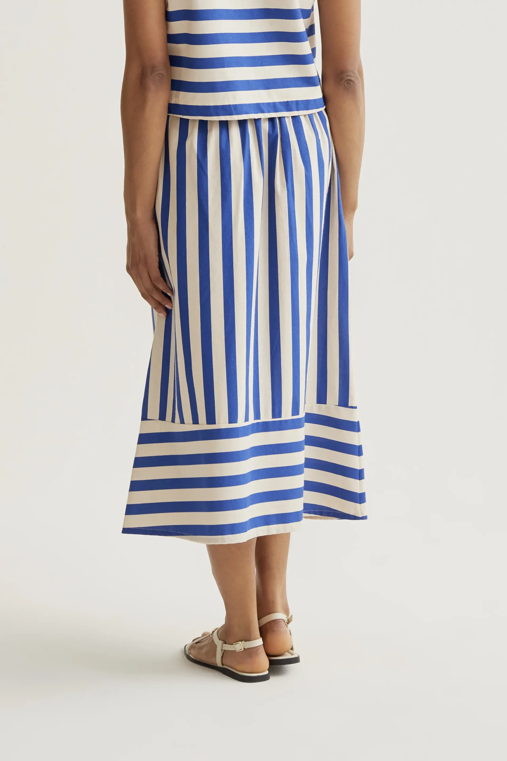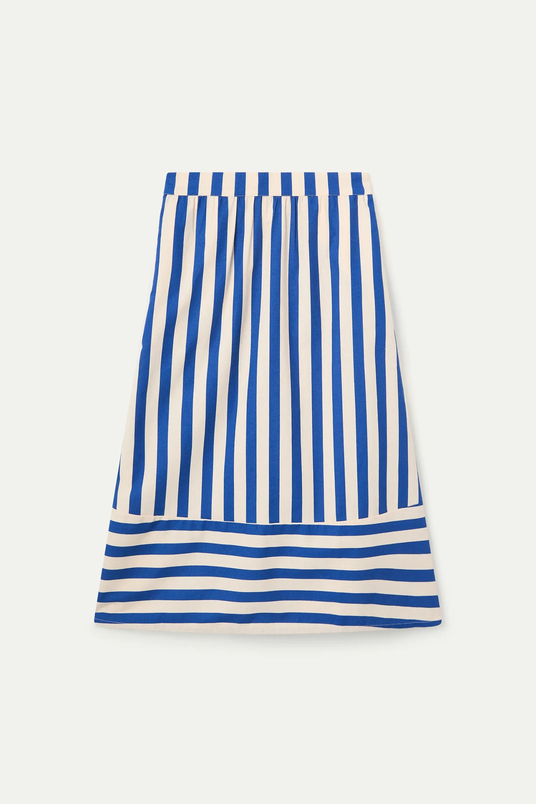 Falda midi de tejido 100% algodón con estampado de bamboo blue. Cintura fija elástica de tiro alto. Detalle de contraste en rayas horizontales en la parte inferior. La modelo mide 173 cm y lleva la talla S.