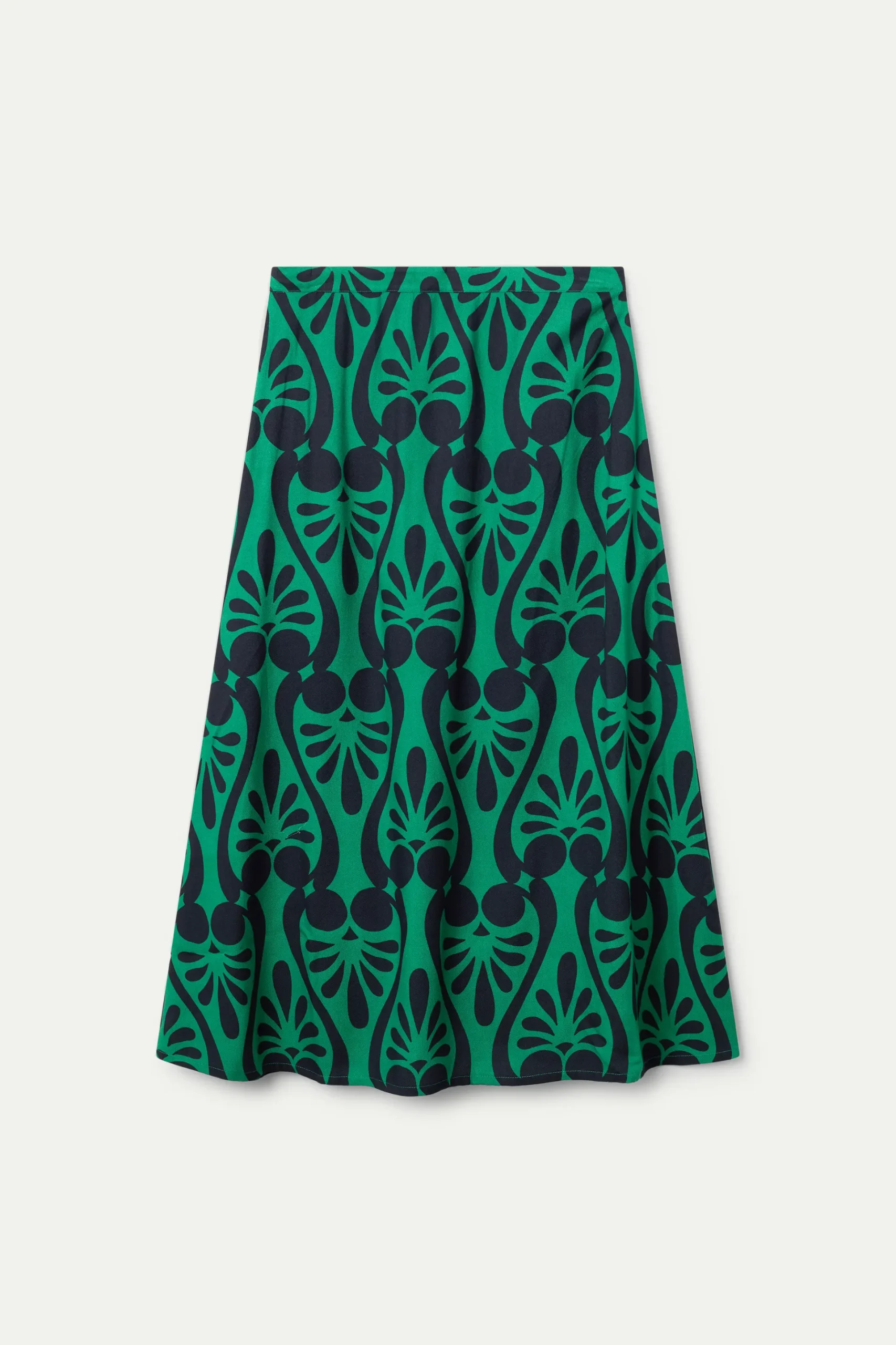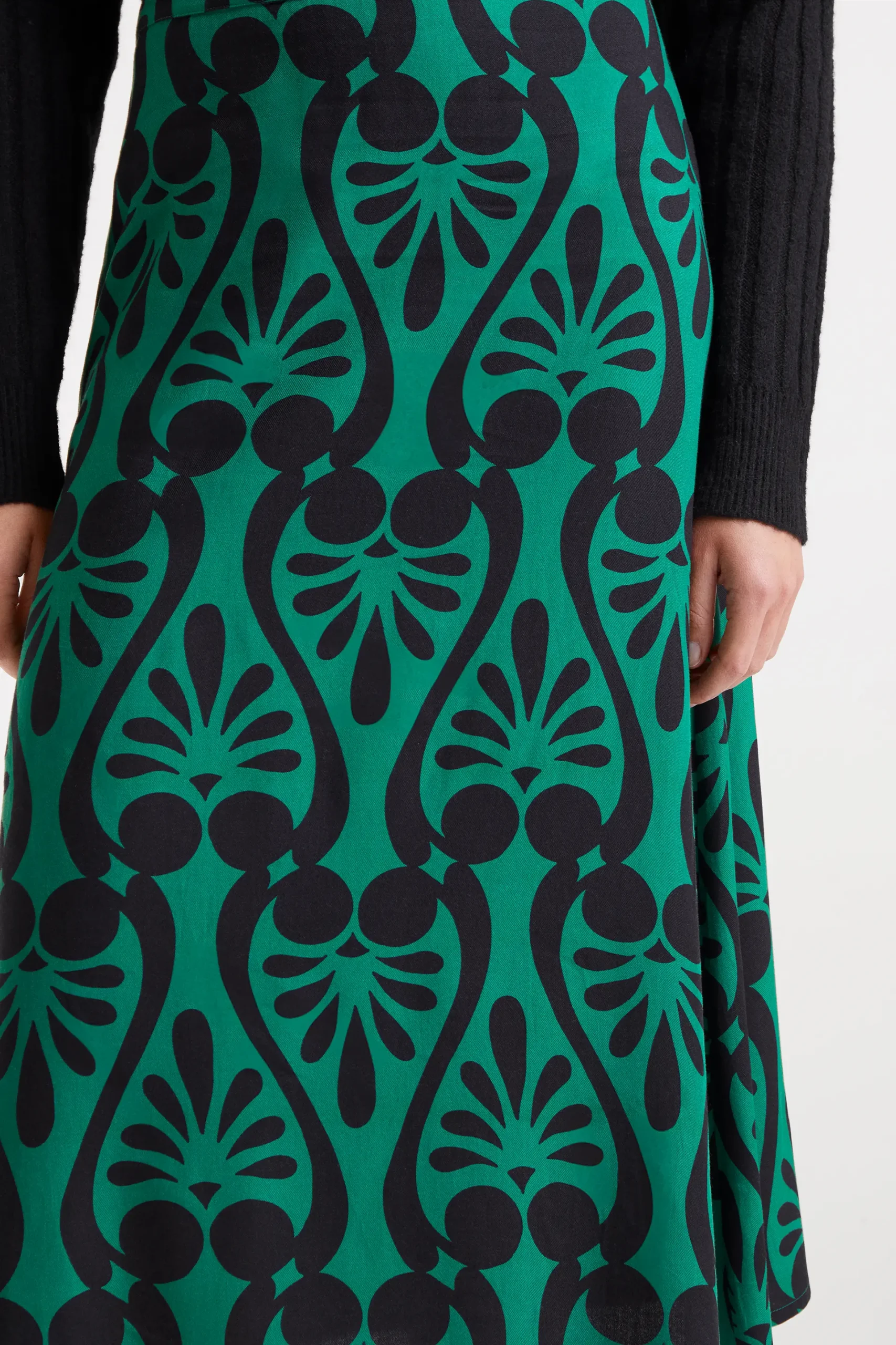 Falda midi con estampado Baroque. Cintura fija de tiro alto. Cierre con cremallera invisible lateral. La modelo mide 177 cm y lleva la talla S.