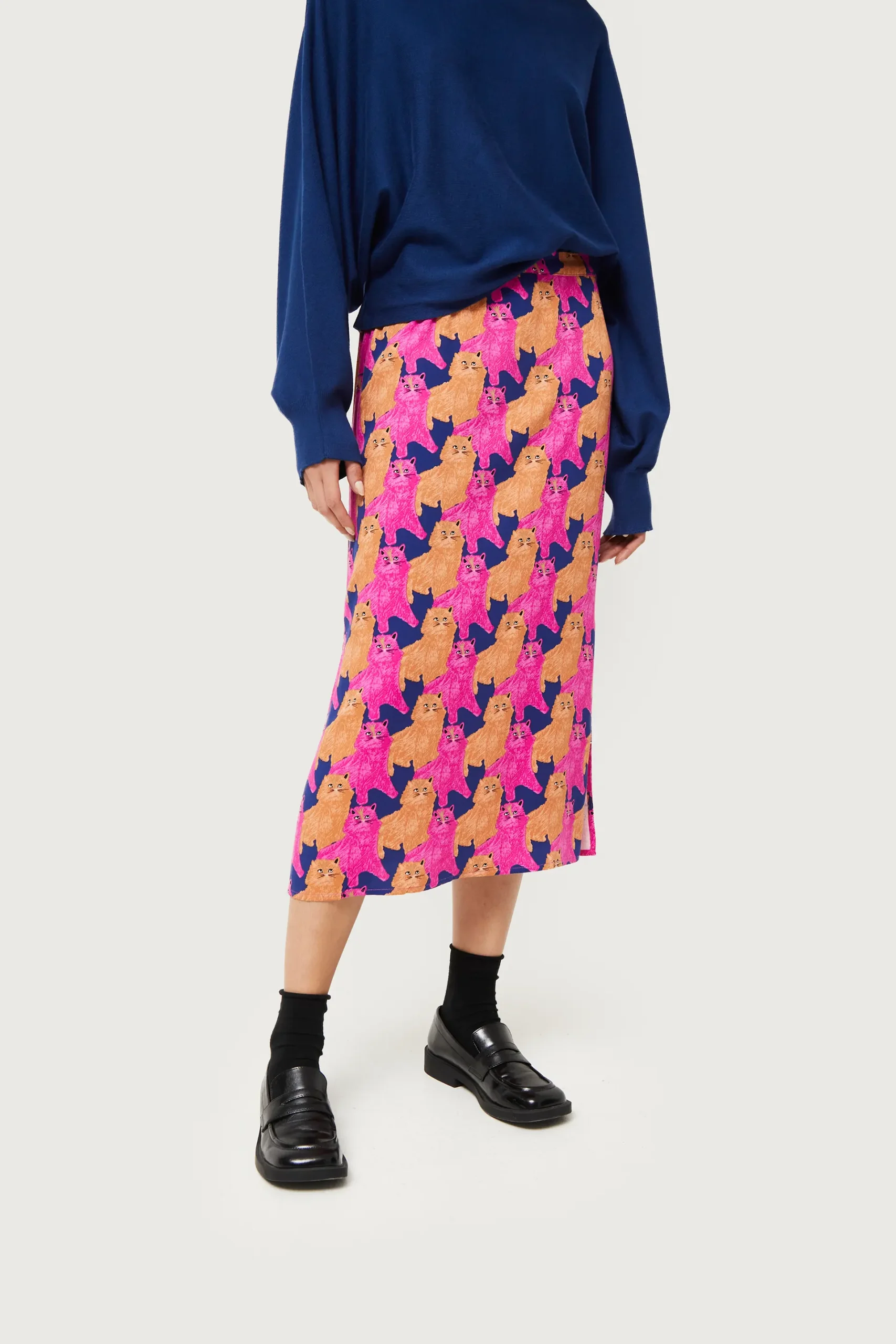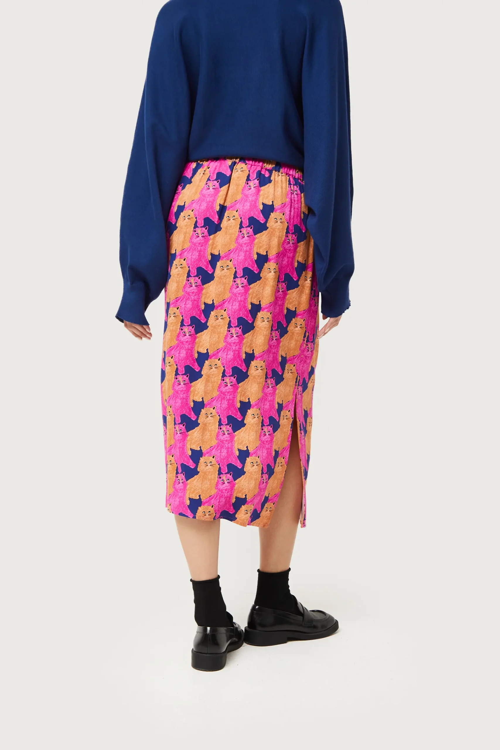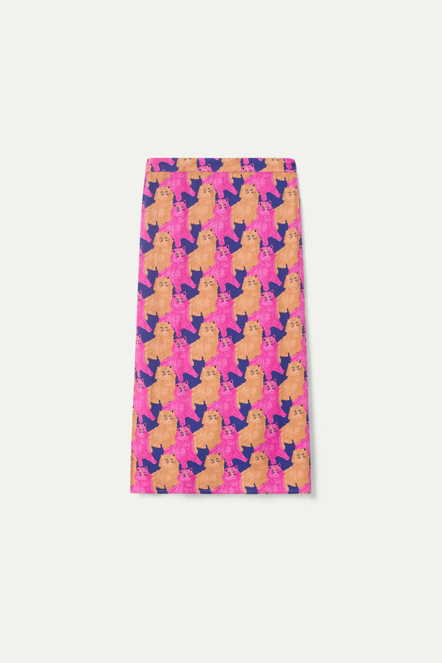 Falda midi en twill de viscosa con estampado de gatos de color morado, beige y azul marino. Con cintura elástica y detalle de aberturas laterales. La modelo mide 176 cm y lleva la talla S.