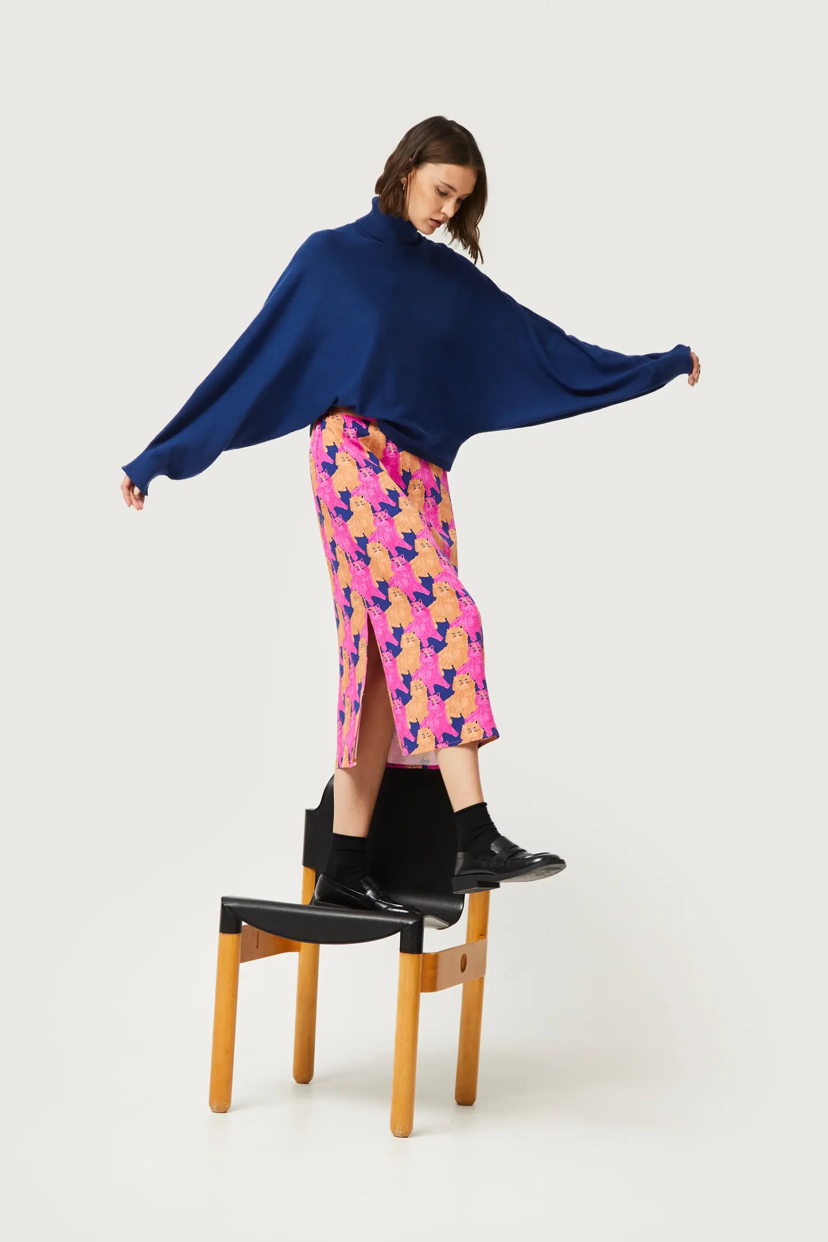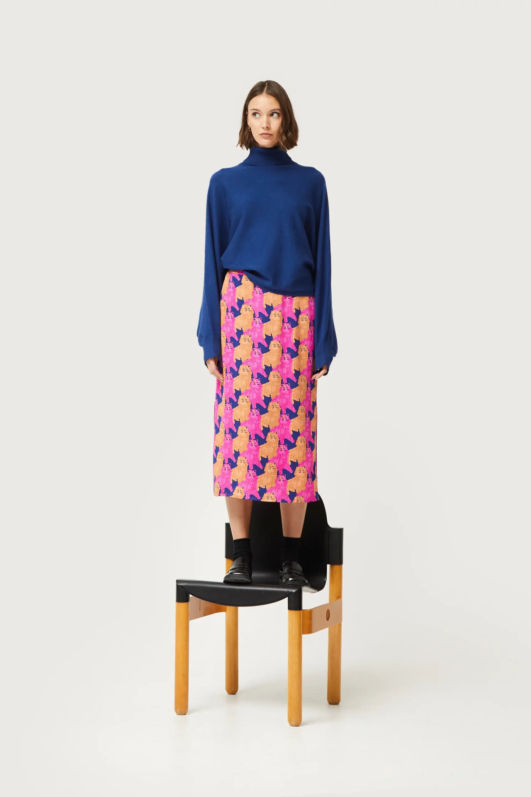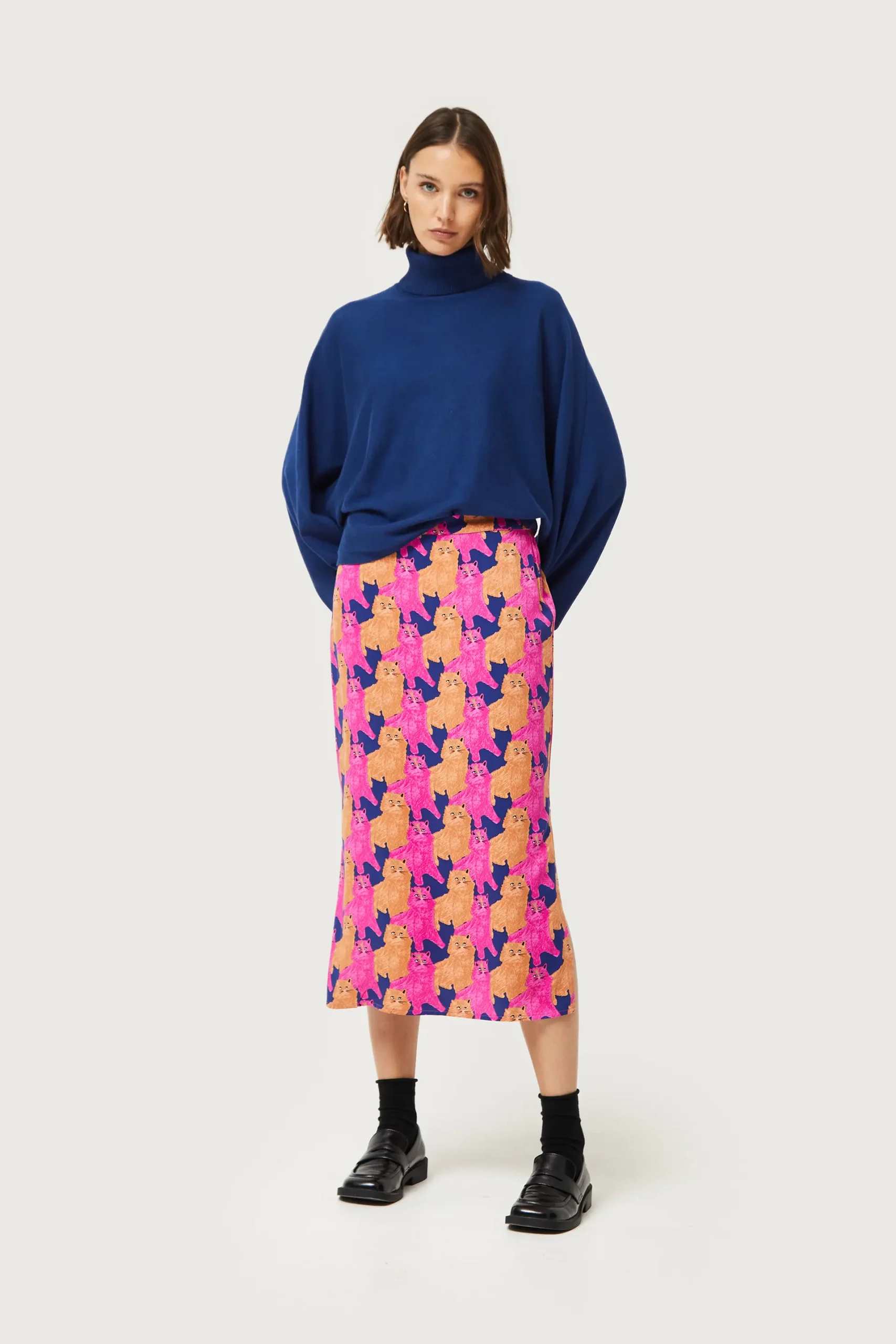 Falda midi en twill de viscosa con estampado de gatos de color morado, beige y azul marino. Con cintura elástica y detalle de aberturas laterales. La modelo mide 176 cm y lleva la talla S.