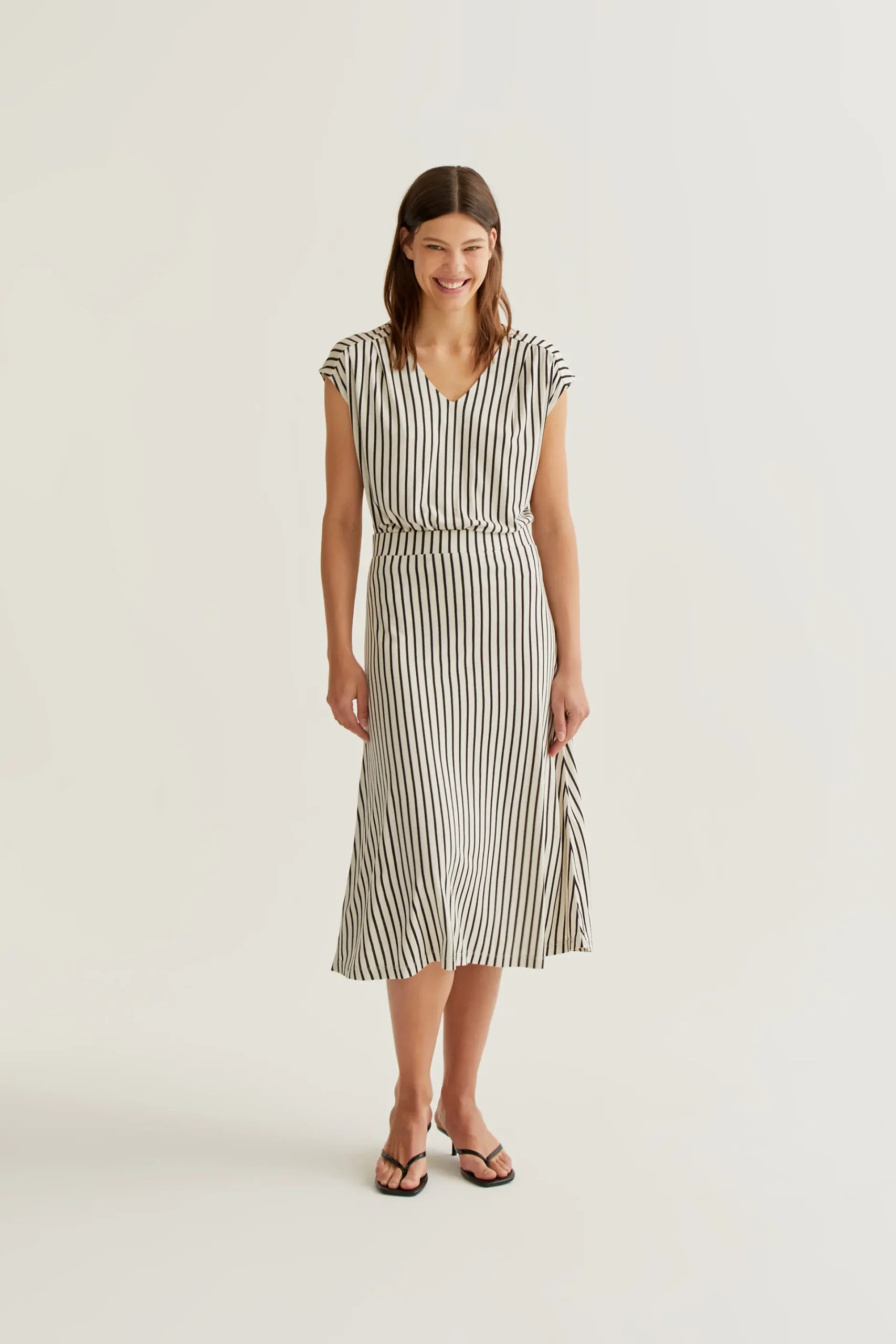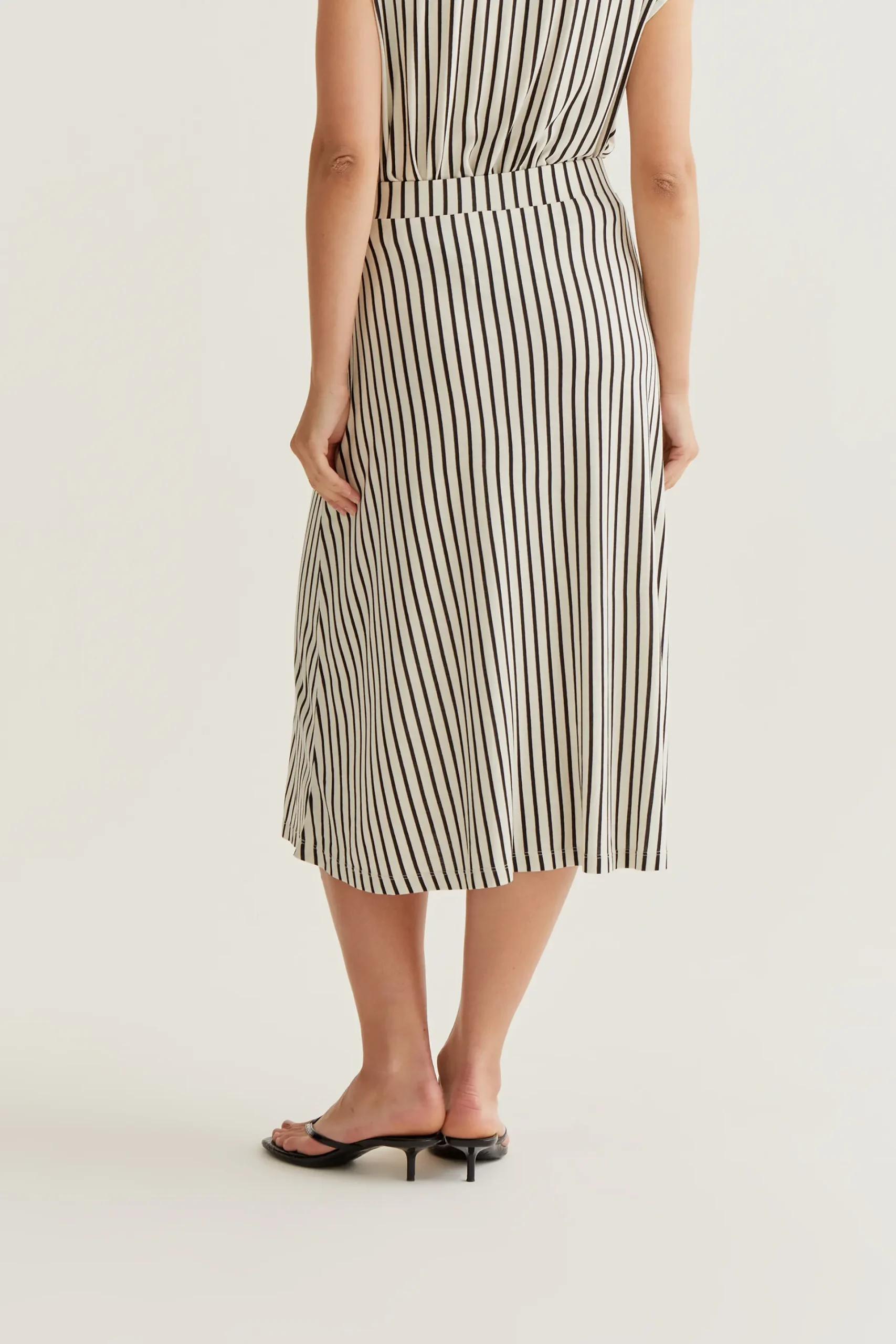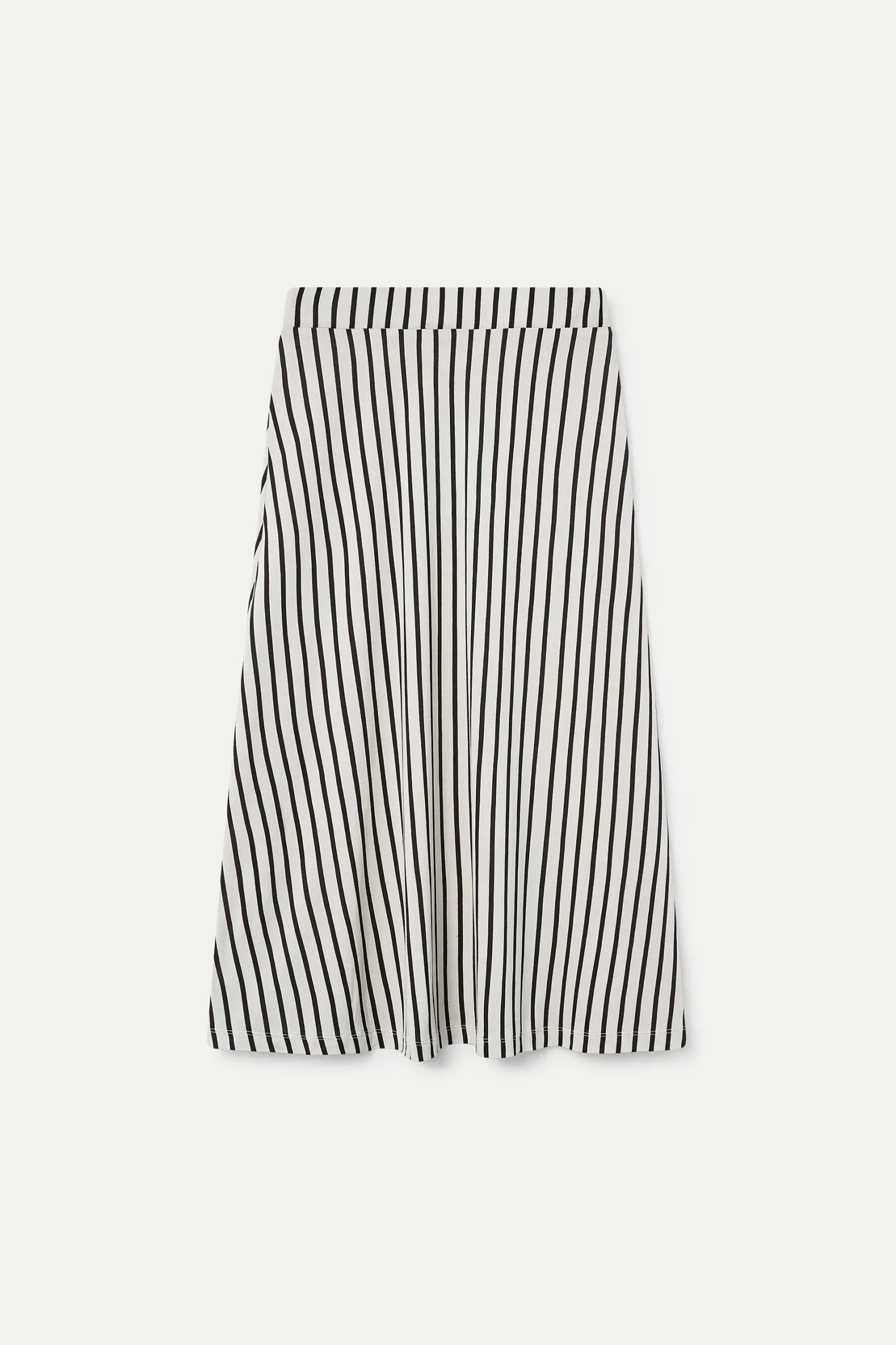 Falda midi de tejido jersey viscoso con estampado de rayas de color negro. Cintura fija elástica de tiro alto. Corte fluido. La modelo mide 177 cm y lleva la talla S.