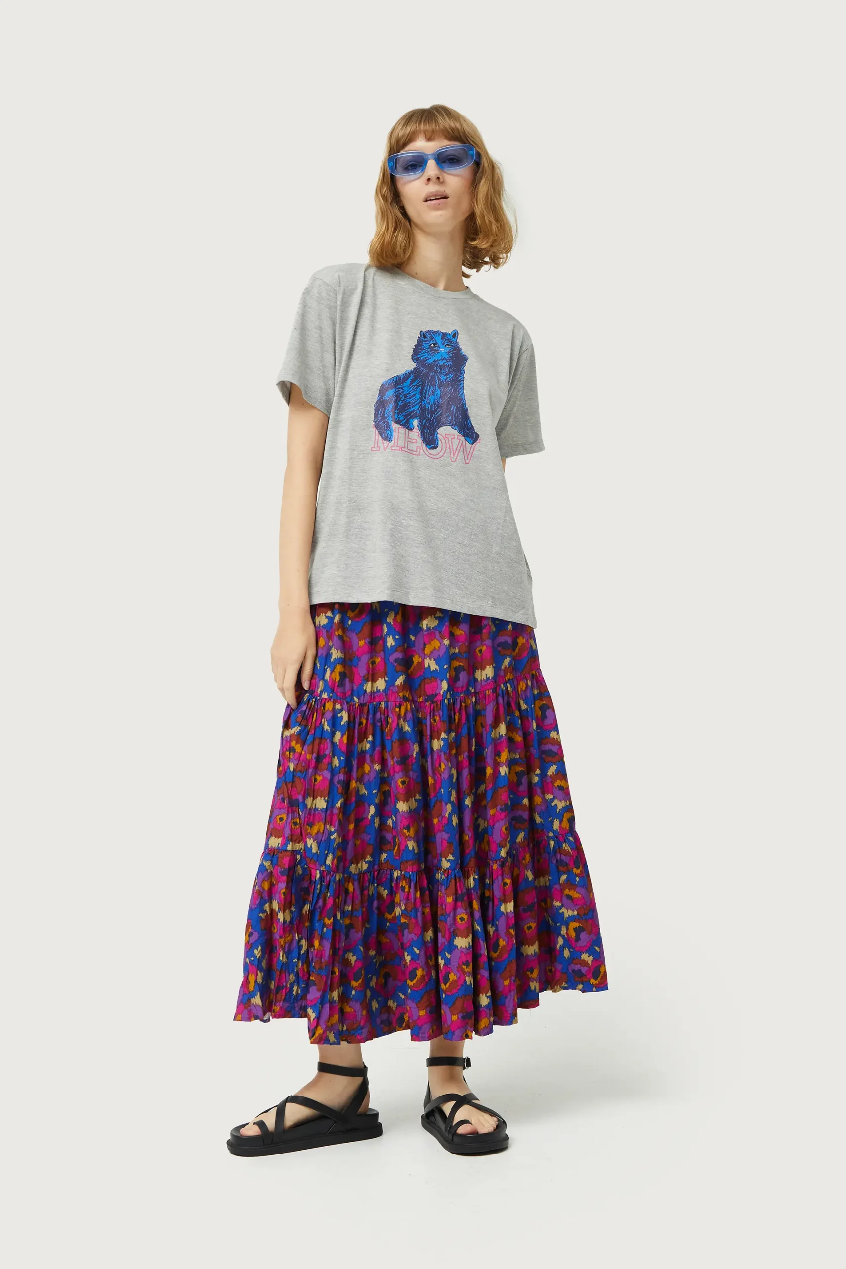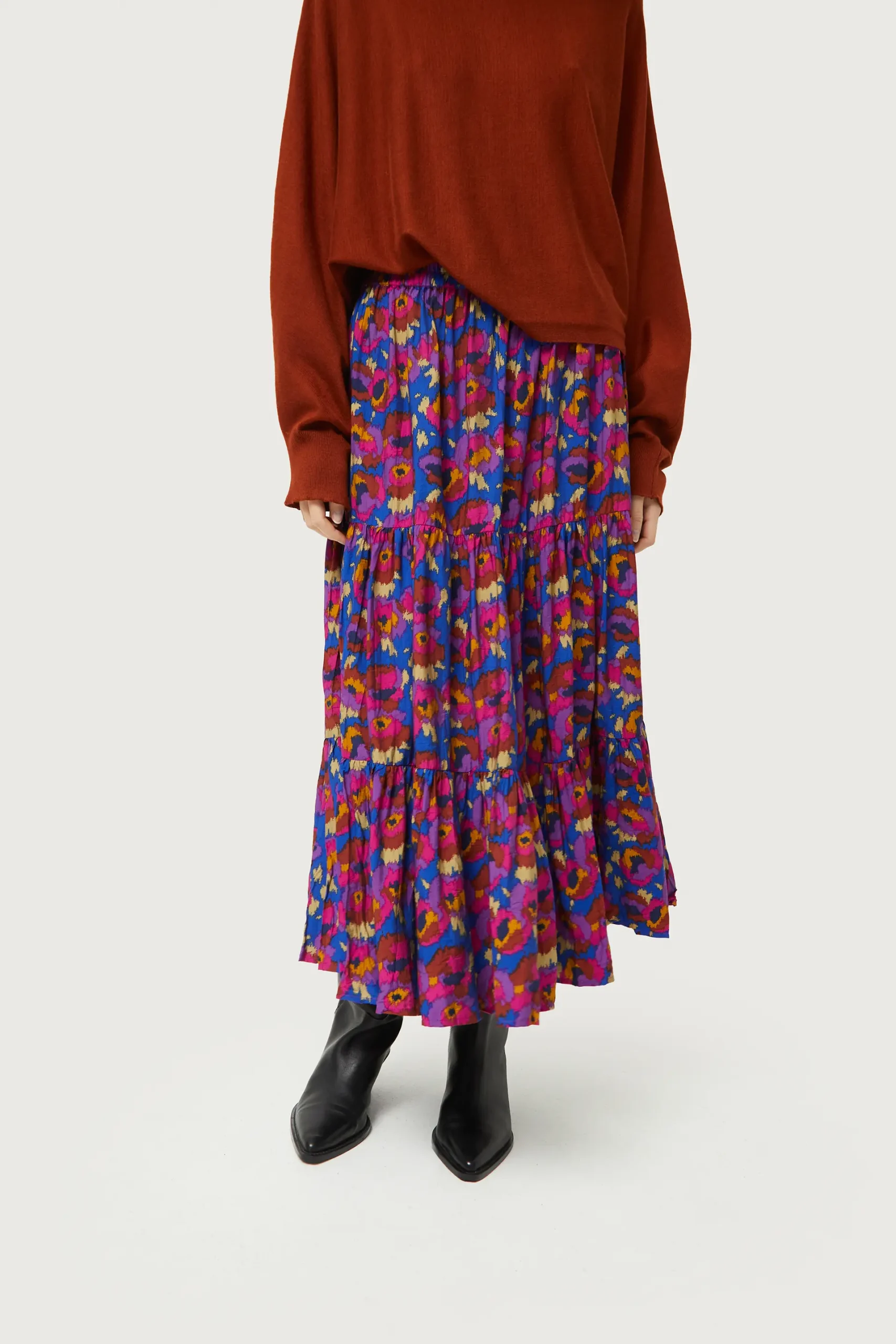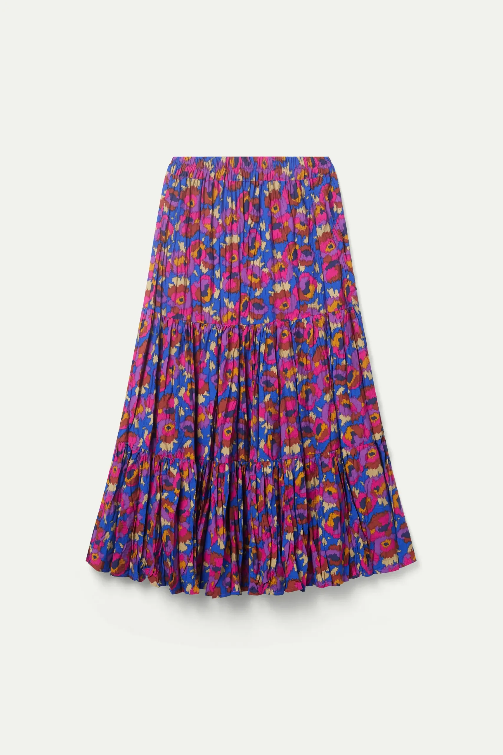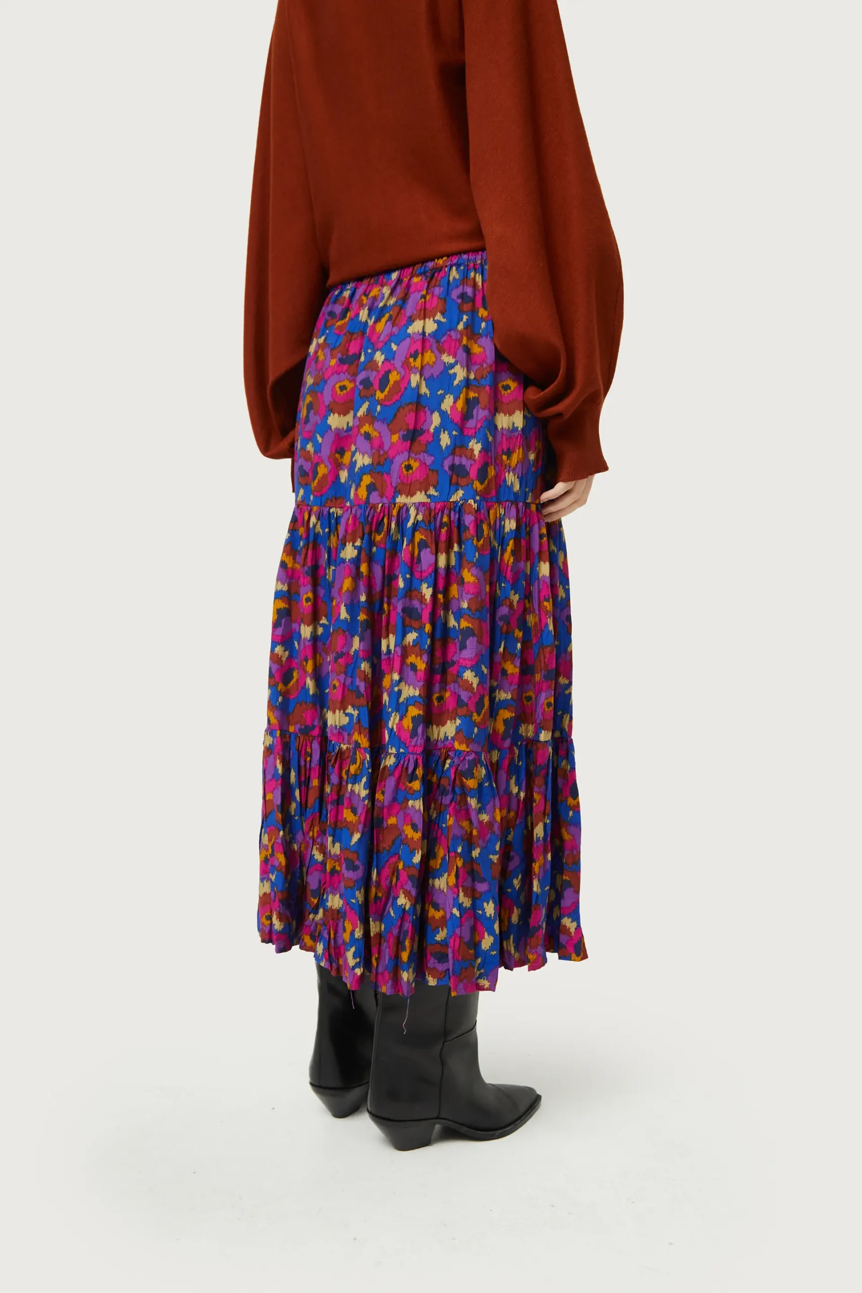 Falda midi en crepé de viscosa con estampado de flores de color azul, morado, rosa, marrón, amarillo y blanco. Con cintura elástica. Modelo plisado. La modelo mide 177 cm y lleva la talla S.