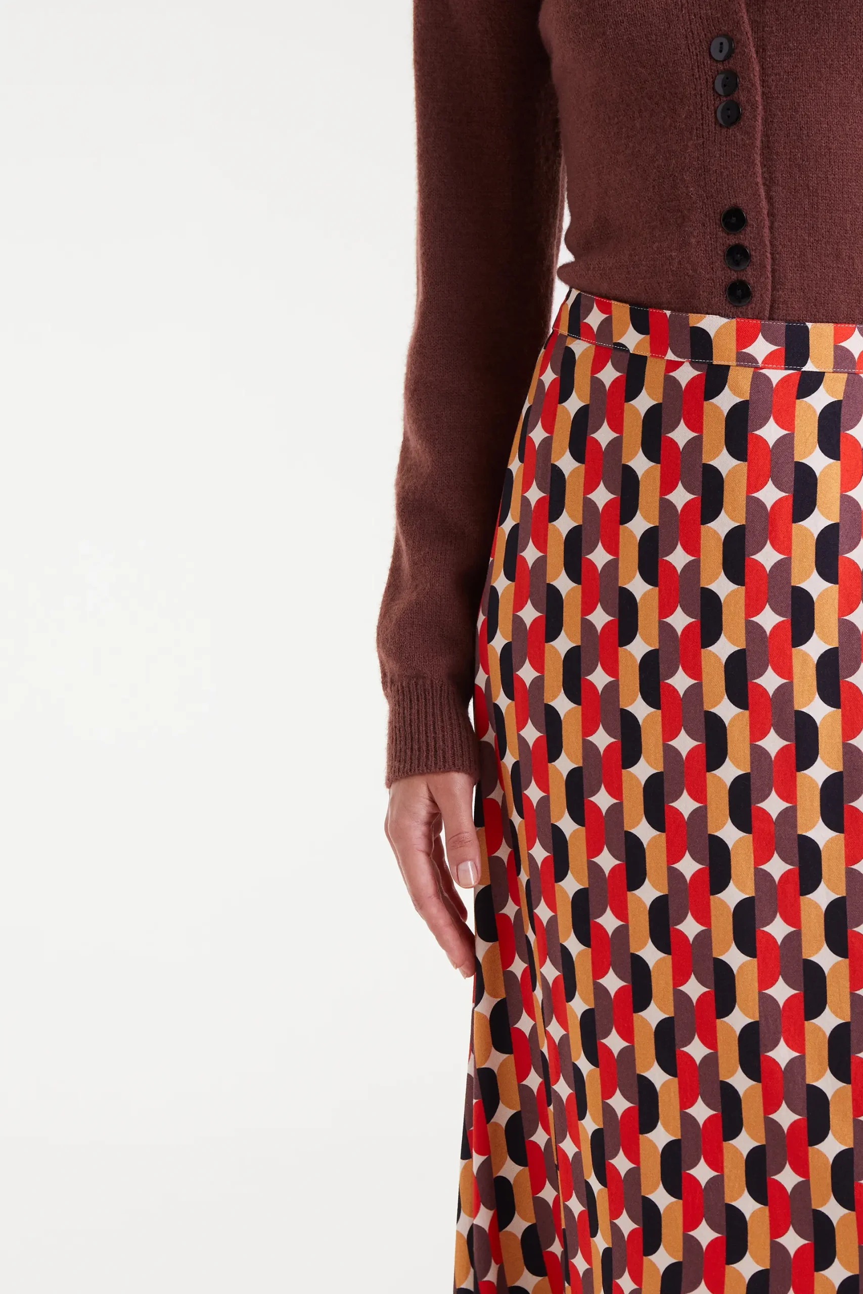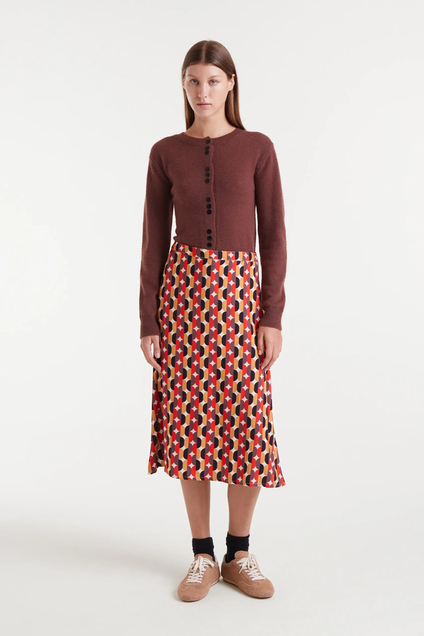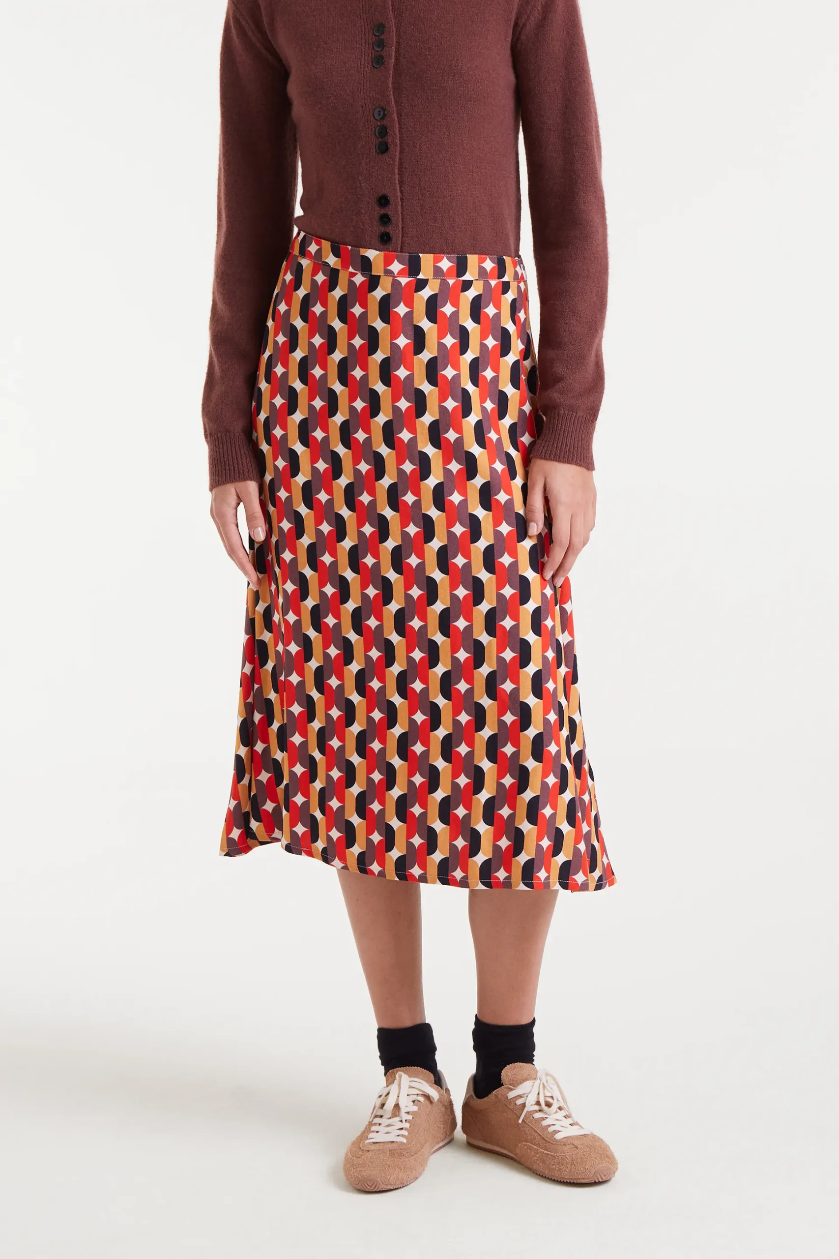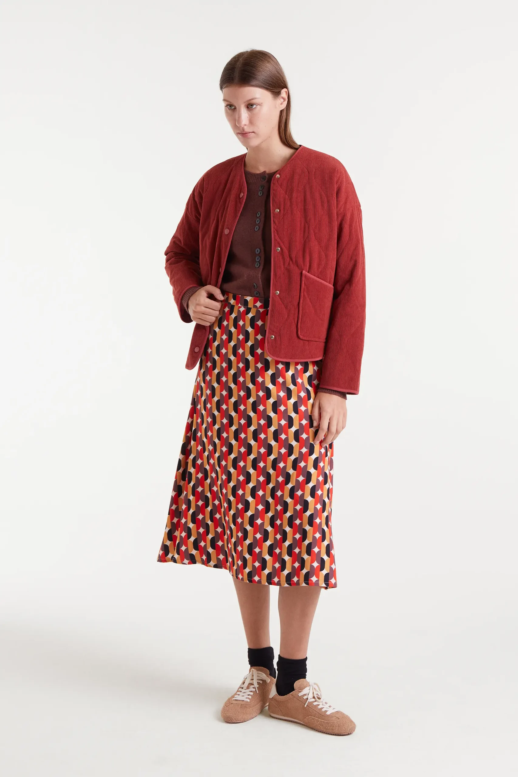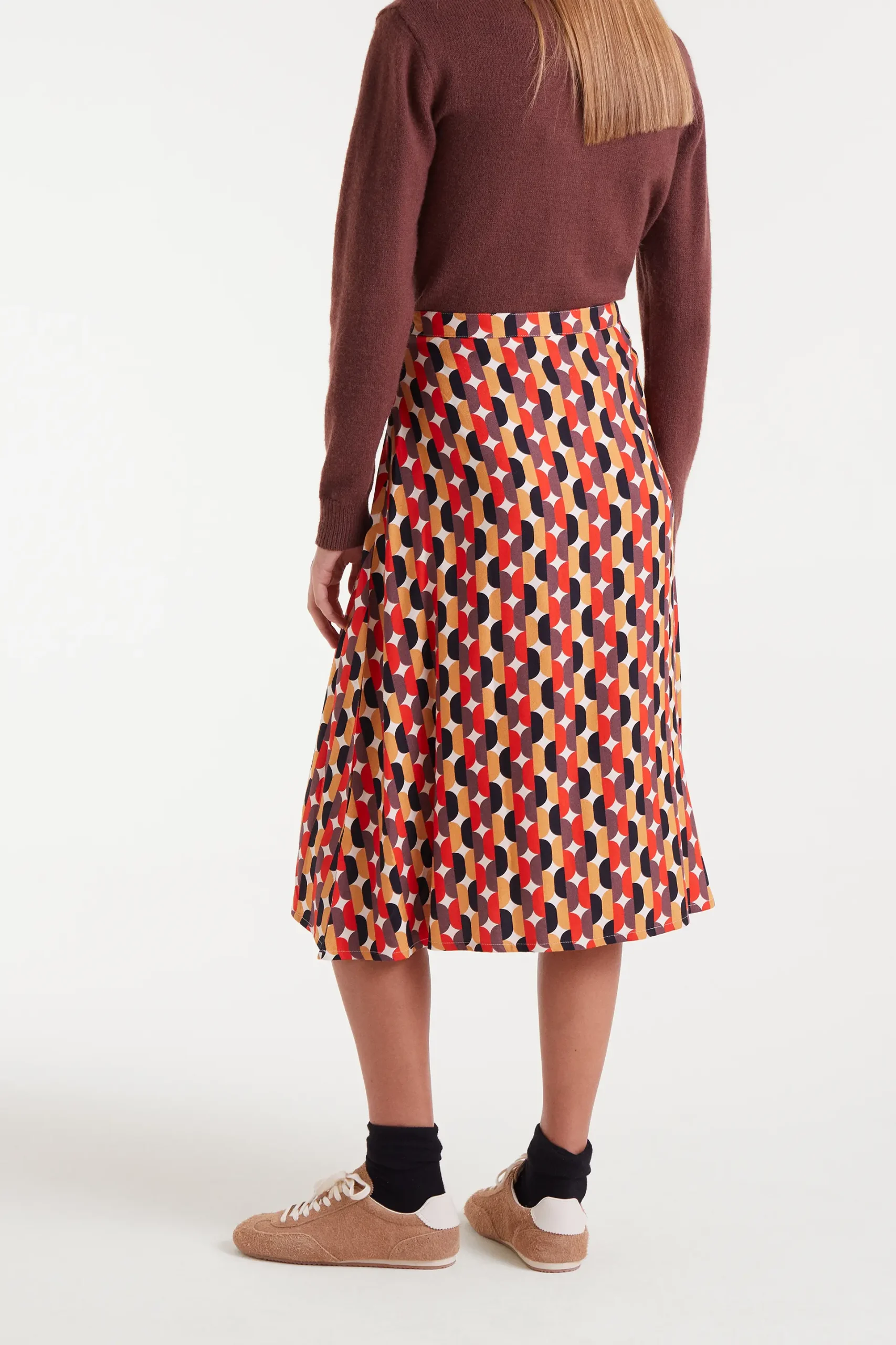 Falda midi con estampado Link. Cintura fija de tiro alto. Cierre con cremallera invisible lateral. La modelo mide 177 cm y lleva la talla S.