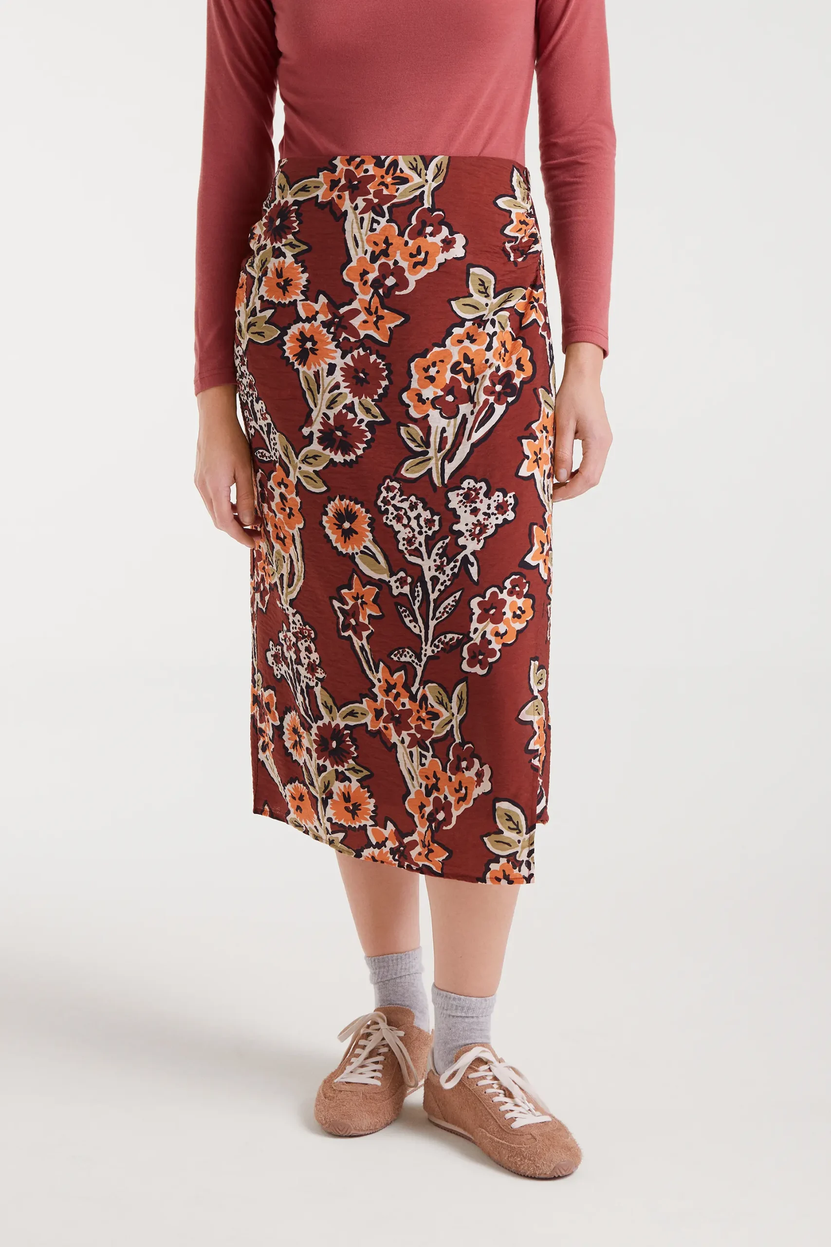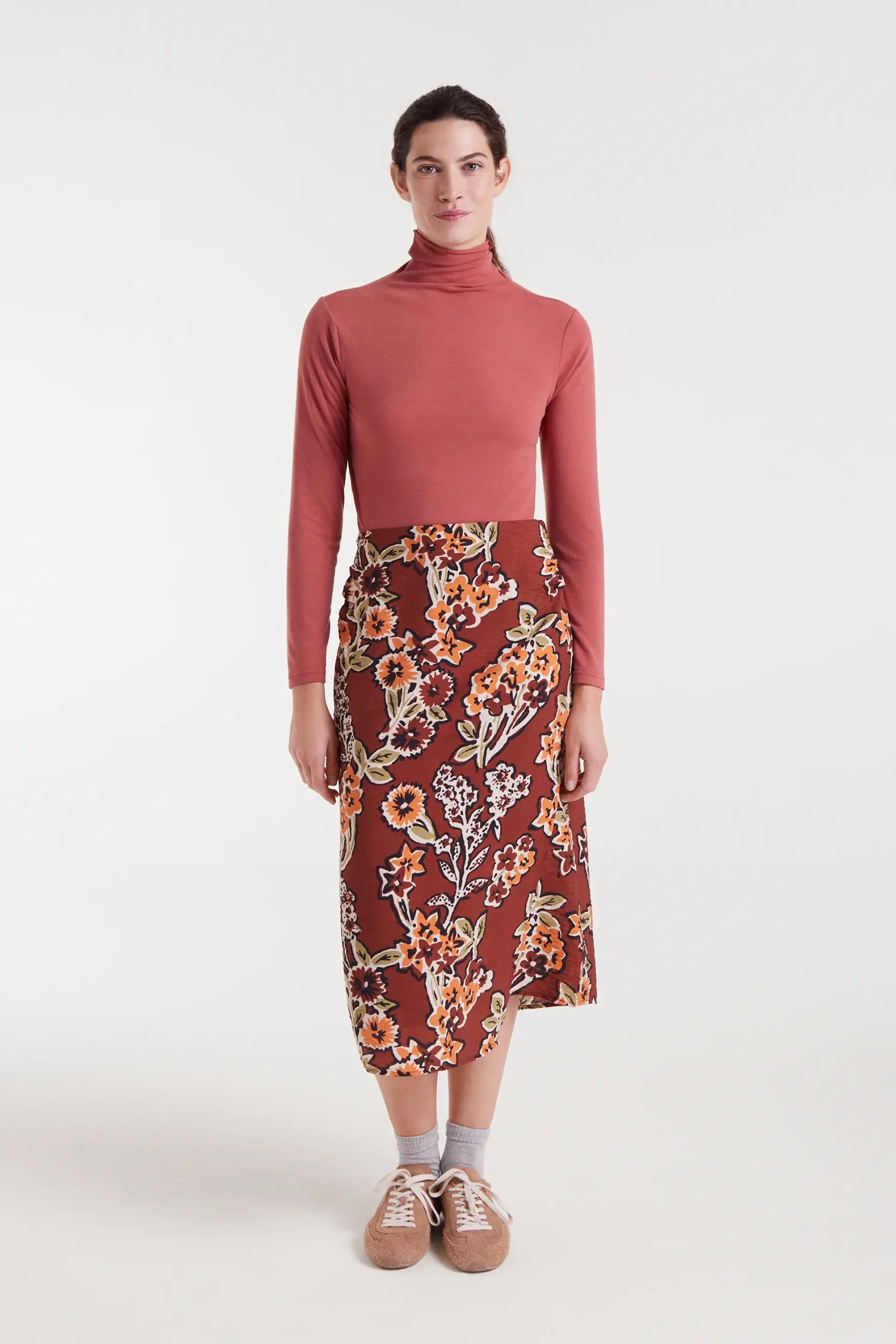 Falda midi de crepé ligero con estampado Daisy. Con cintura elástica trasera envolvente. Frunces laterales. La modelo mide 1788 cm y lleva la talla S.