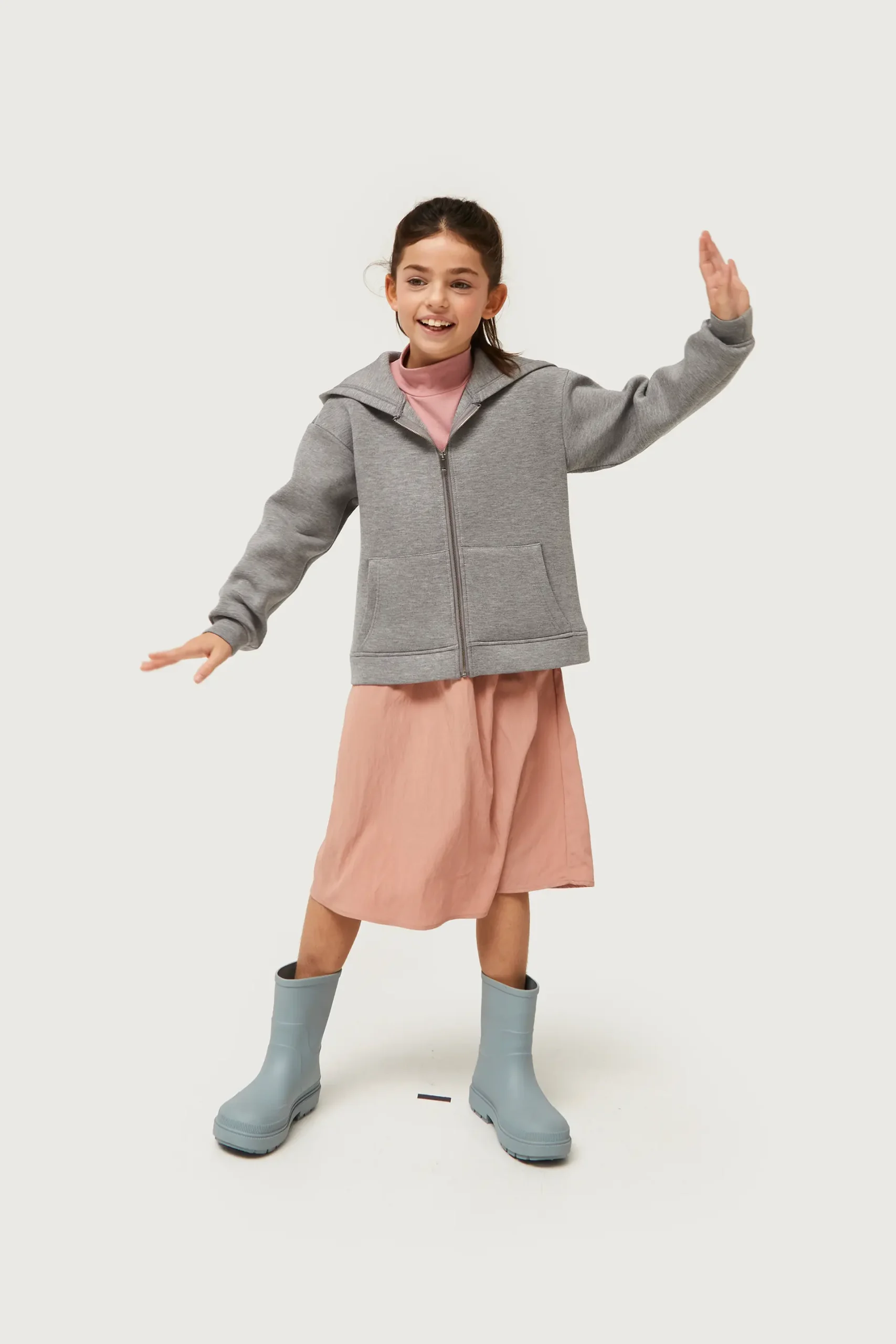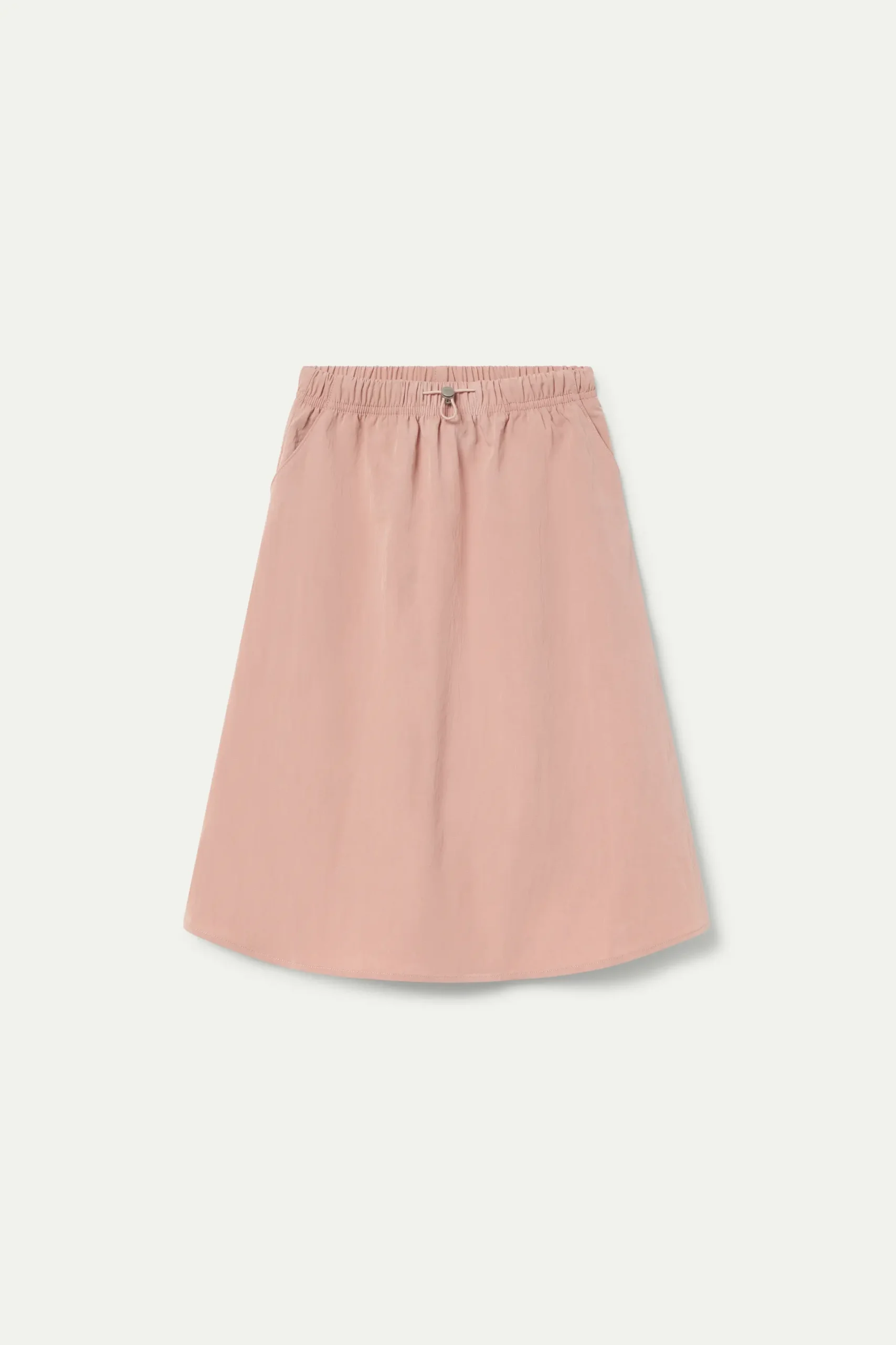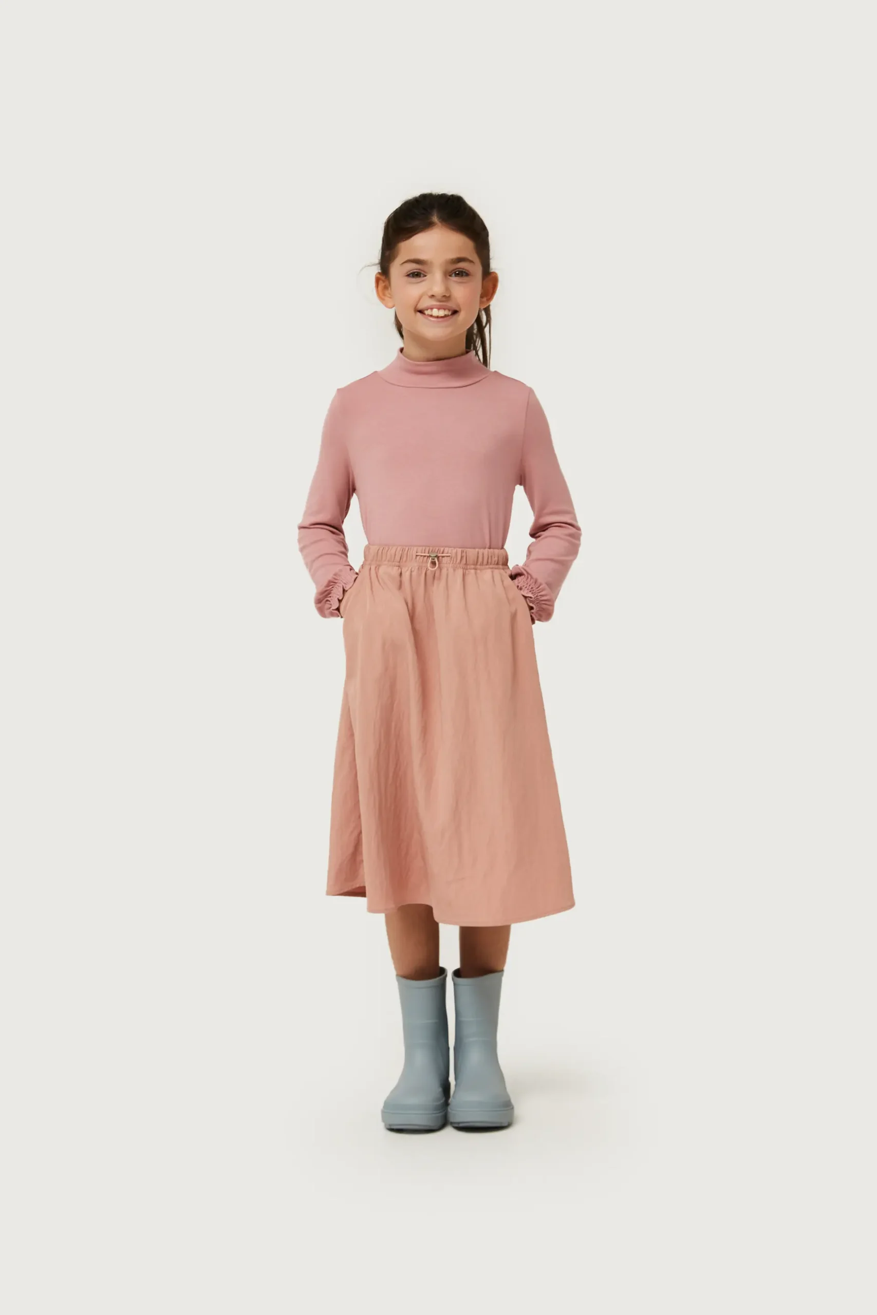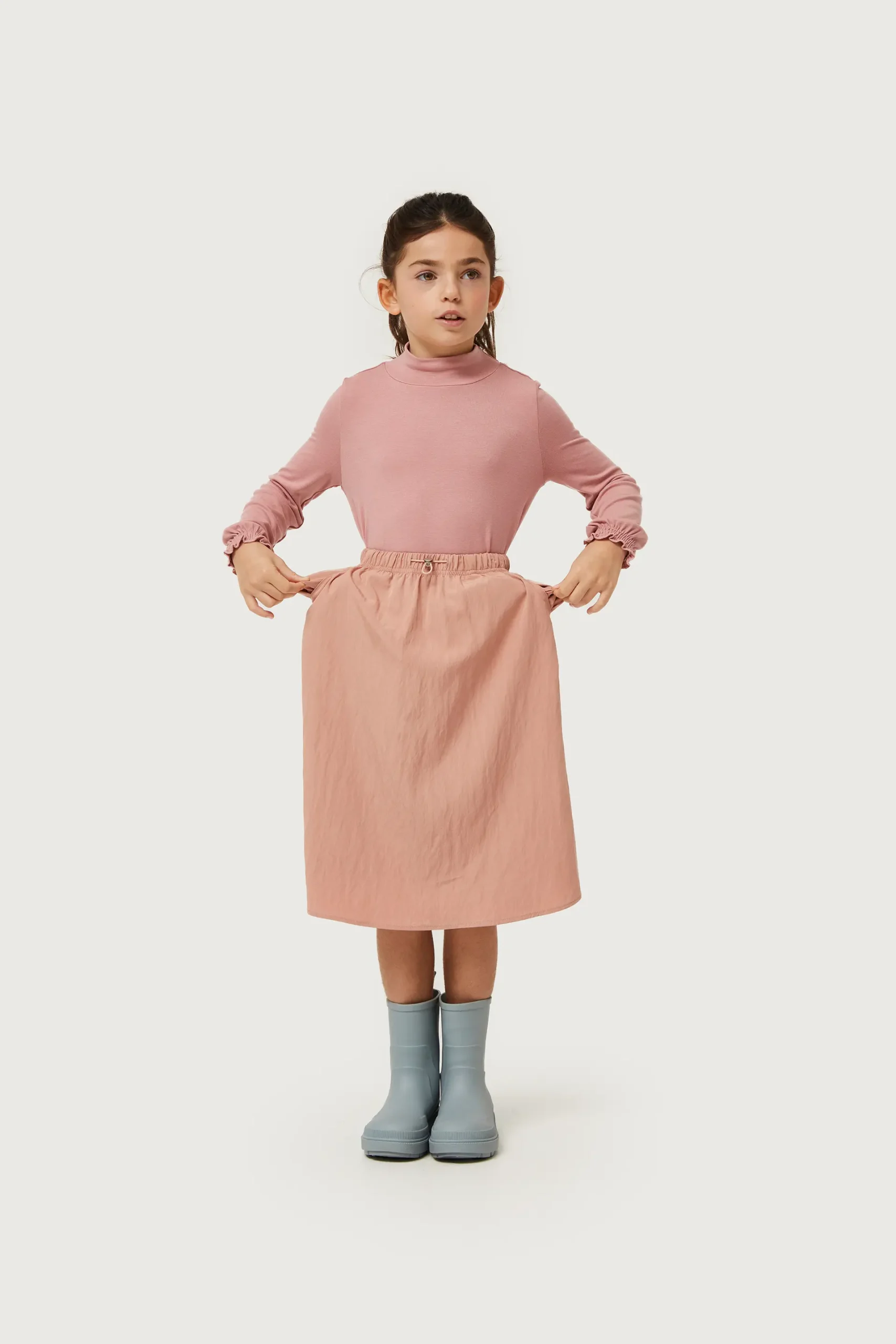 Falda midi de niña en tejido técnico de color rosa. Con cintura elástica y cordón ajustable. Bolsillos laterales. La modelo mide 130 cm y lleva la talla 8.