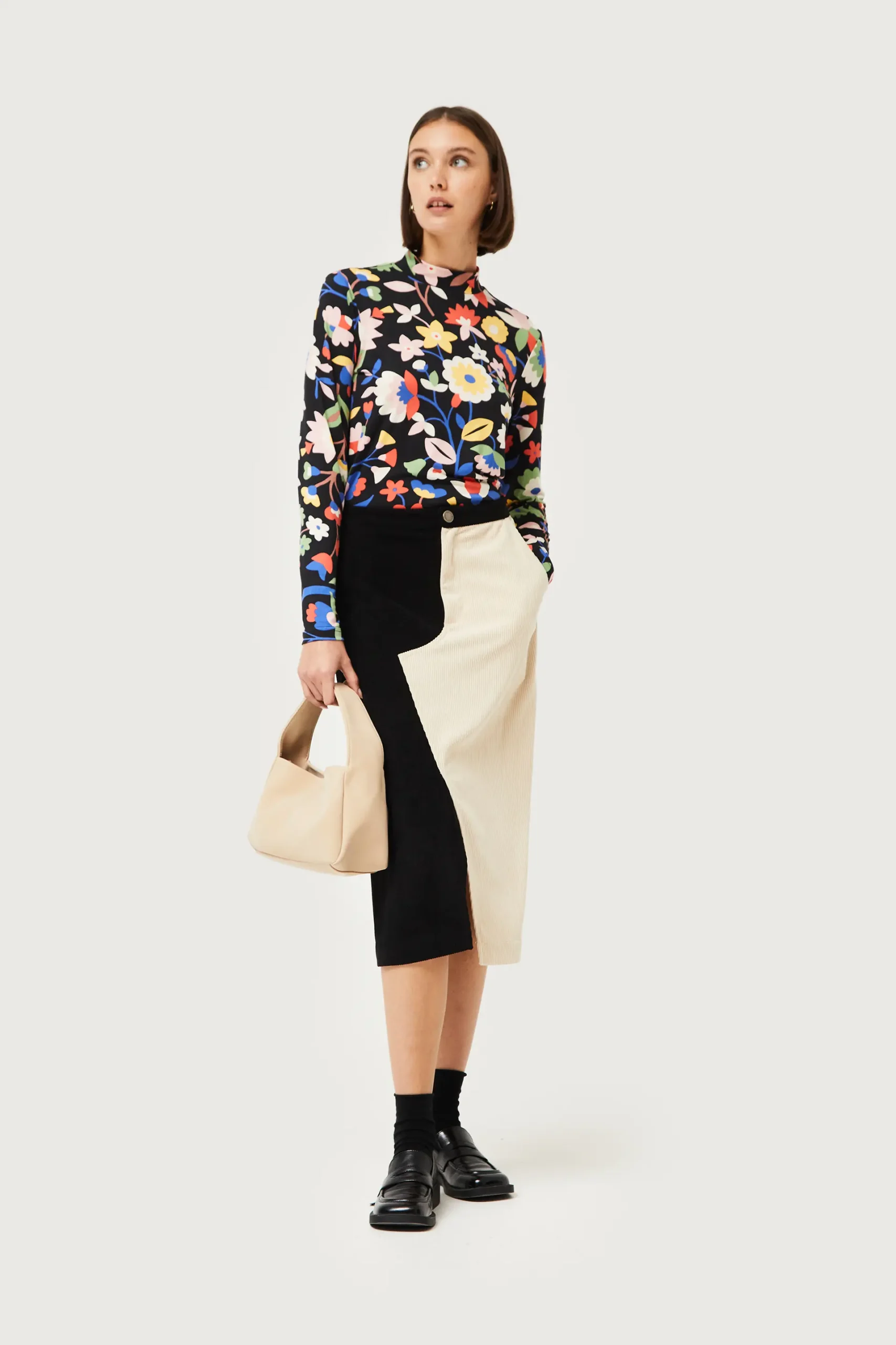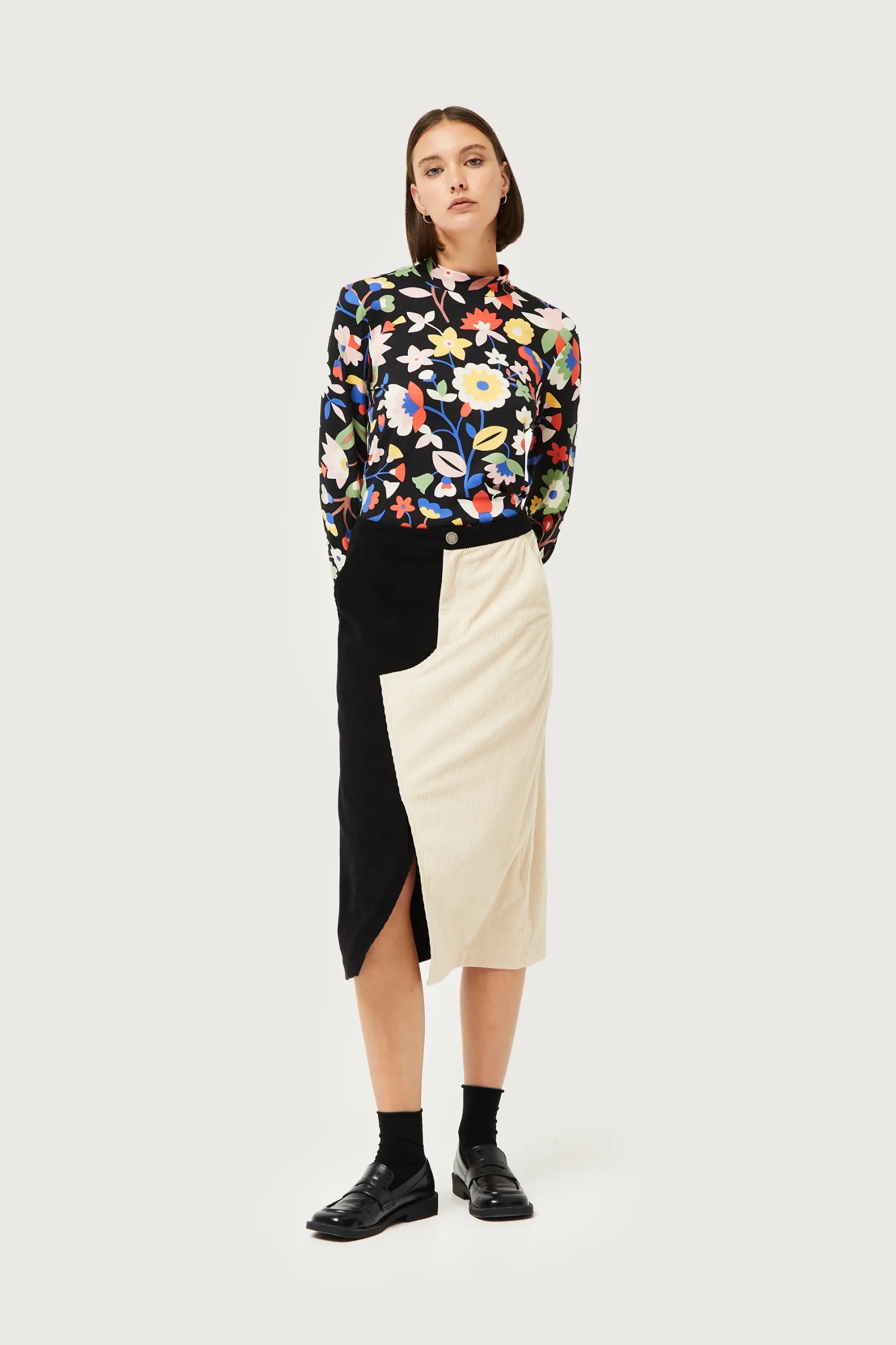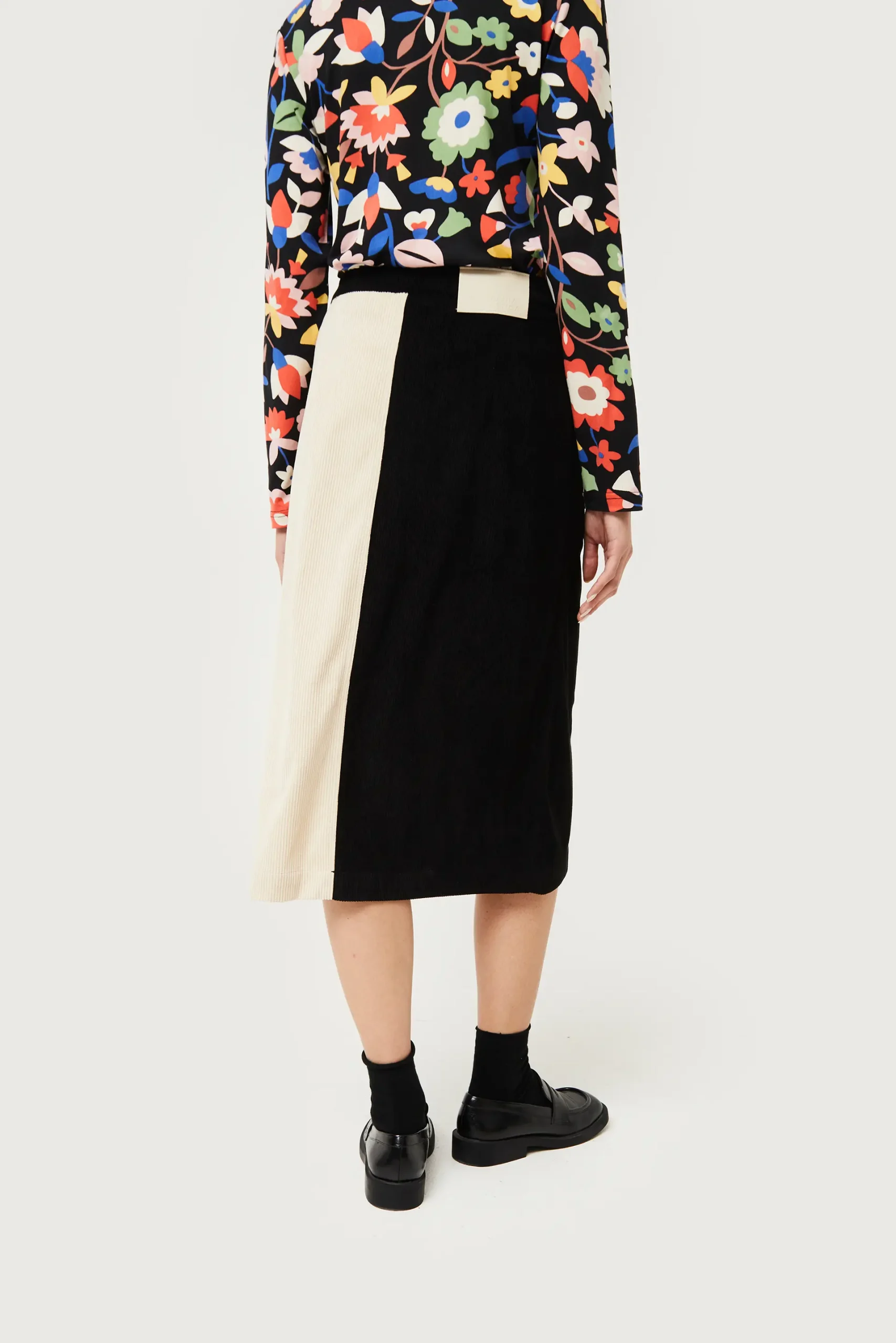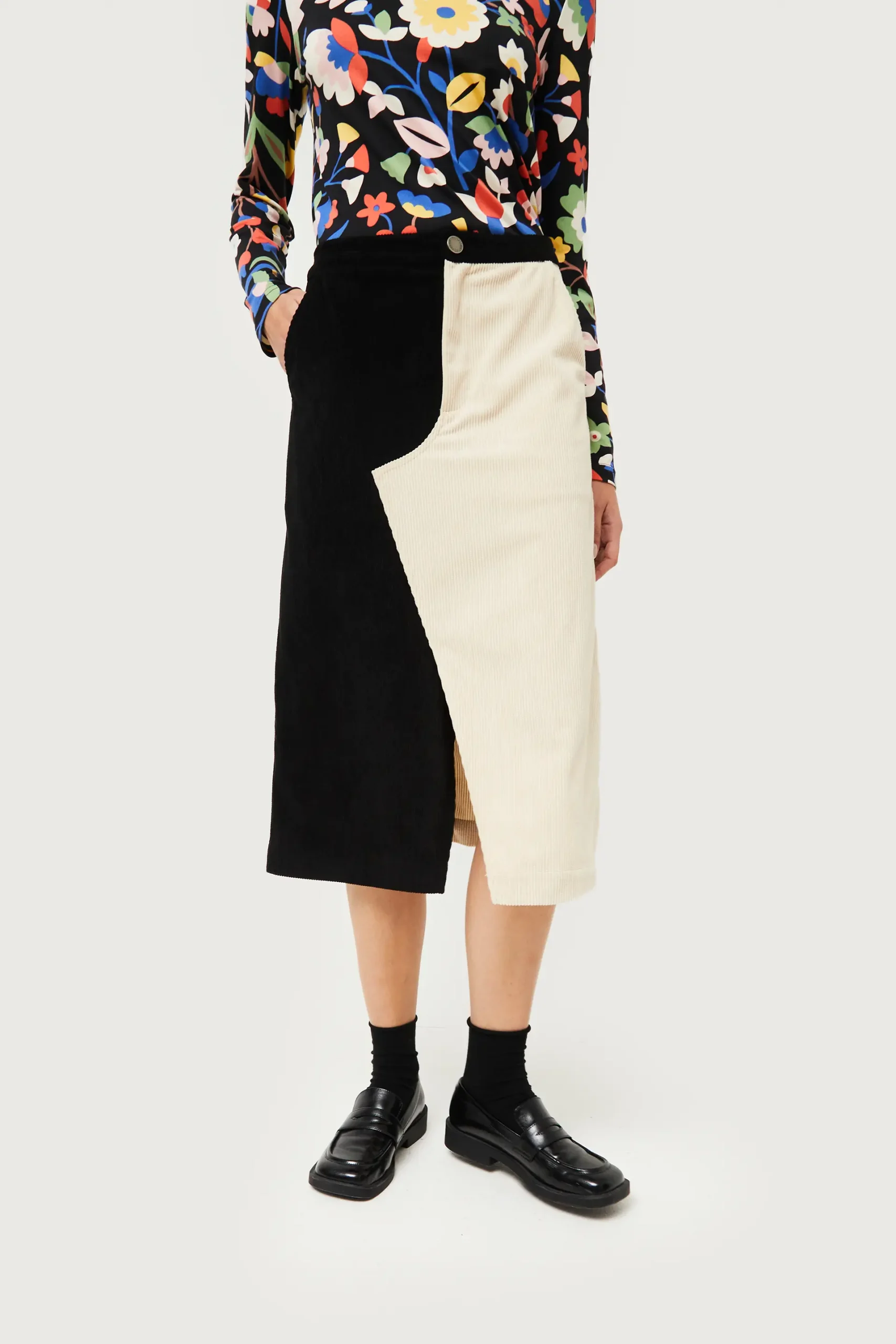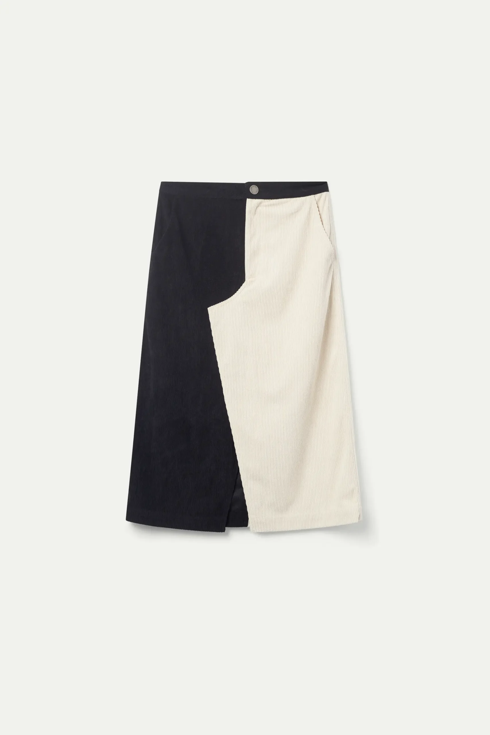Falda midi de pana de color blanco y negro. Con cintura fija de tiro alto. Cierre frontal con botón y cremallera. Bolsillos laterales. Detalle de abertura en la parte delantera. La modelo mide 176 cm y lleva la talla S.