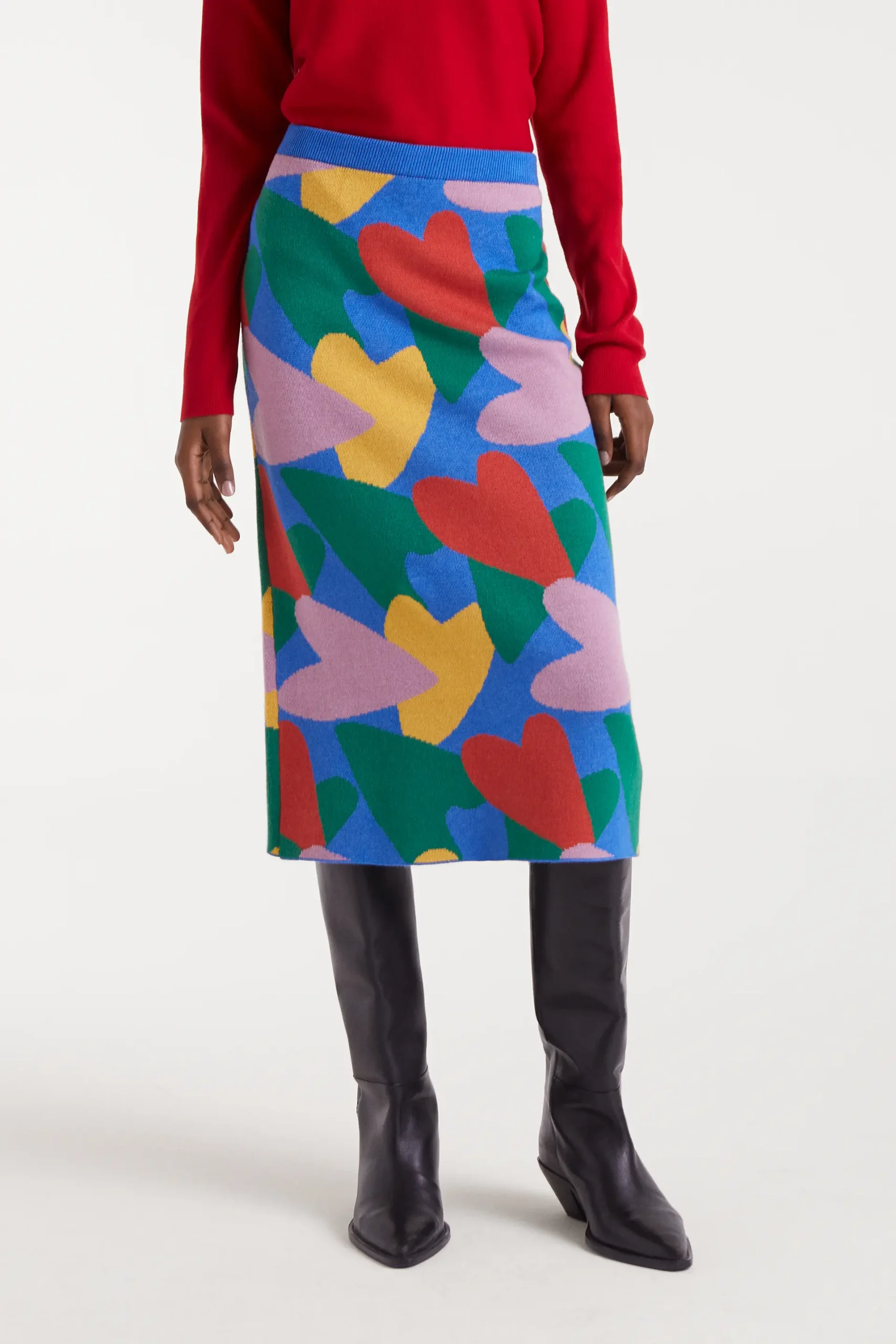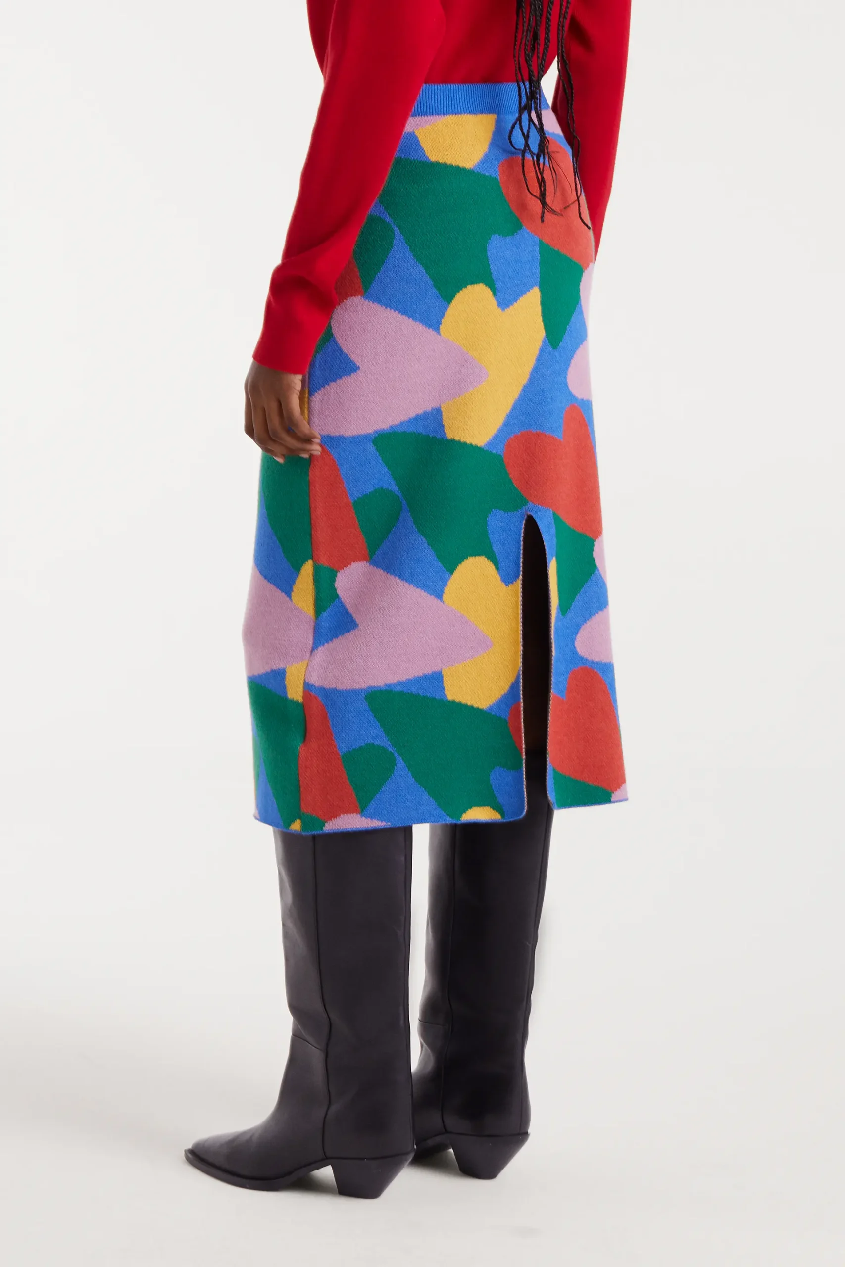 Falda midi de punto con estampado cupido. Con cintura elástica y tiro medio. Detalle de abertura en la parte posterior. La modelo mide 178 cm y lleva la talla S.