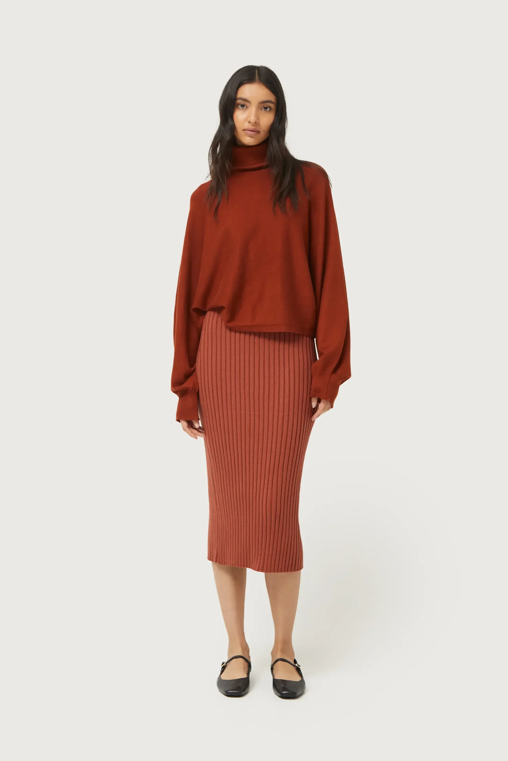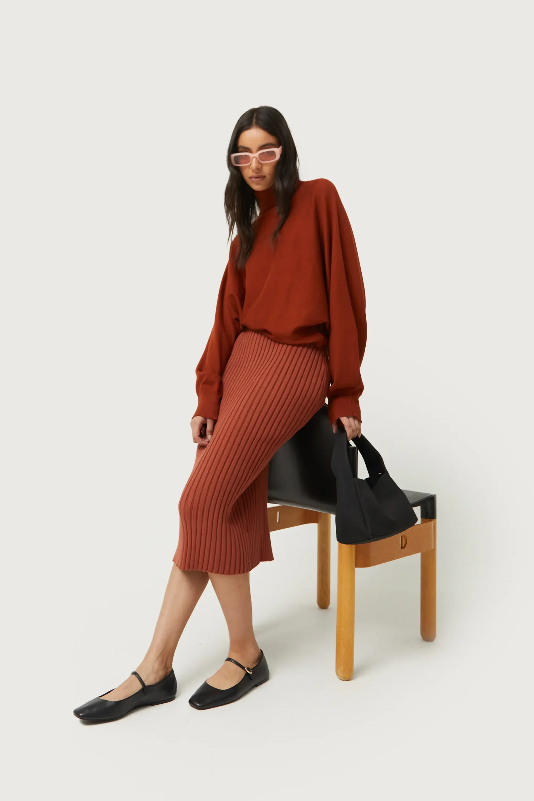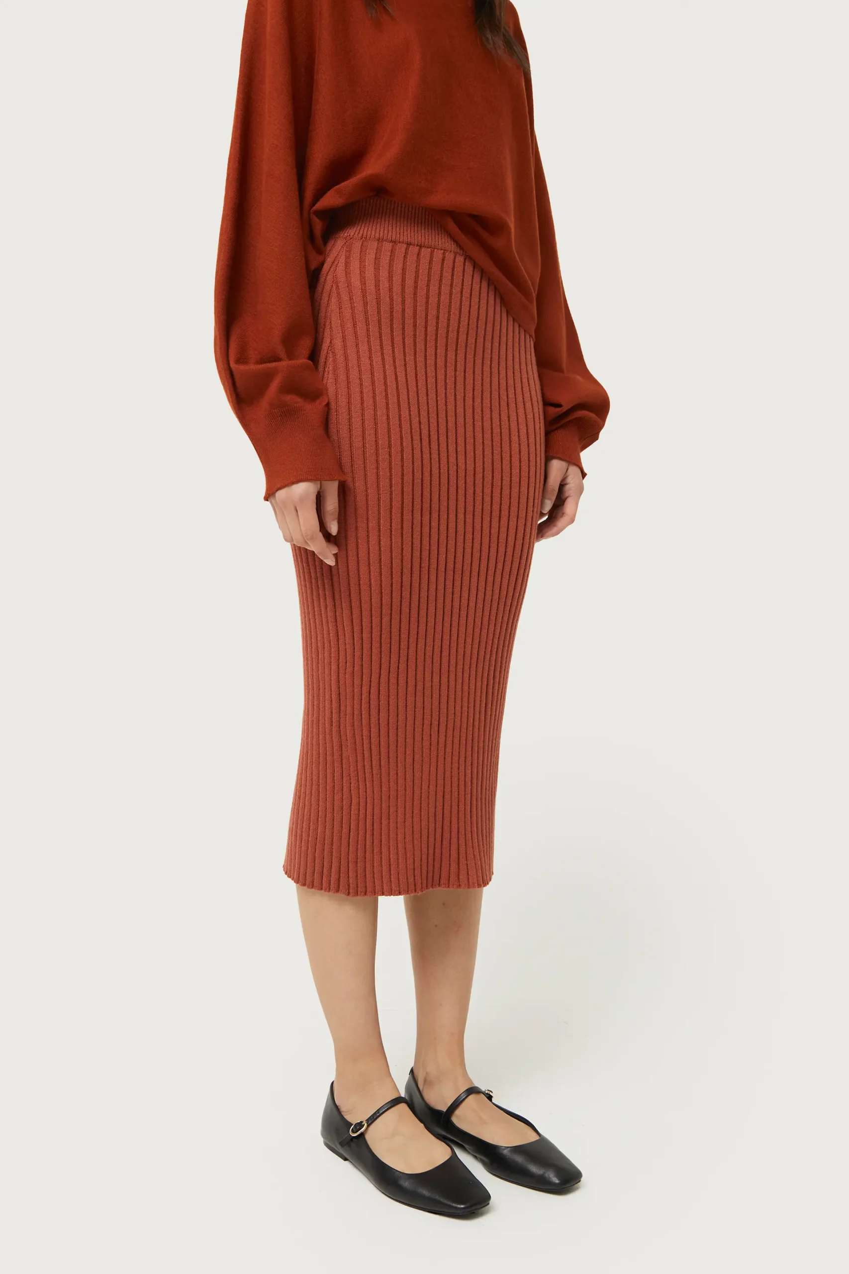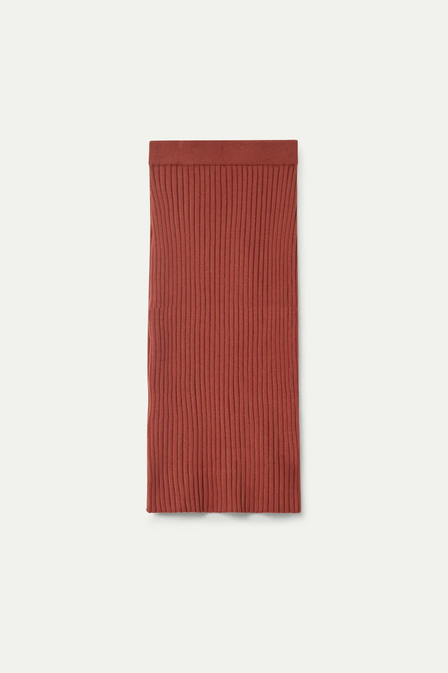 Falda midi de punto en canalé de color marrón. Con cintura elástica y tiro medio. Detalle de abertura en la parte posterior. La modelo mide 176 cm y lleva la talla S.