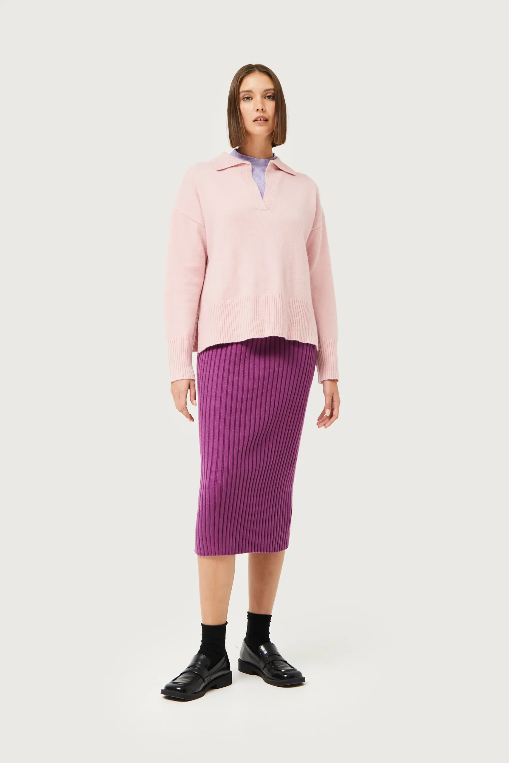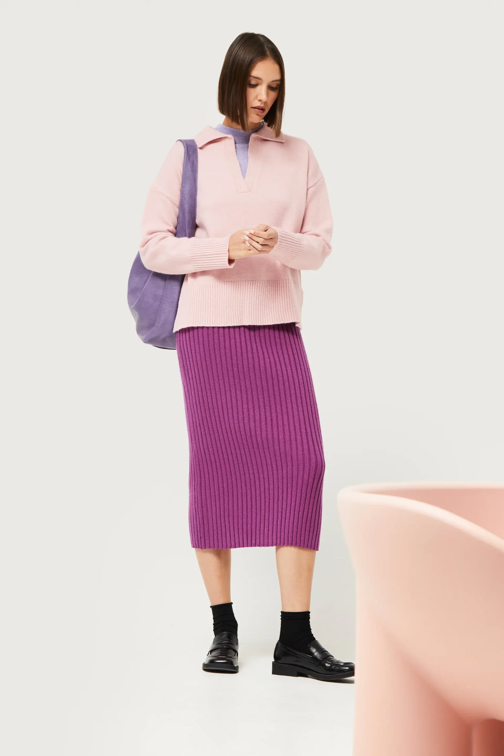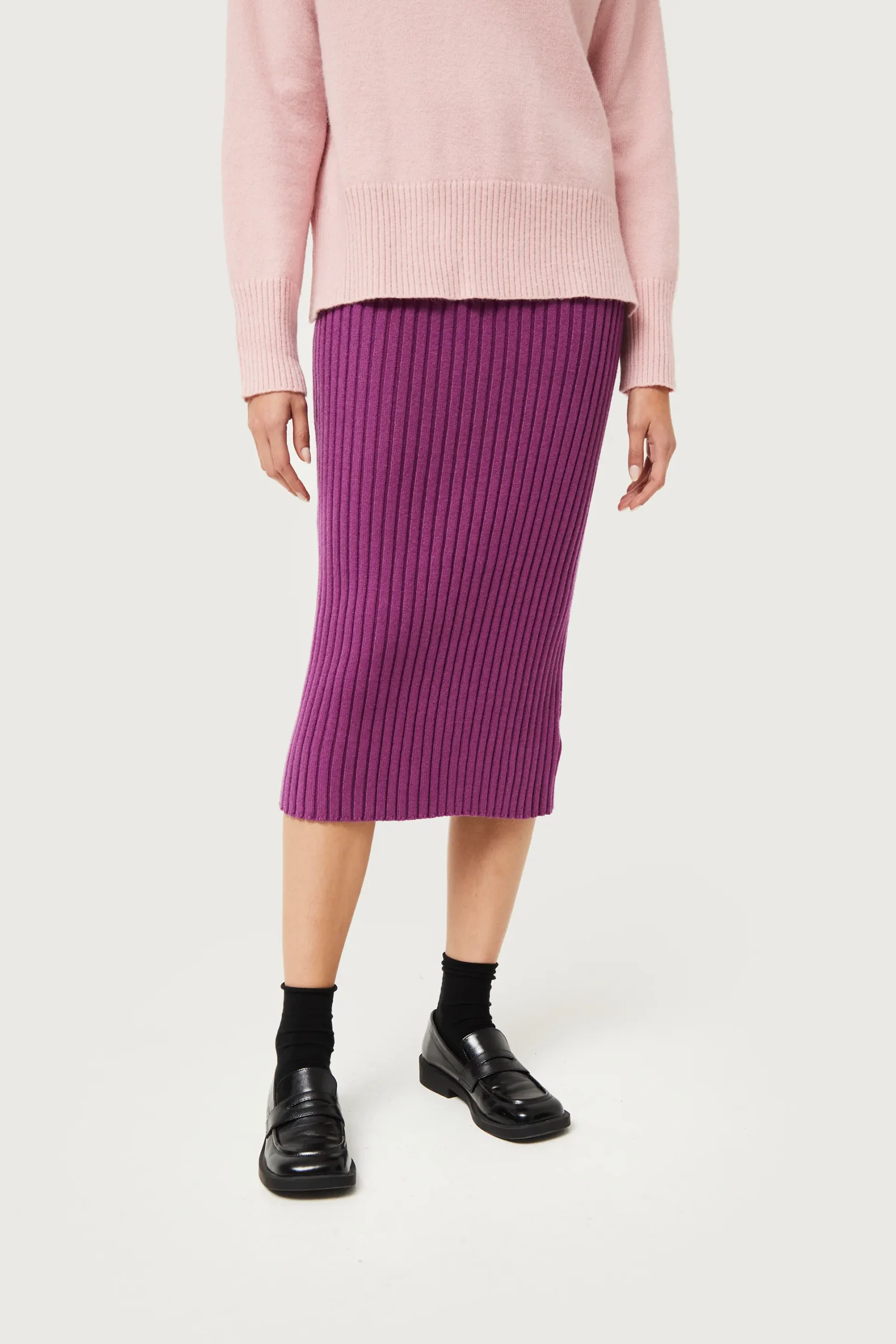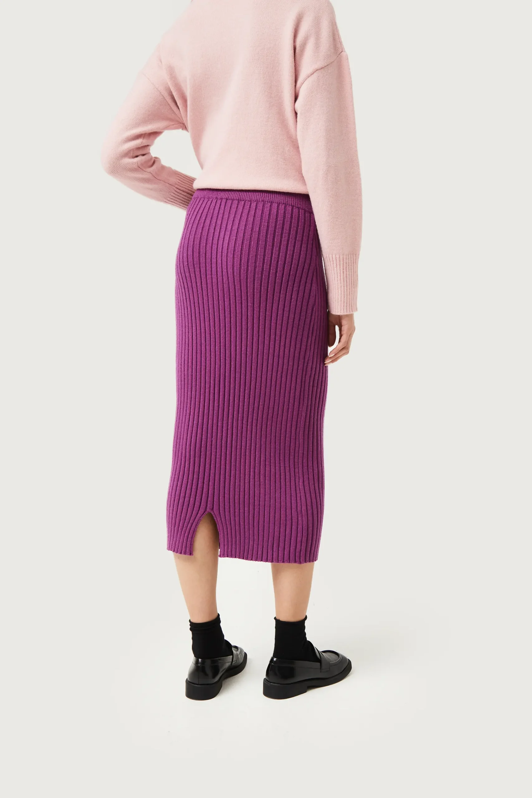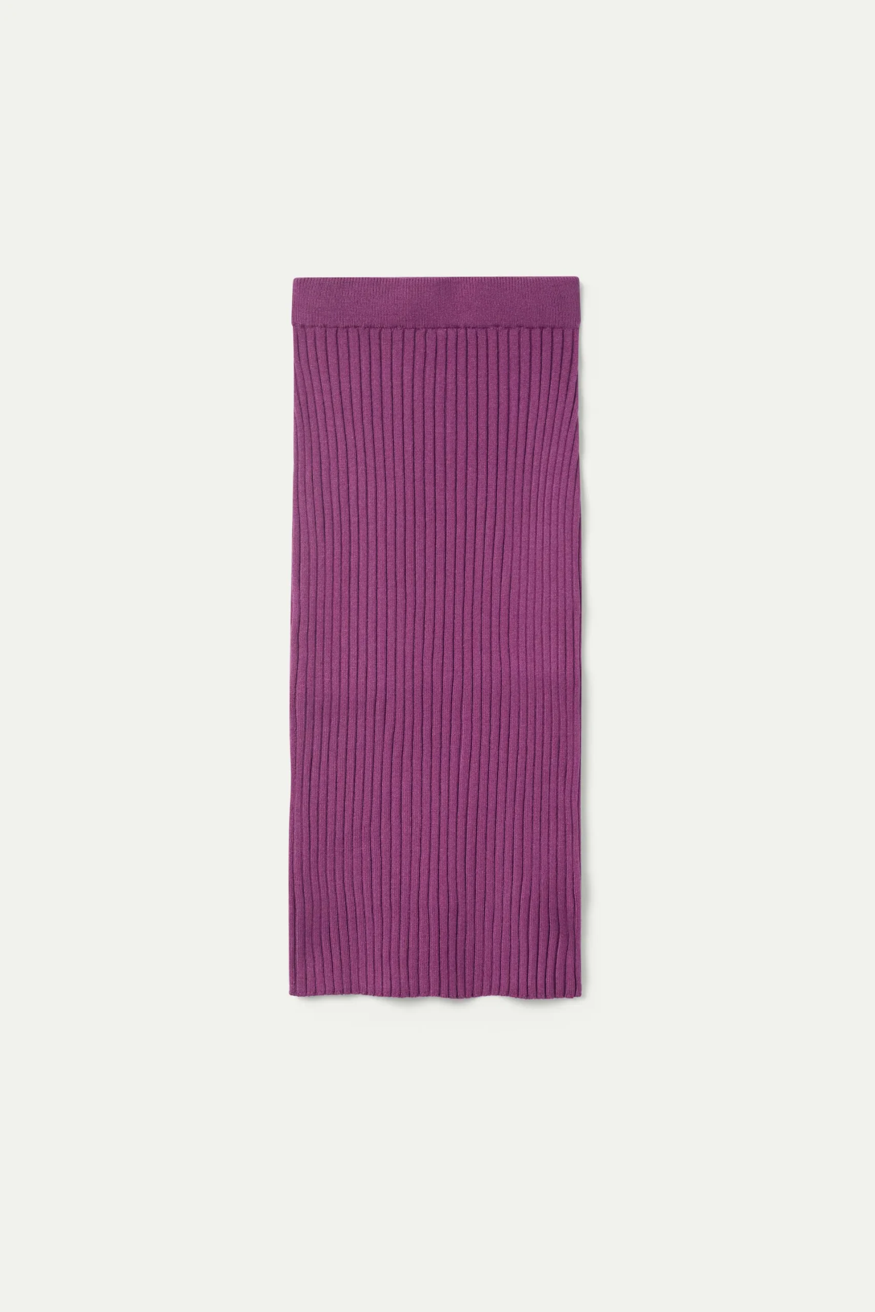 Falda midi de punto en canalé de color morado. Con cintura elástica y tiro medio. Detalle de abertura en la parte posterior. La modelo mide 176 cm y lleva la talla S.