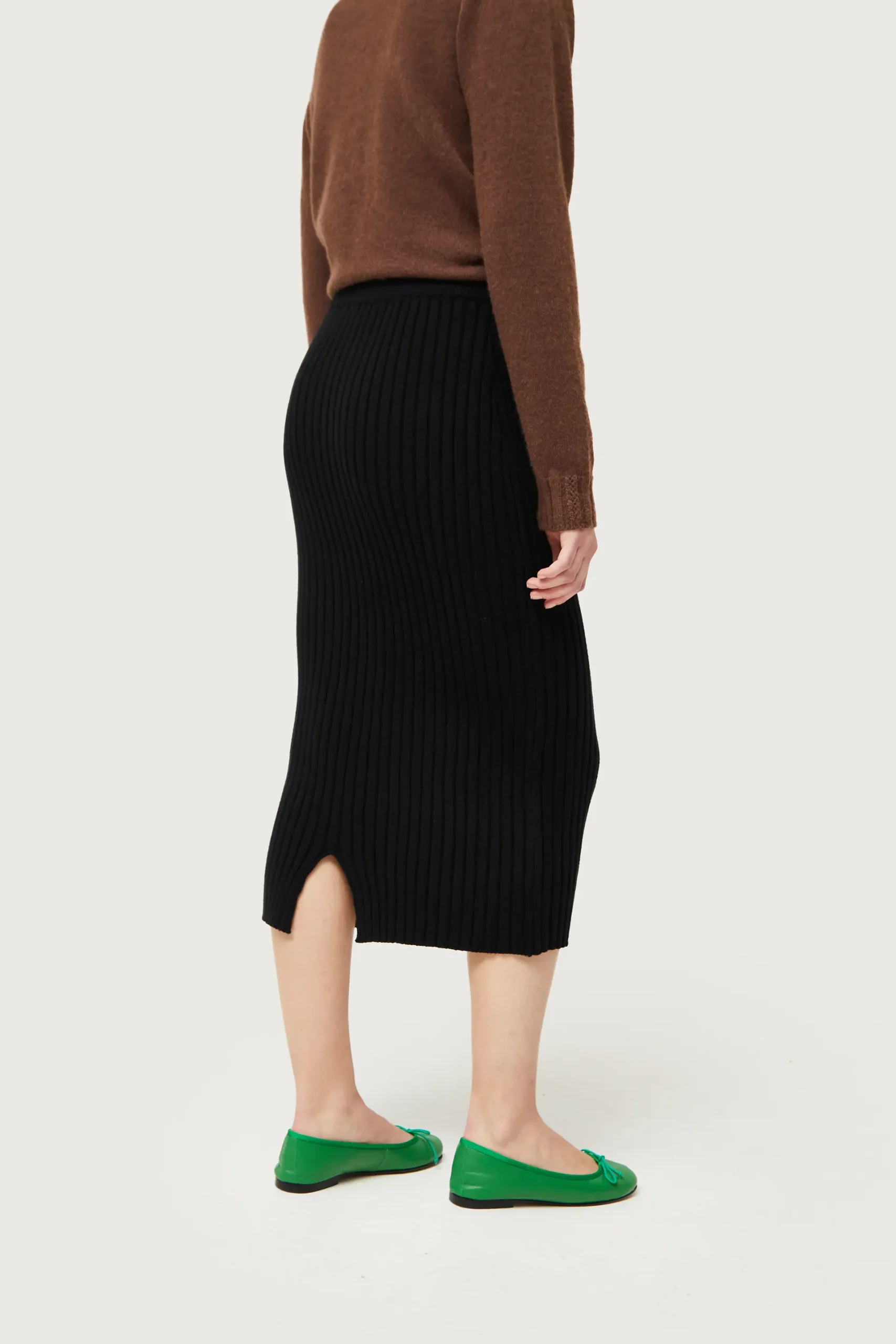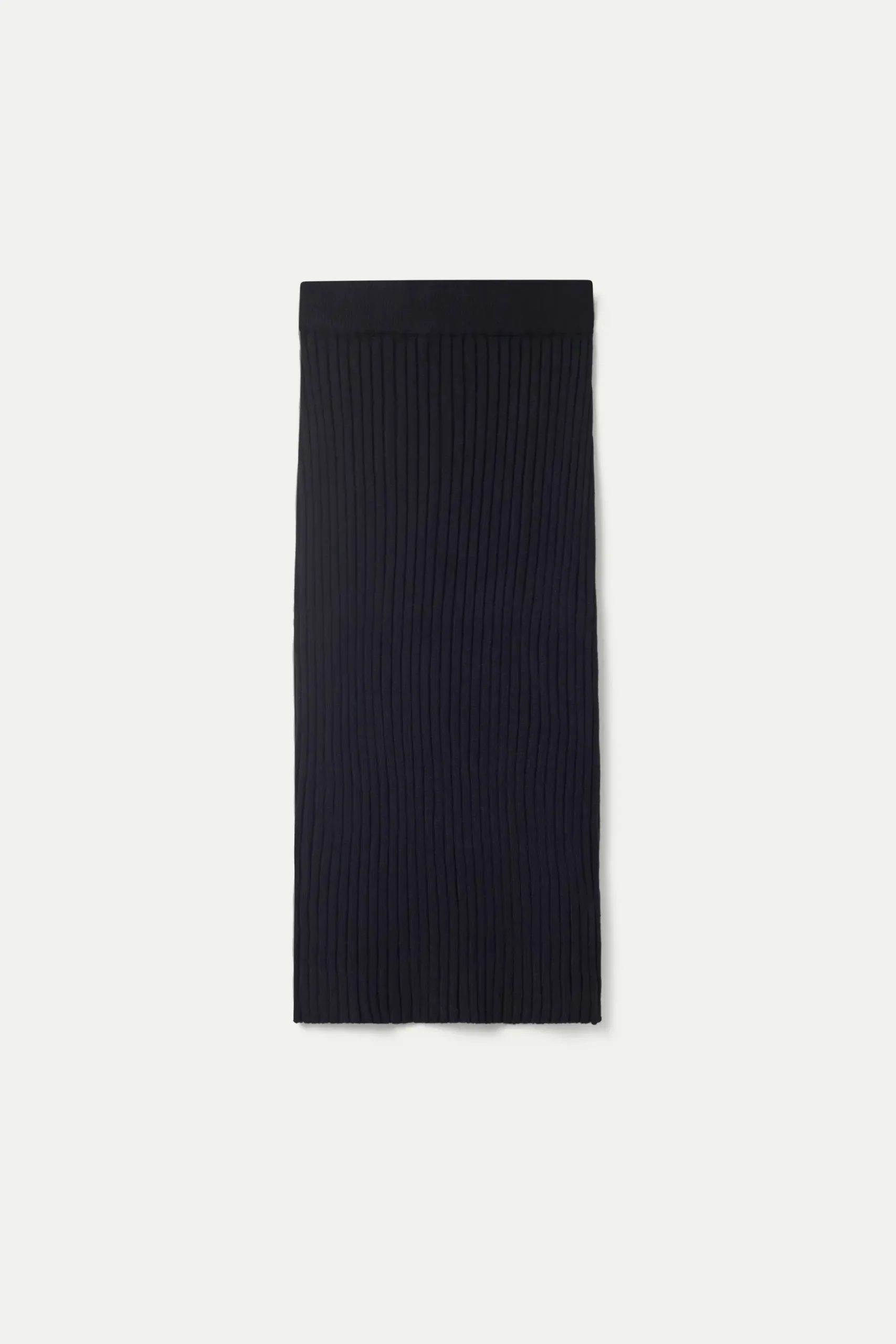 Falda midi de punto en canalé de color negro. Con cintura elástica y tiro medio. Detalle de abertura en la parte posterior. La modelo mide 175 cm y lleva la talla S.