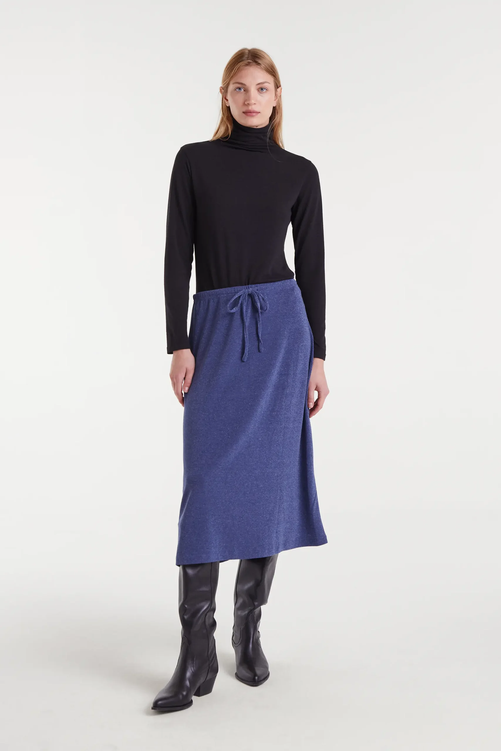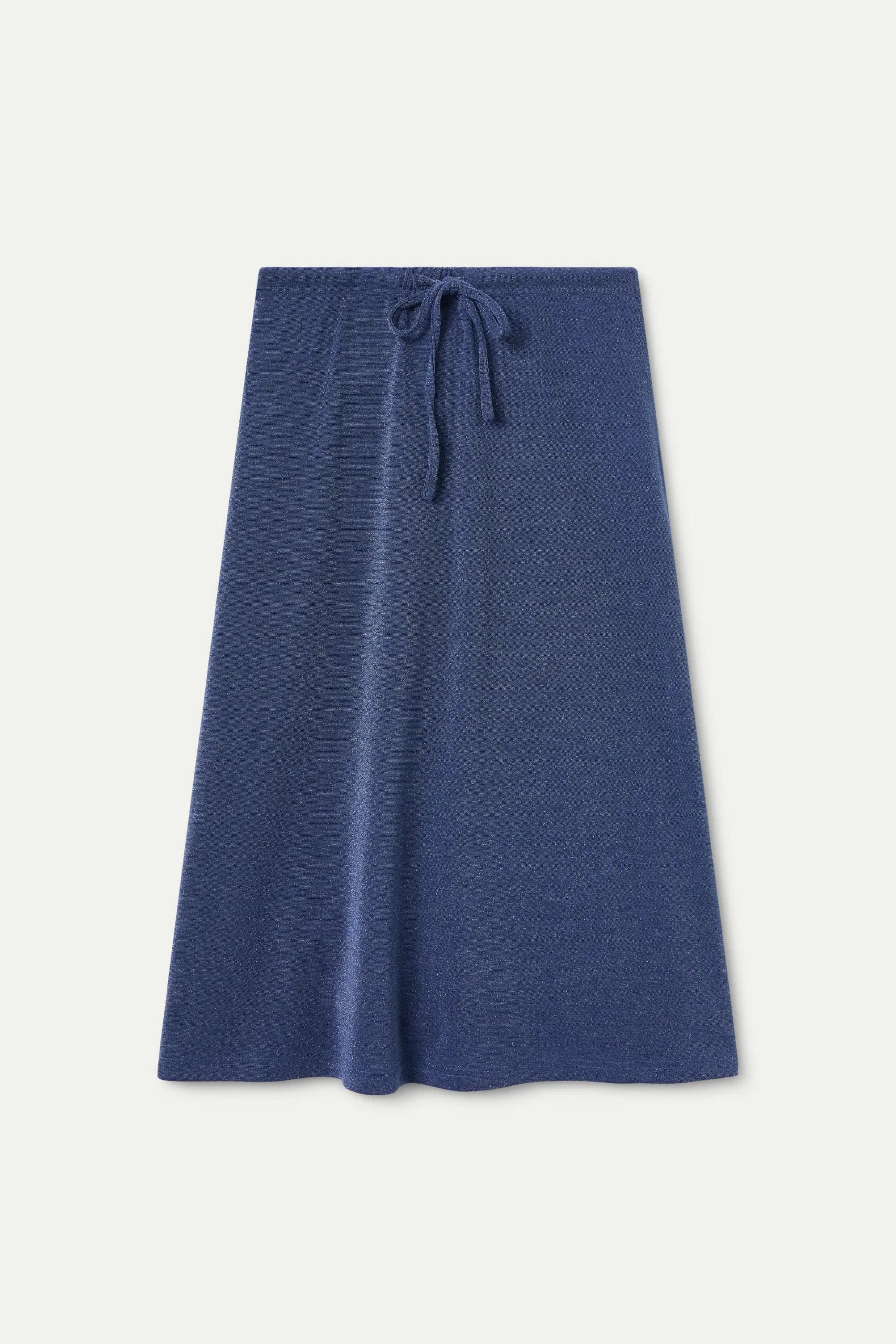 Falda midi de color navy blue. Con tejido jersey con lurex. Cintura fija tiro alto. La modelo mide 179 cm y lleva la talla S.