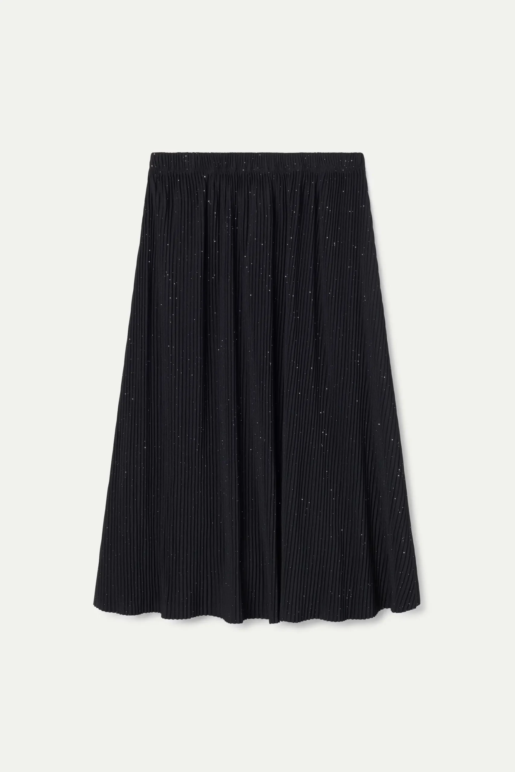 Falda midi de tejido crepé y lurex de color negro. Cintura fija alta elástica.