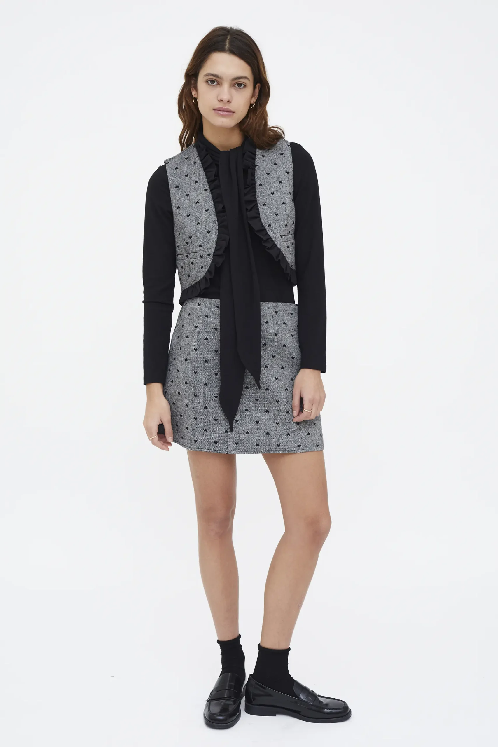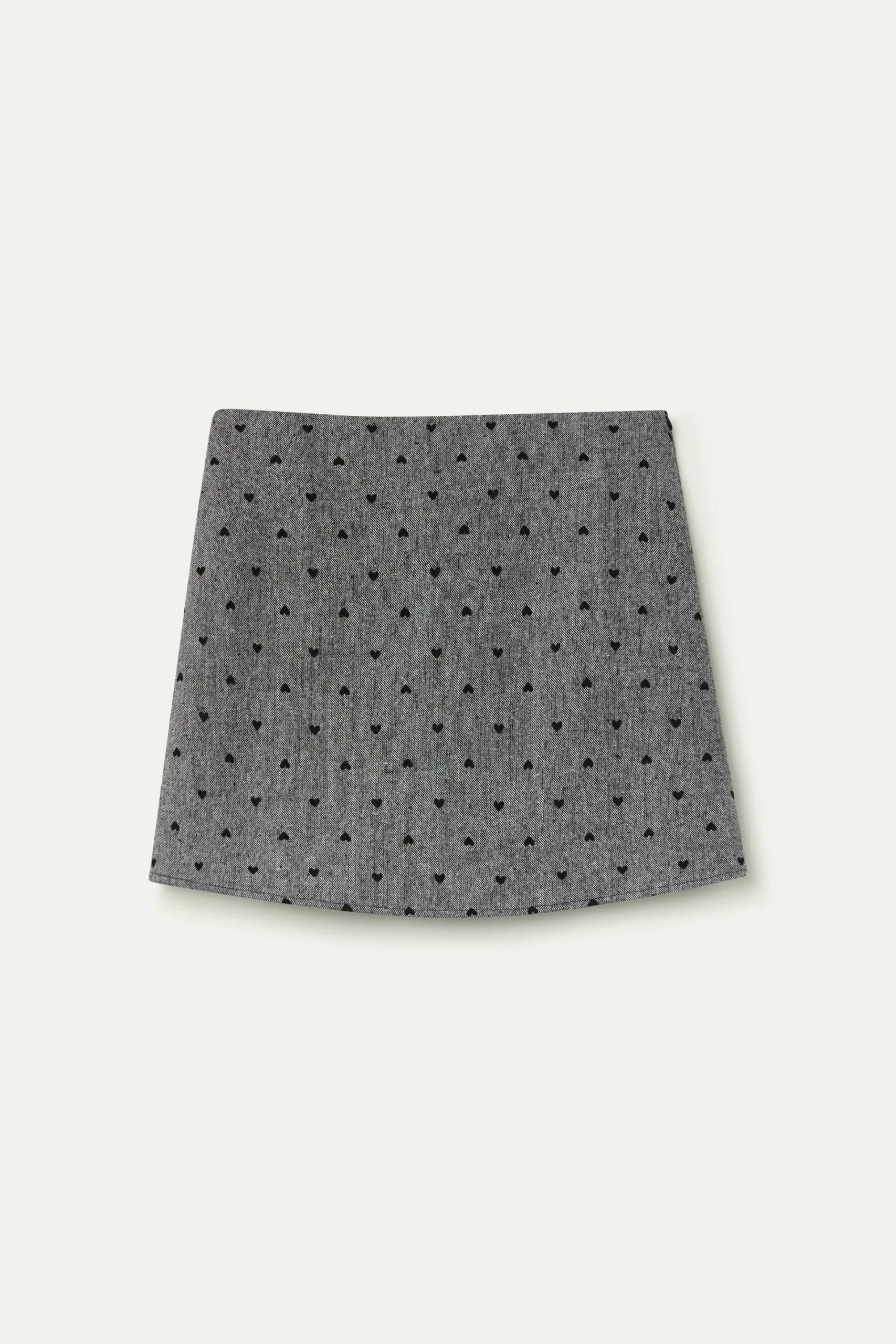 Falda de tejido tweed con estampado de corazones de color negro. Tiro fijo medio. Cierre con cremallera invisible lateral. La modelo mide 177 cm y lleva la talla S.