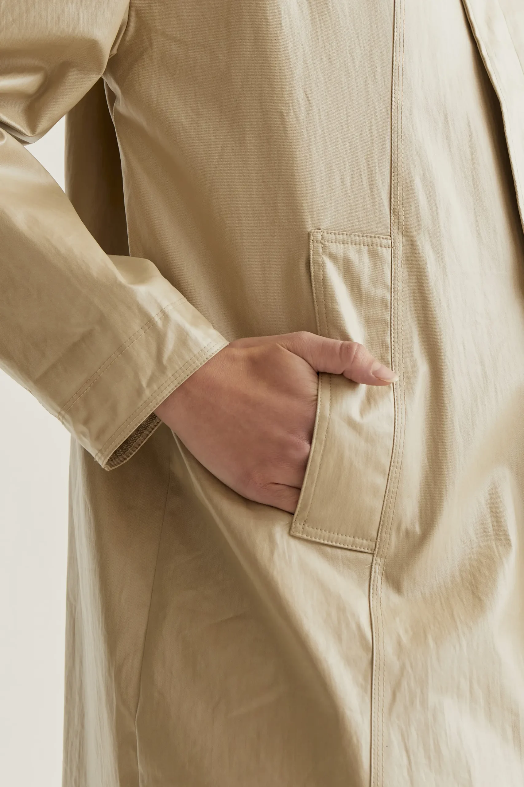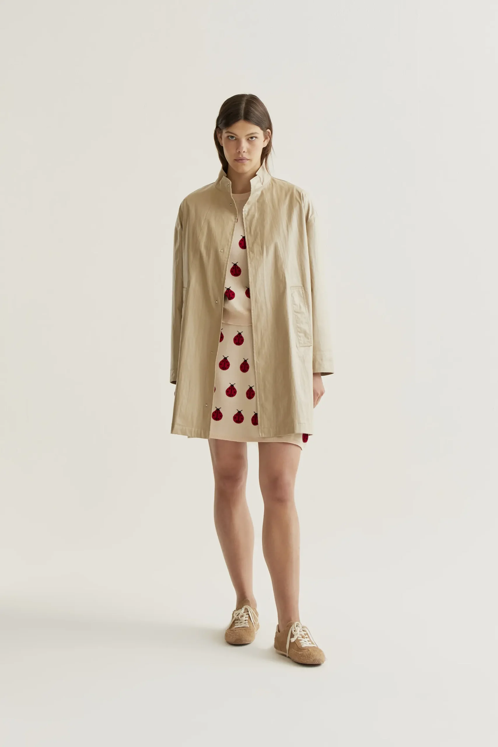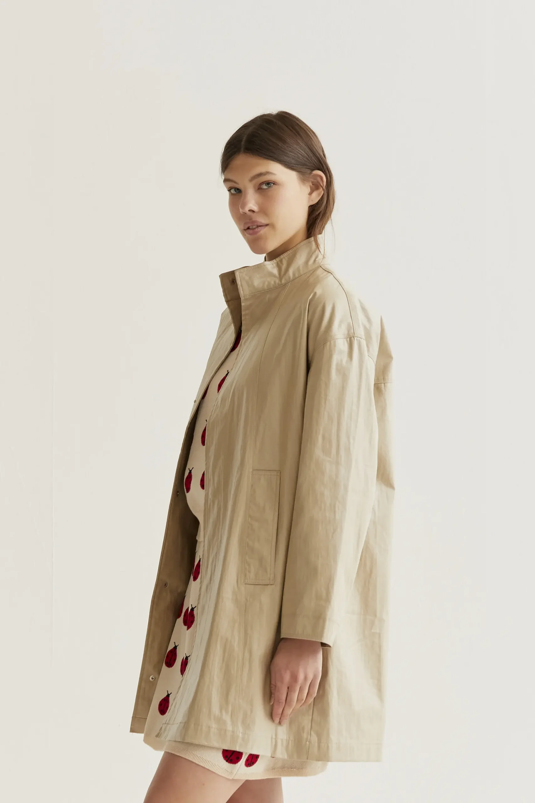 Gabardina de tejido 100% algodón de color beige. Cuello alto y manga larga. Hombro caído. Cierre frontal con botones a presión ocultos. Bolsillos laterales. Forro interior. La modelo mide 177 cm y lleva la talla S.