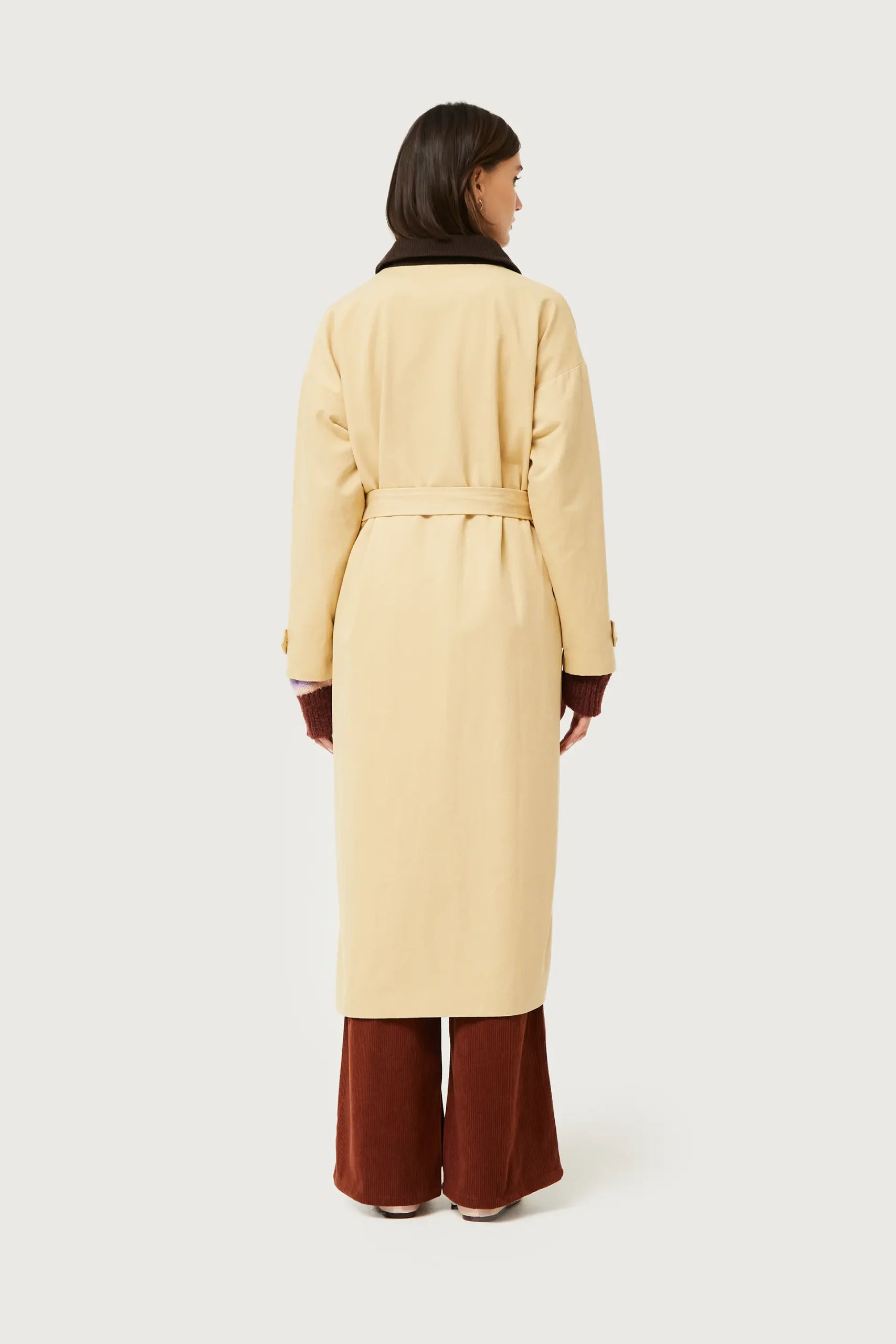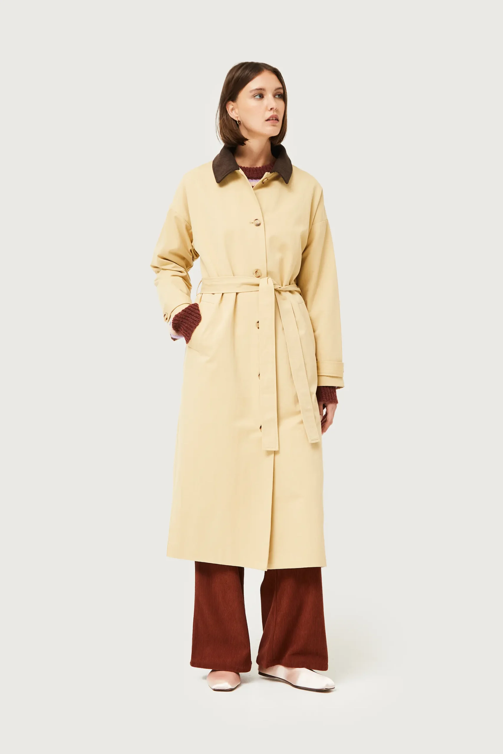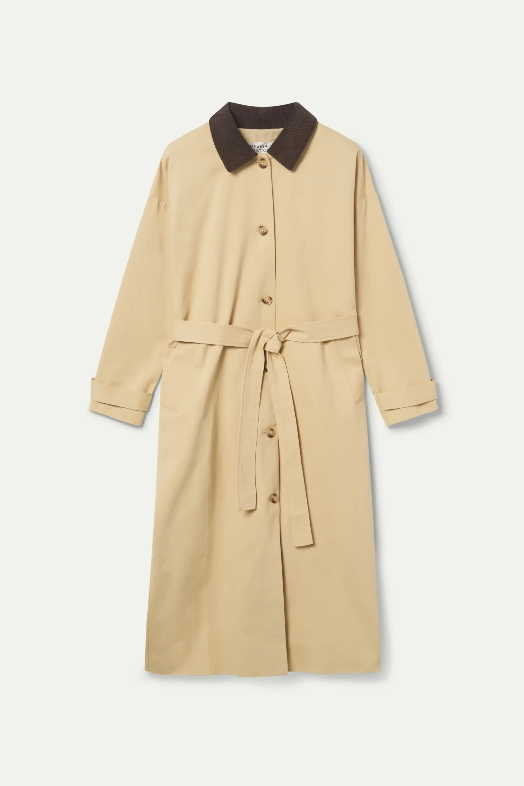 Gabardina midi en twill de color camel. Con cuello solapa de pana marrón y manga larga. Cierre frontal con botones y cinturón ajustable. Bolsillos laterales. Forro interior. La modelo mide 176 cm y lleva la talla S.