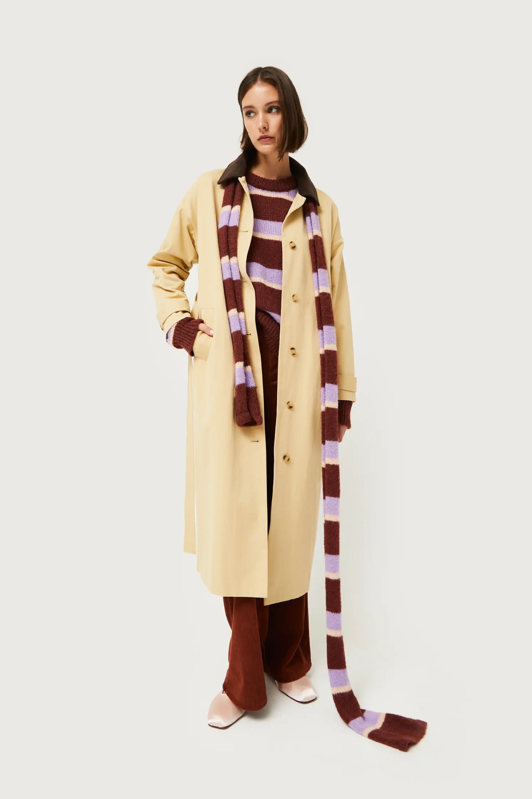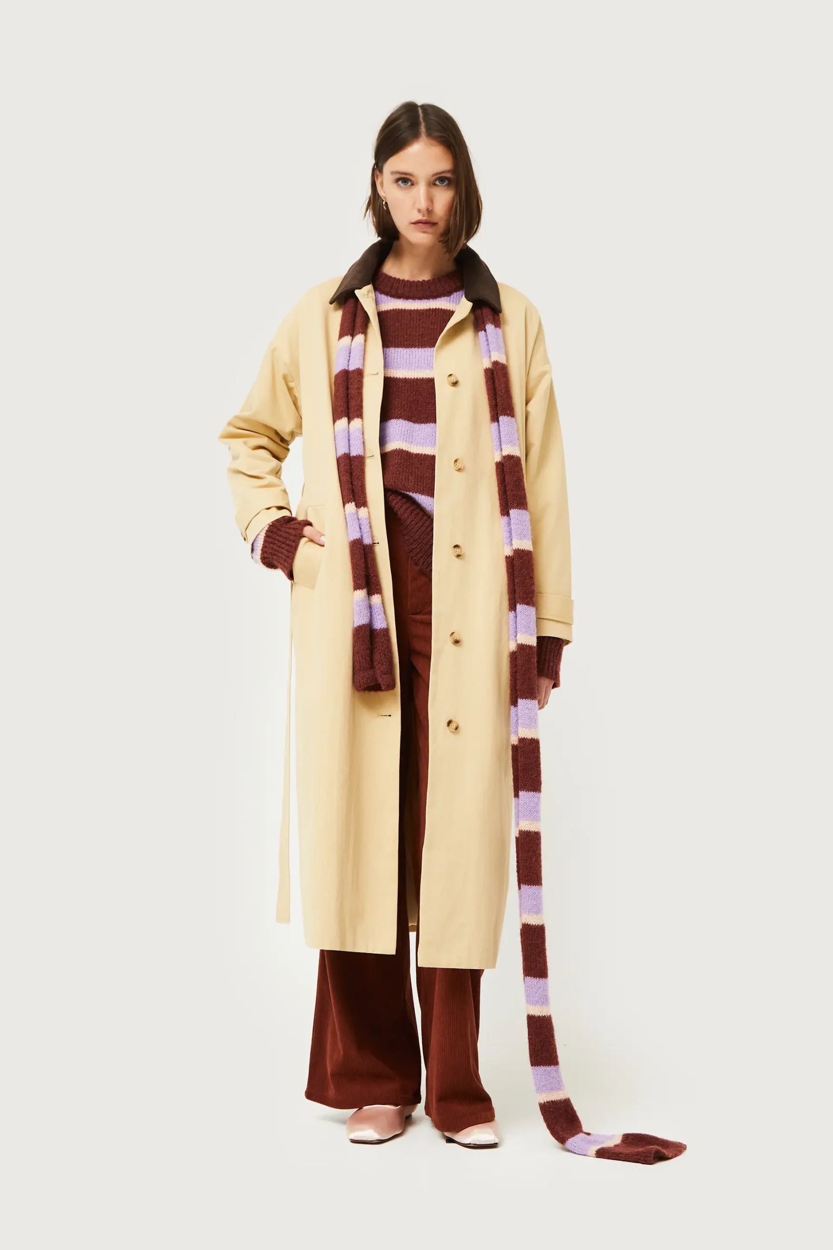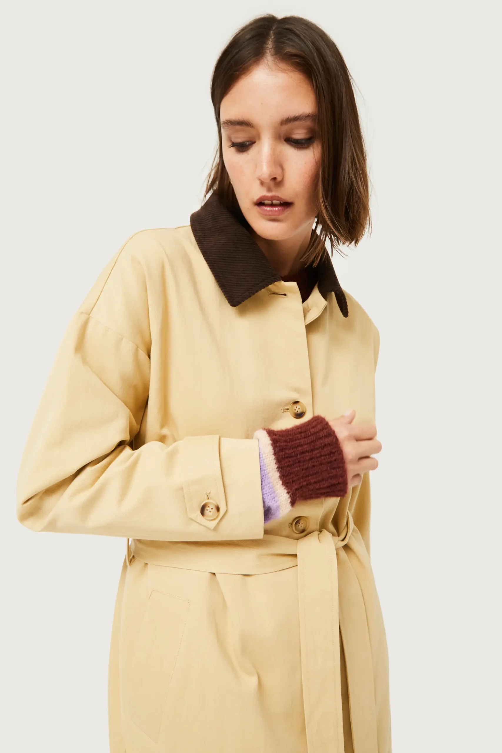 Gabardina midi en twill de color camel. Con cuello solapa de pana marrón y manga larga. Cierre frontal con botones y cinturón ajustable. Bolsillos laterales. Forro interior. La modelo mide 176 cm y lleva la talla S.