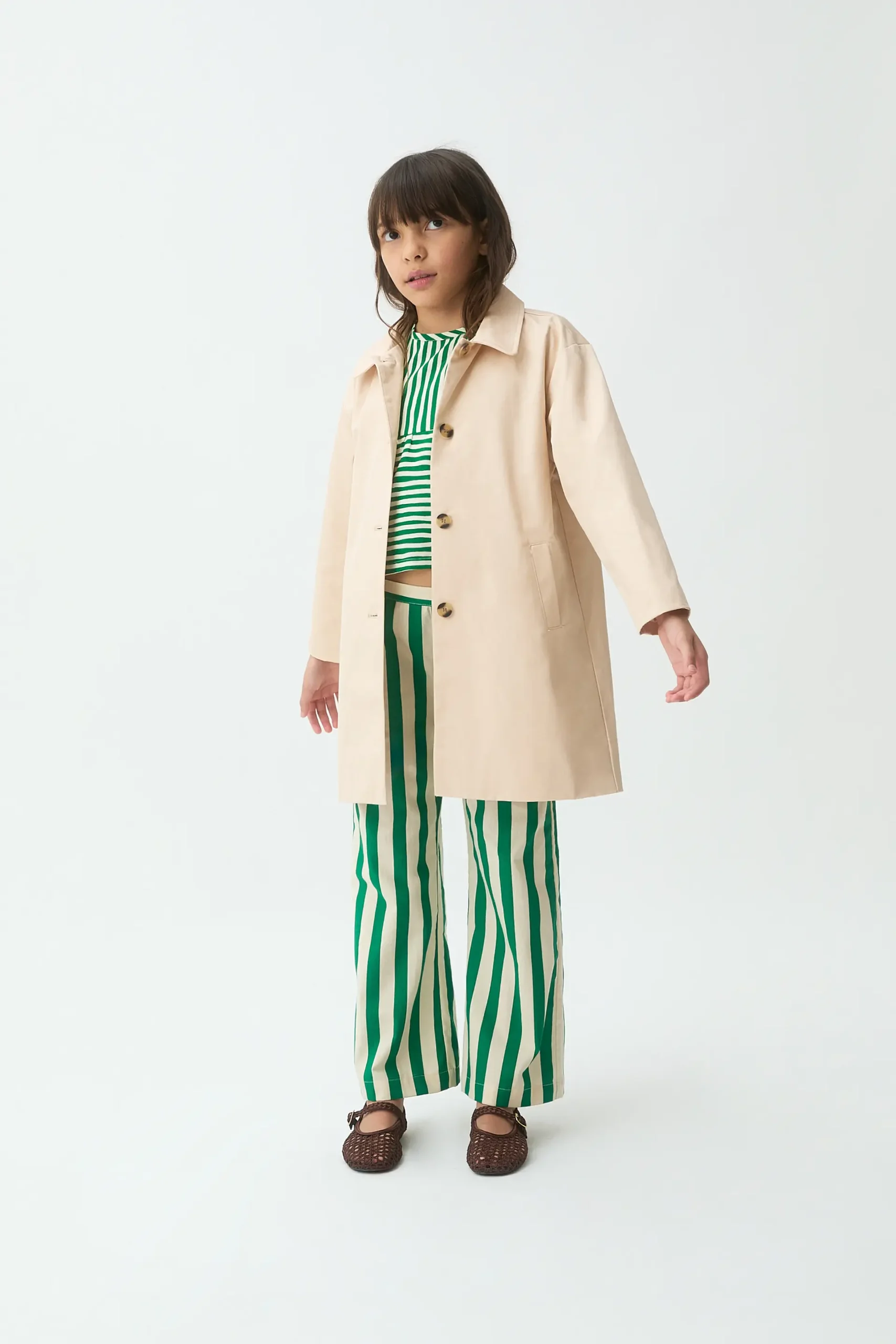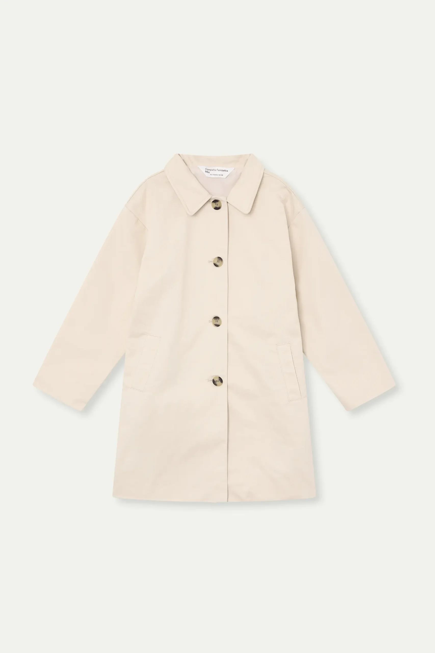 Gabardina de niña de tejido 100% algodón con print de tulipán. Cuello solapa y manga larga. Cierre frontal con botones bicolor marrón y beige. Bolsillos laterales funcionales. Forro interior. La modelo mide 136 cm y lleva la talla 8-9 años.