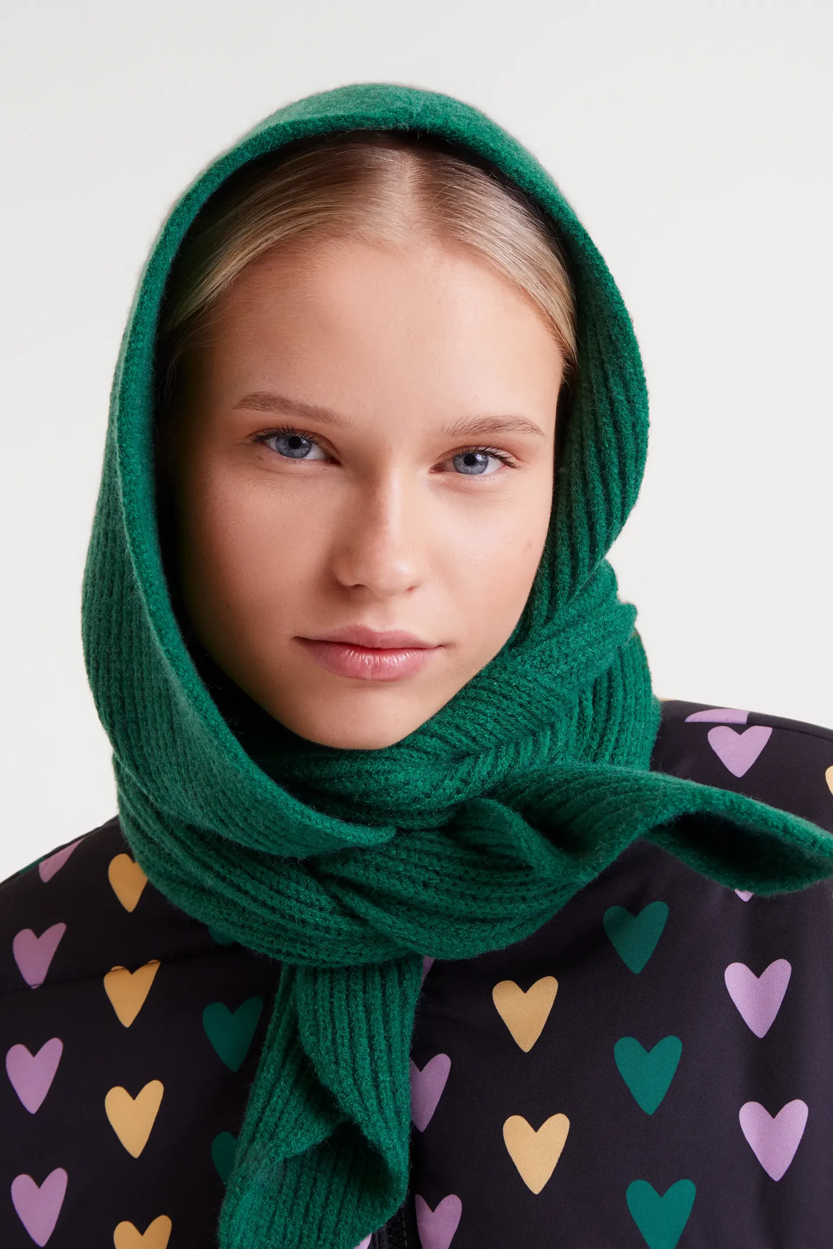 Gorro beanie de color verde con tejido punto fino terminada con bufanda. Talla única.
