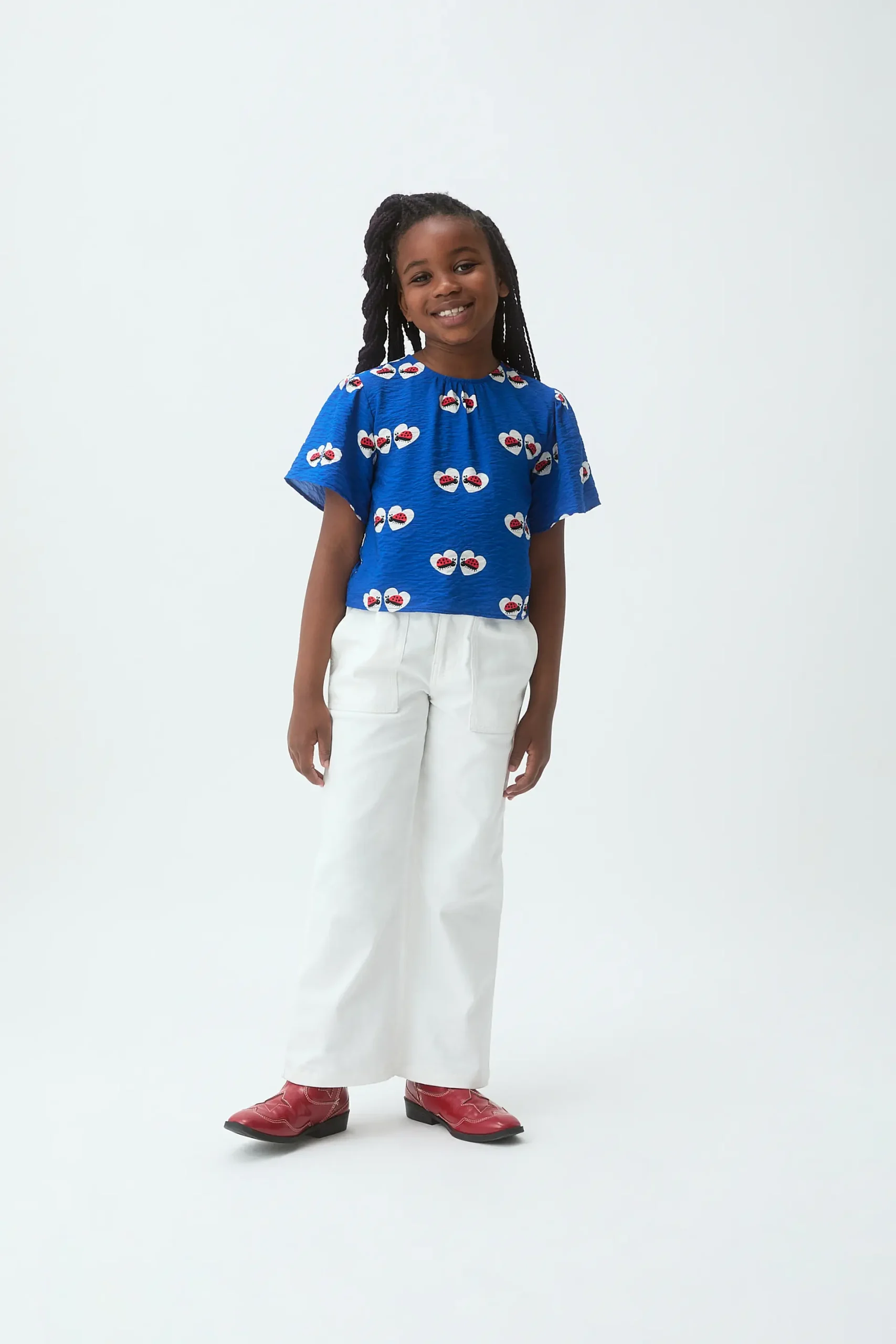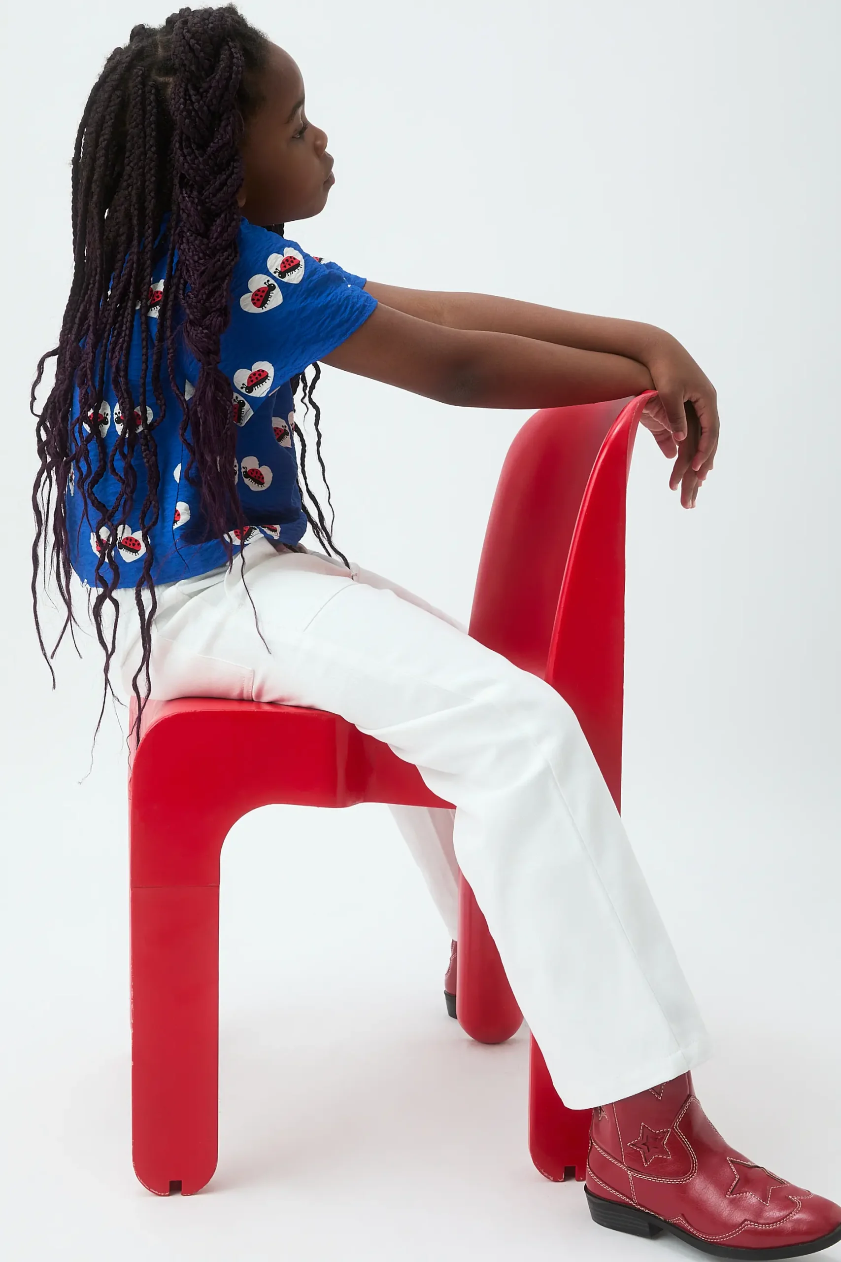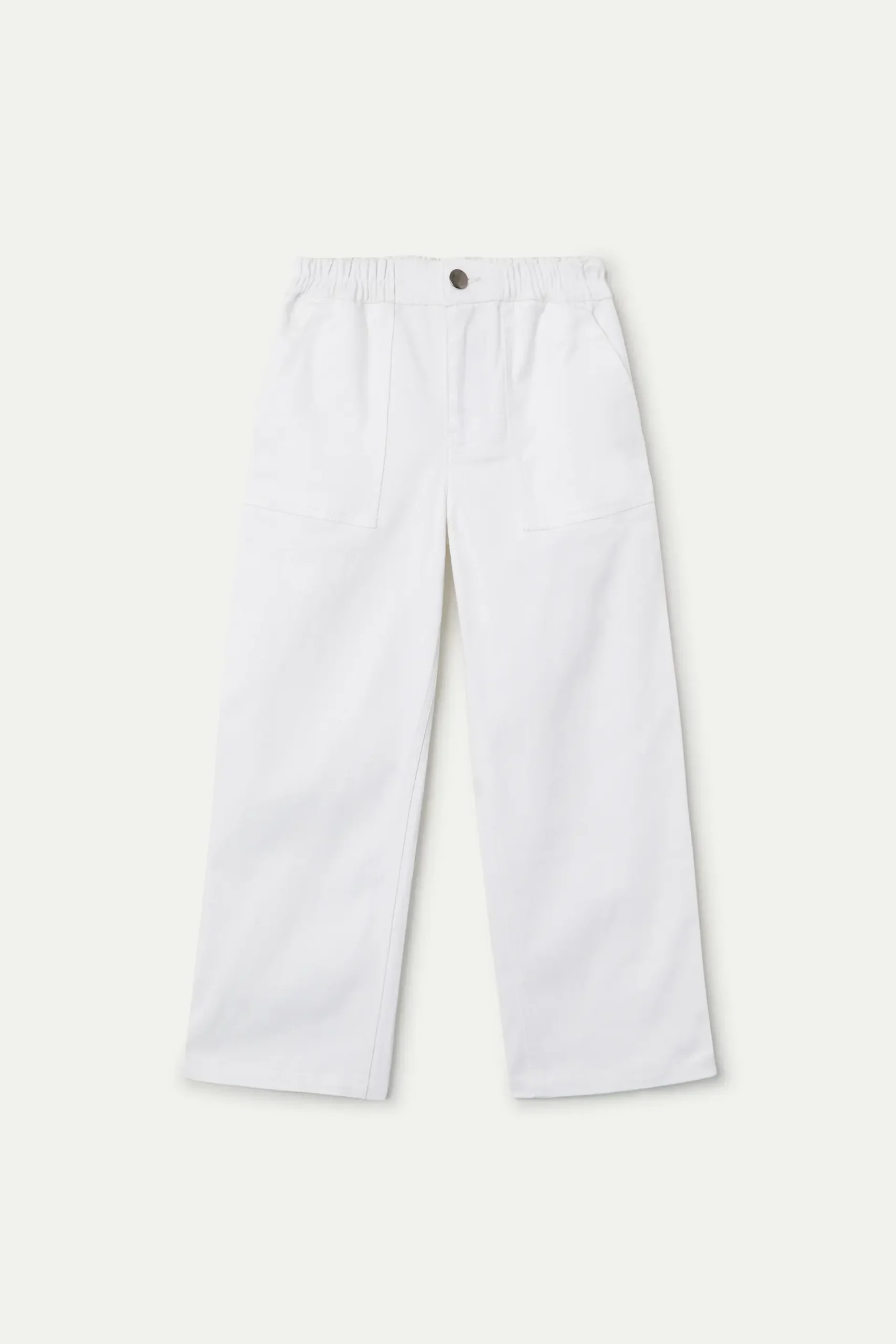 Jeans de niña con tejido denim de color blanco. Cintura fija elástica de tiro alto. Cierre frontal con cremallera y botón. Pernera recta. Bolsillos laterales y traseros. La modelo mide 133 cm y lleva la talla 8-9 años.