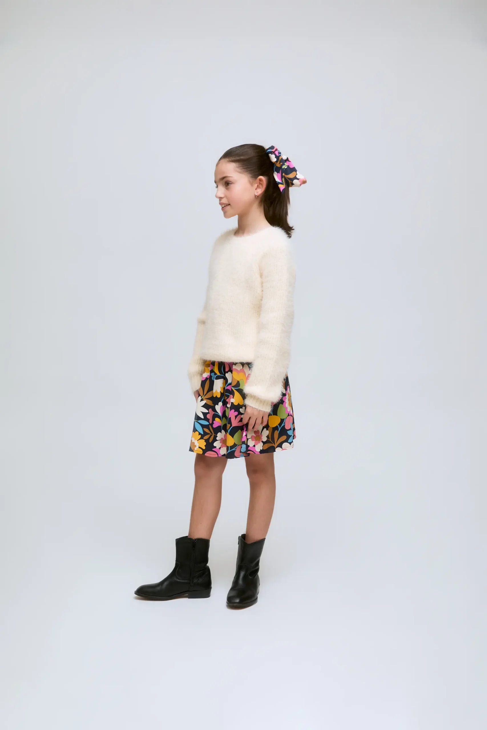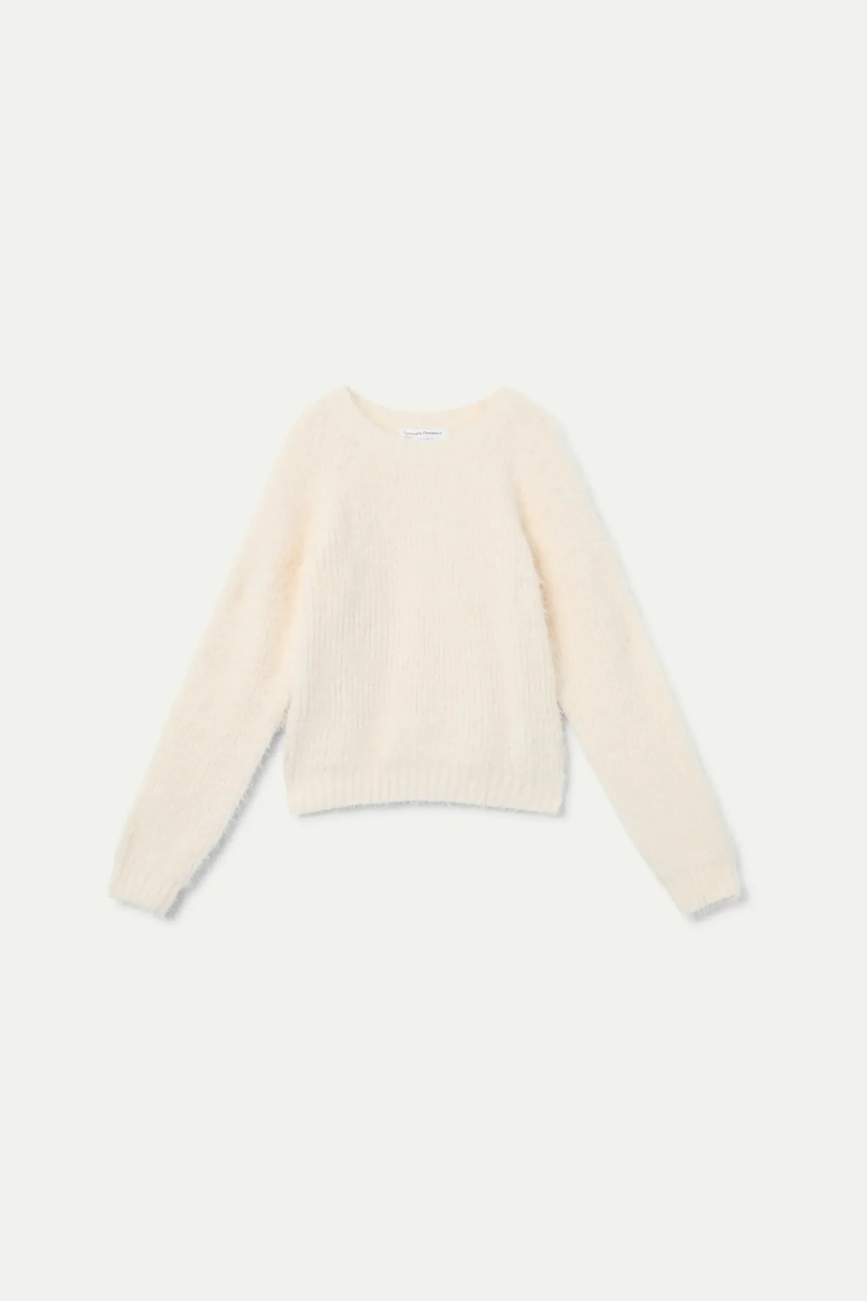 Jersey de niña en color blanco. Diseño clásico de punto con cuello redondo y manga larga